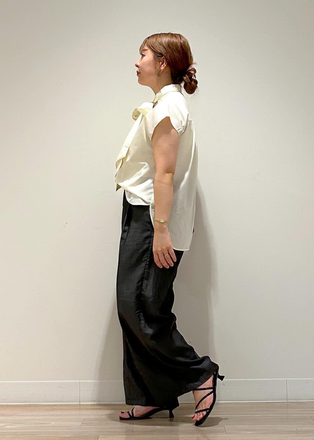 ガーリーな印象になりがちなリボンタイブラウスを、ブラックのワイドパンツで合わせ、カジュアルダウンさせたコーディネートです。サンダルやカバンもブラックで統一し、落ち着いた印象の大人カジュアルコーディネートです。