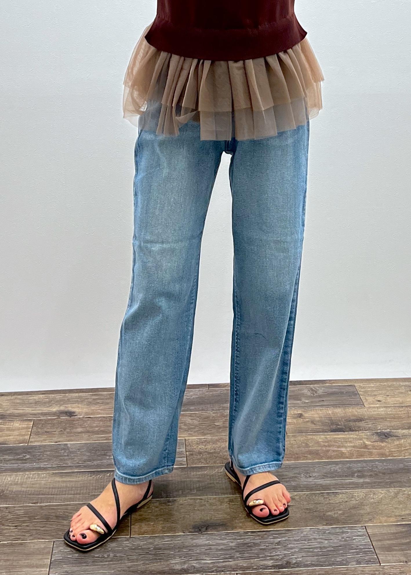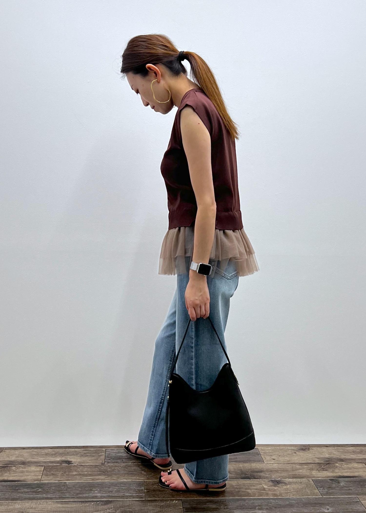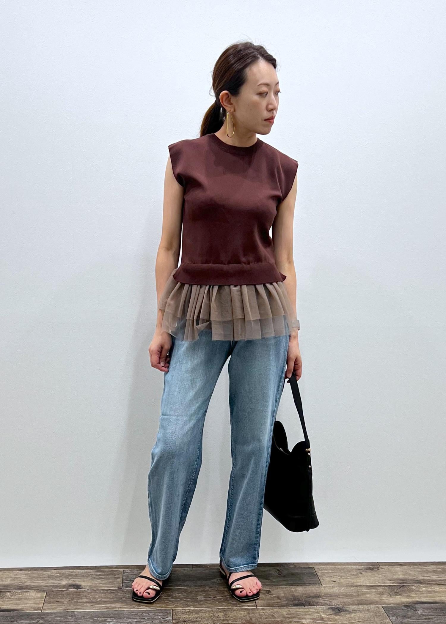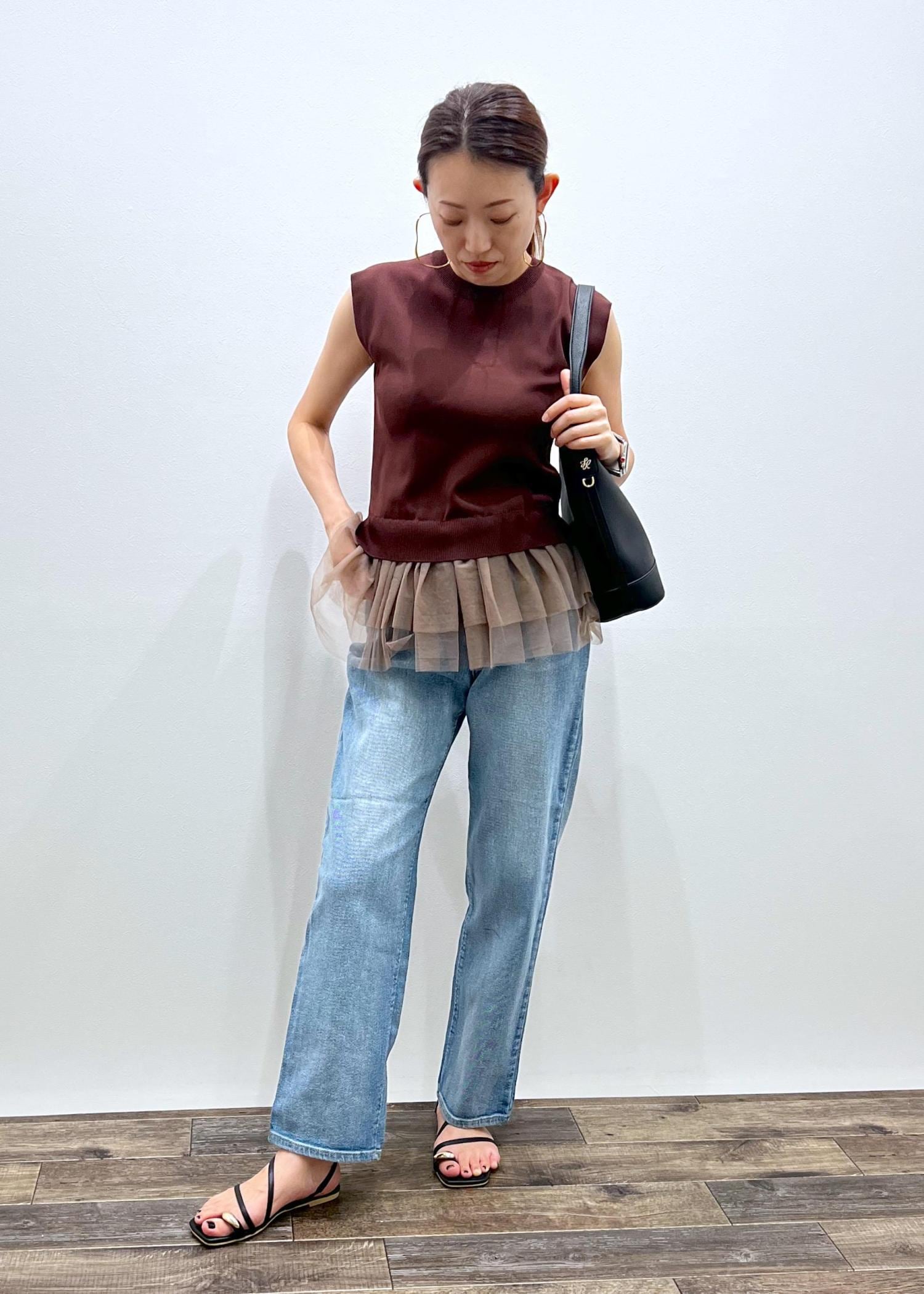 ブラウンの落ち着いたカラーにデニム合わせでカジュアルにまとめつつ、ウエストのフリルが華やかさを出してくれます。