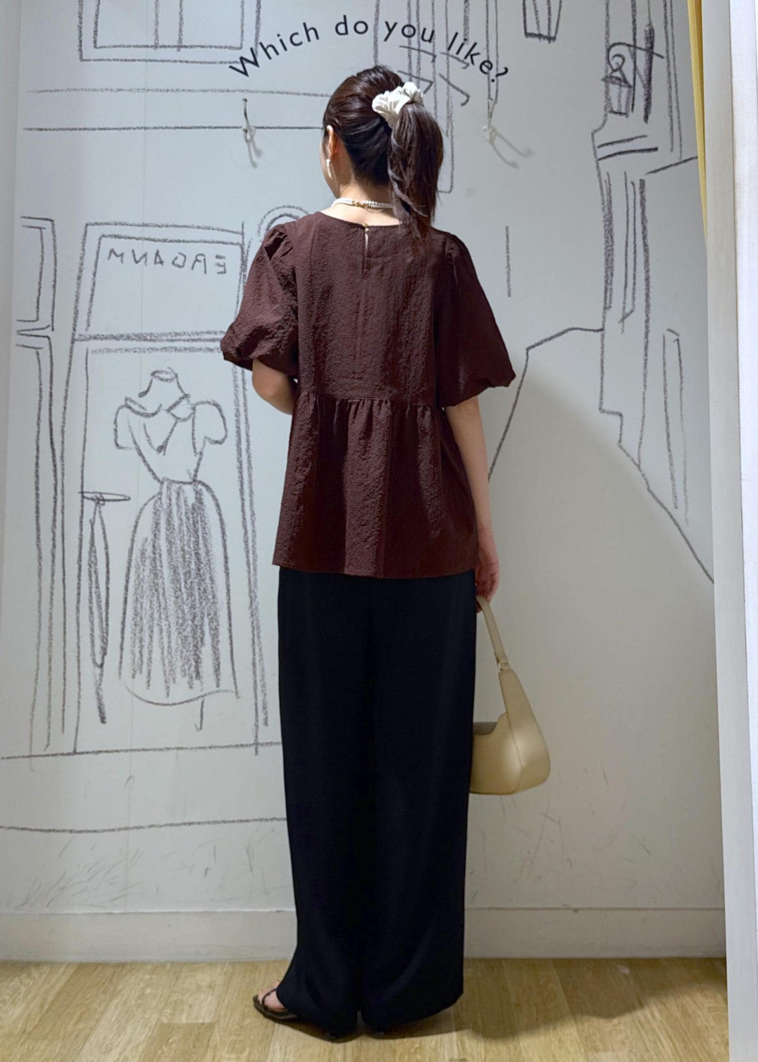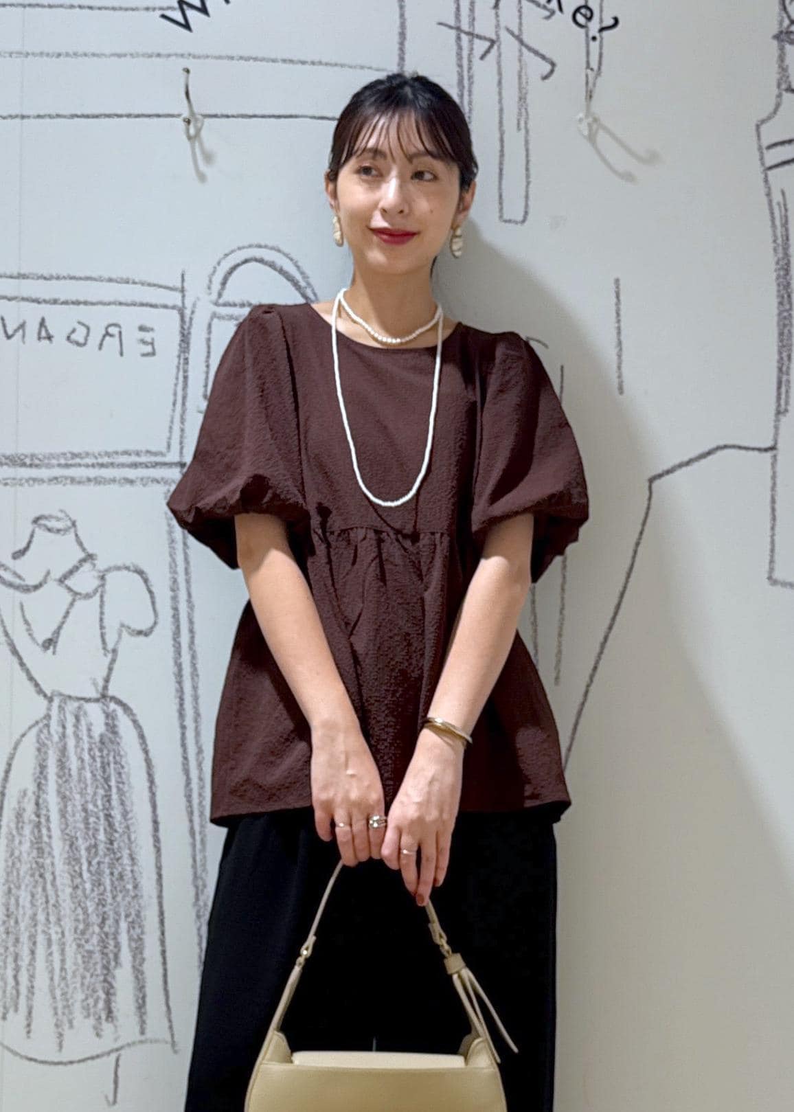 ROPÉ PICNICバルーンペプラムブラウスダークブラウン / 38¥2,250レビューふんわりと柔らかなシルエットがフェミニンな1枚。今から秋まで長く着られるのが嬉しいポイント。二の腕・お尻がほぼほぼ隠れる丈感です。凹凸のある生地で着映え抜群◎