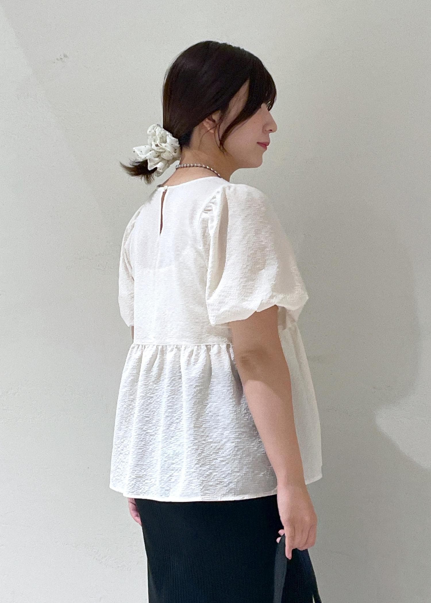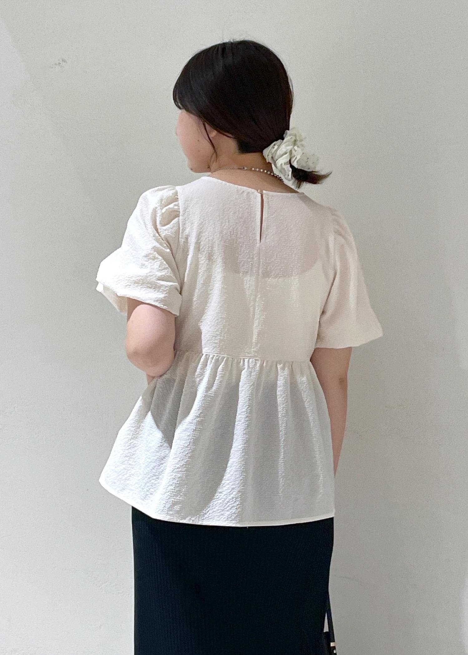フェミニンなぷりぷりブラウスは黒スカートで大人っぽく仕上げ、髪の毛はシュシュでまとめて可愛さを。