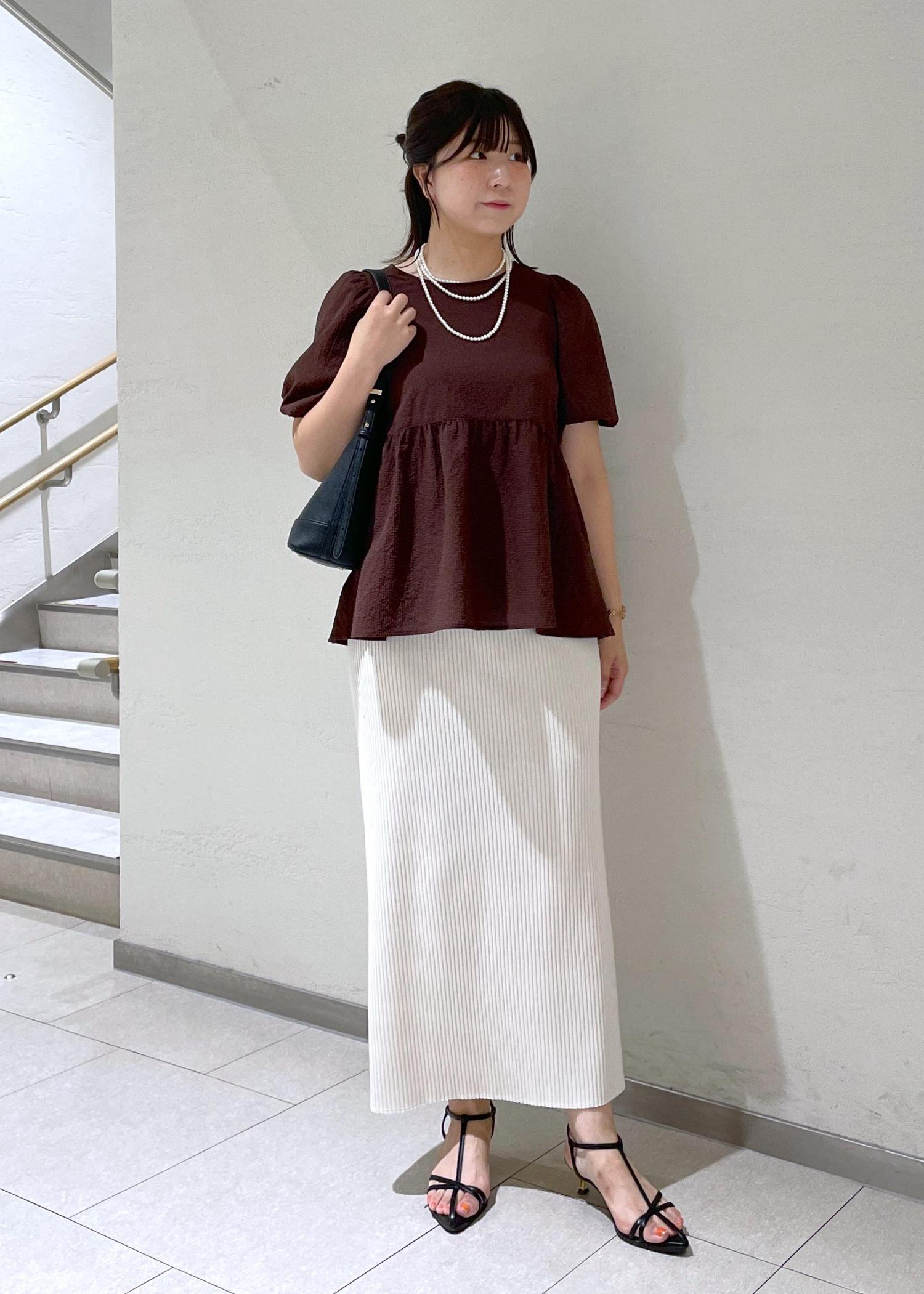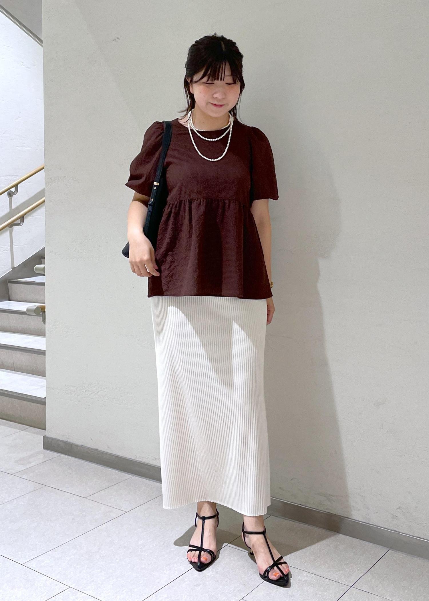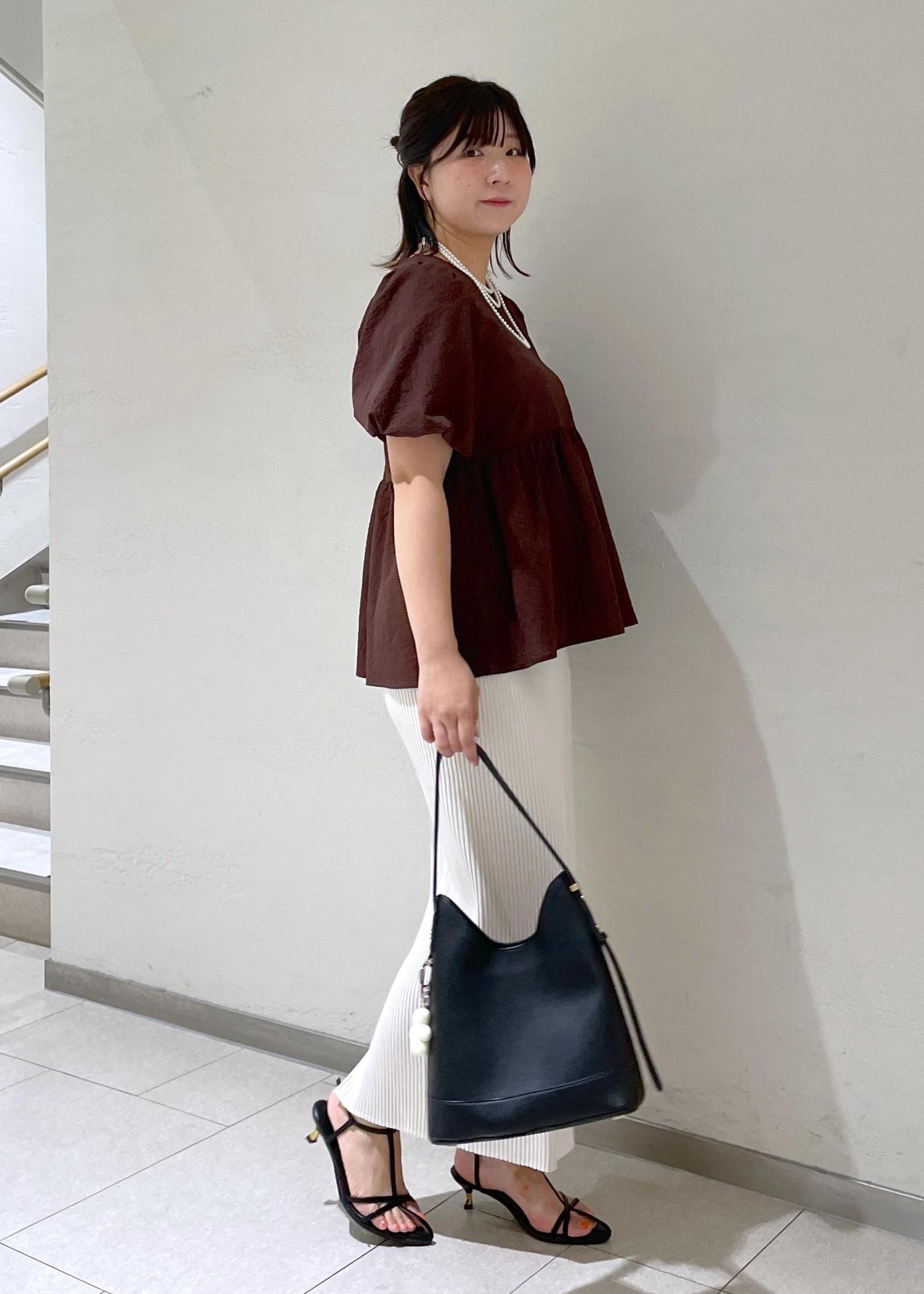 甘めなブラウスですが、ブラウンカラーで大人っぽく。