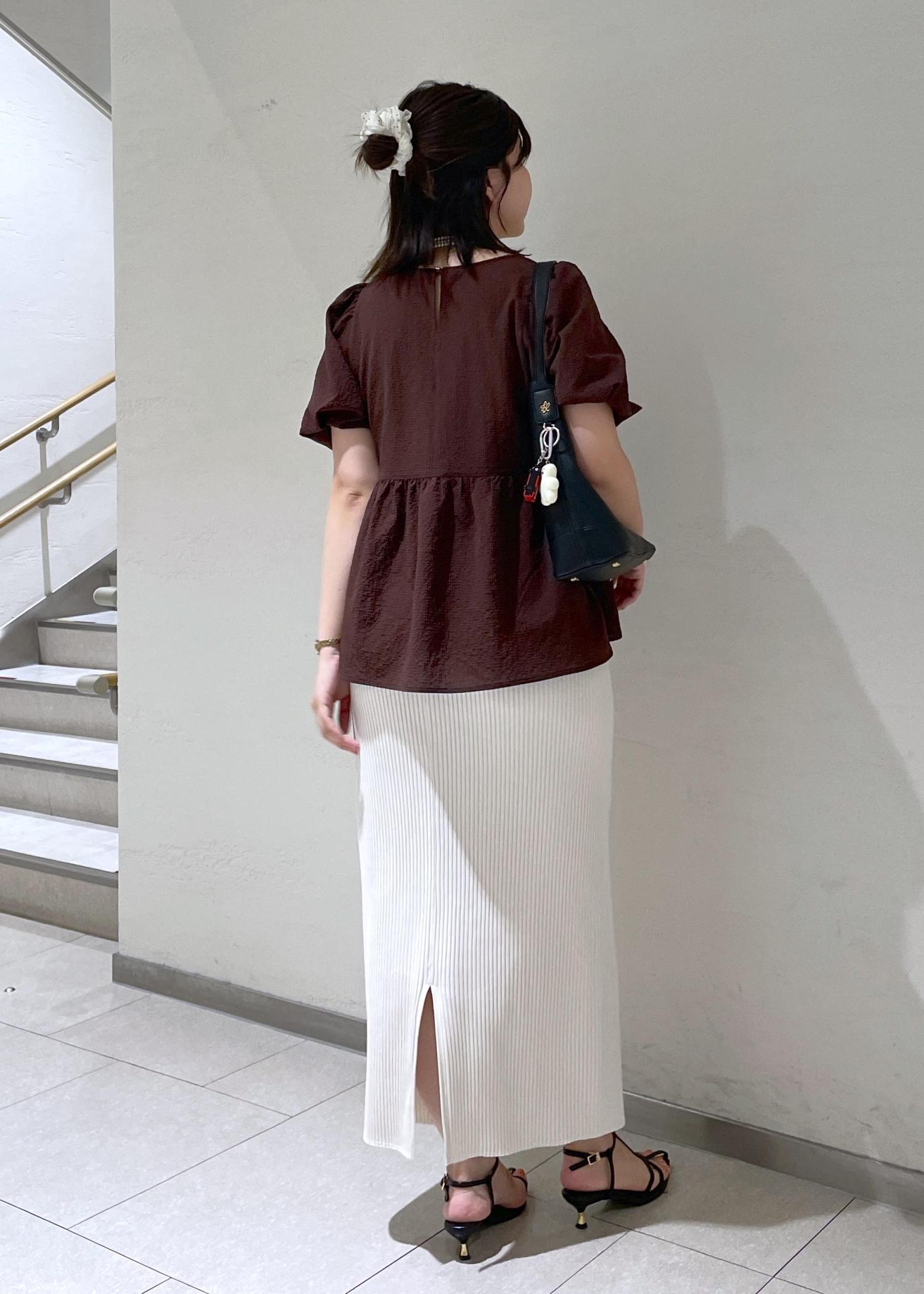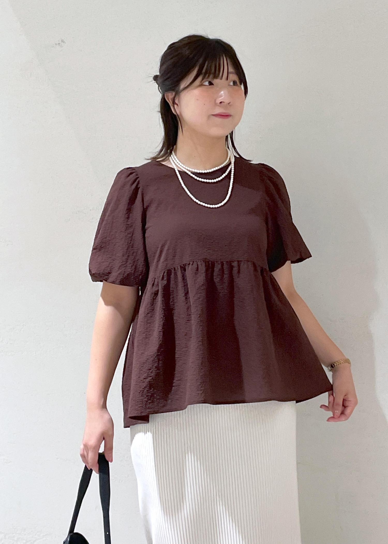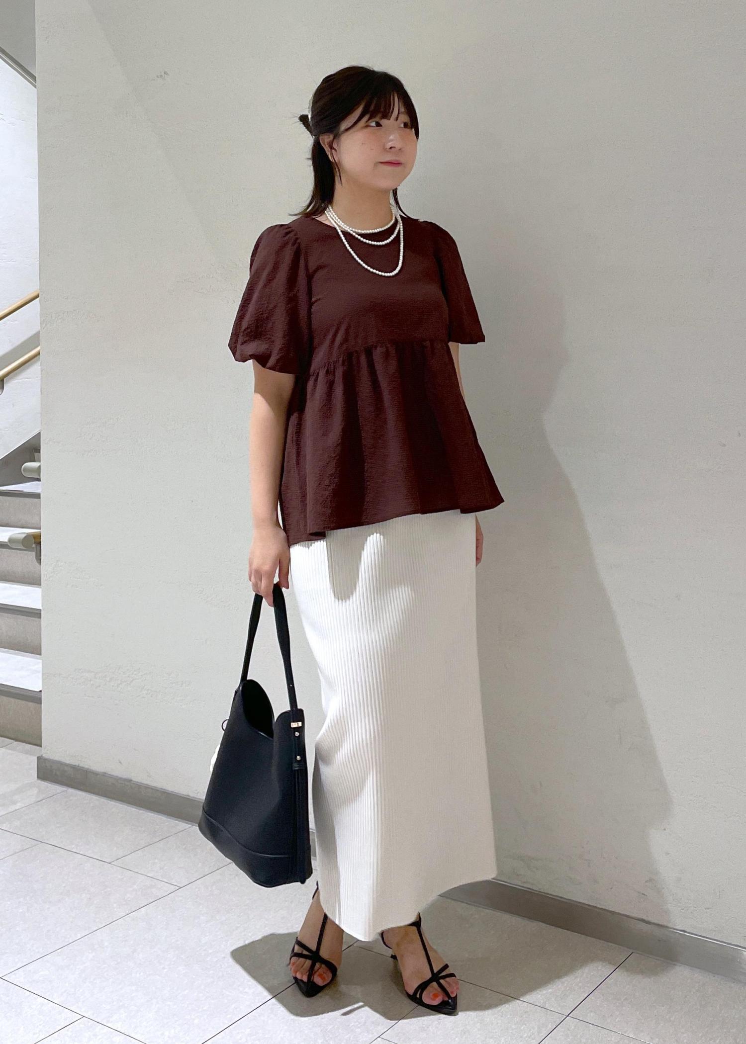 甘めなブラウスですが、ブラウンカラーで大人っぽく。