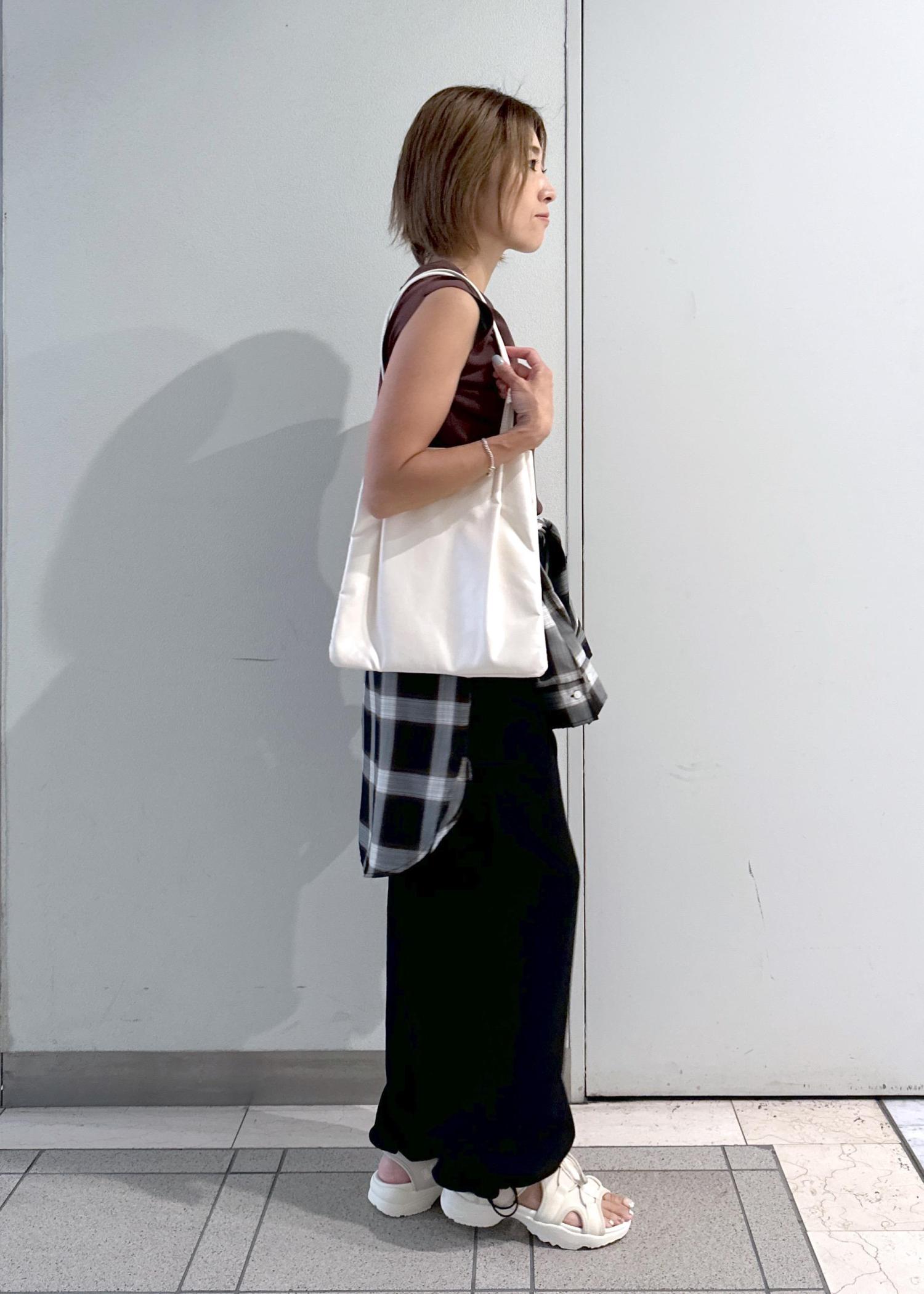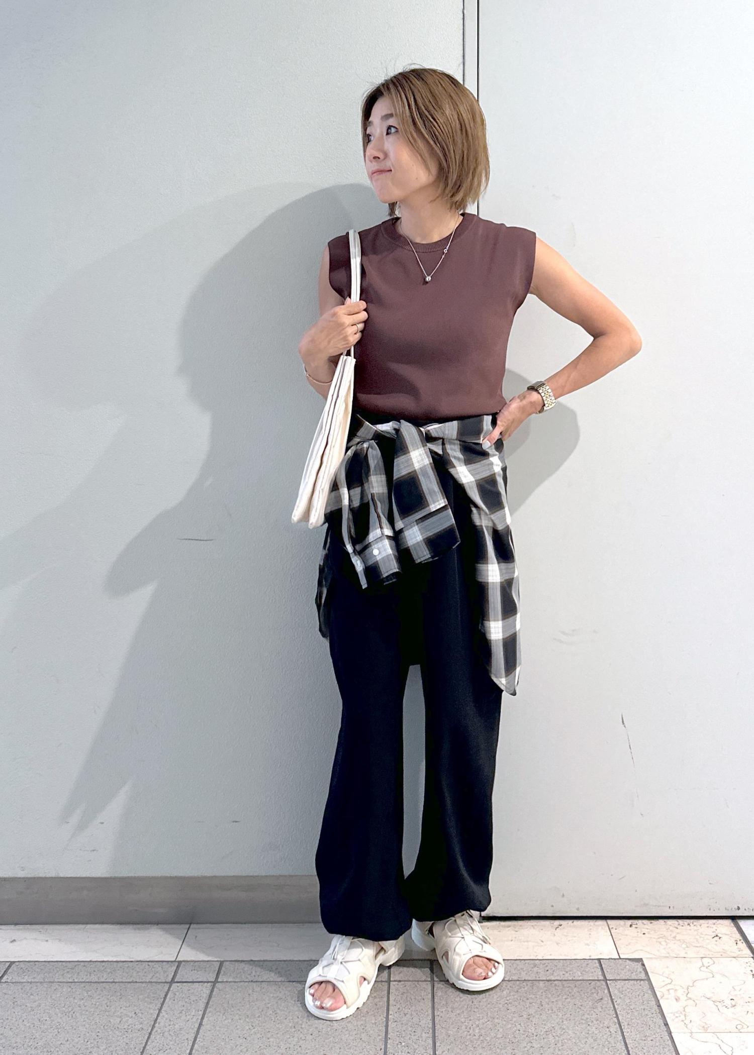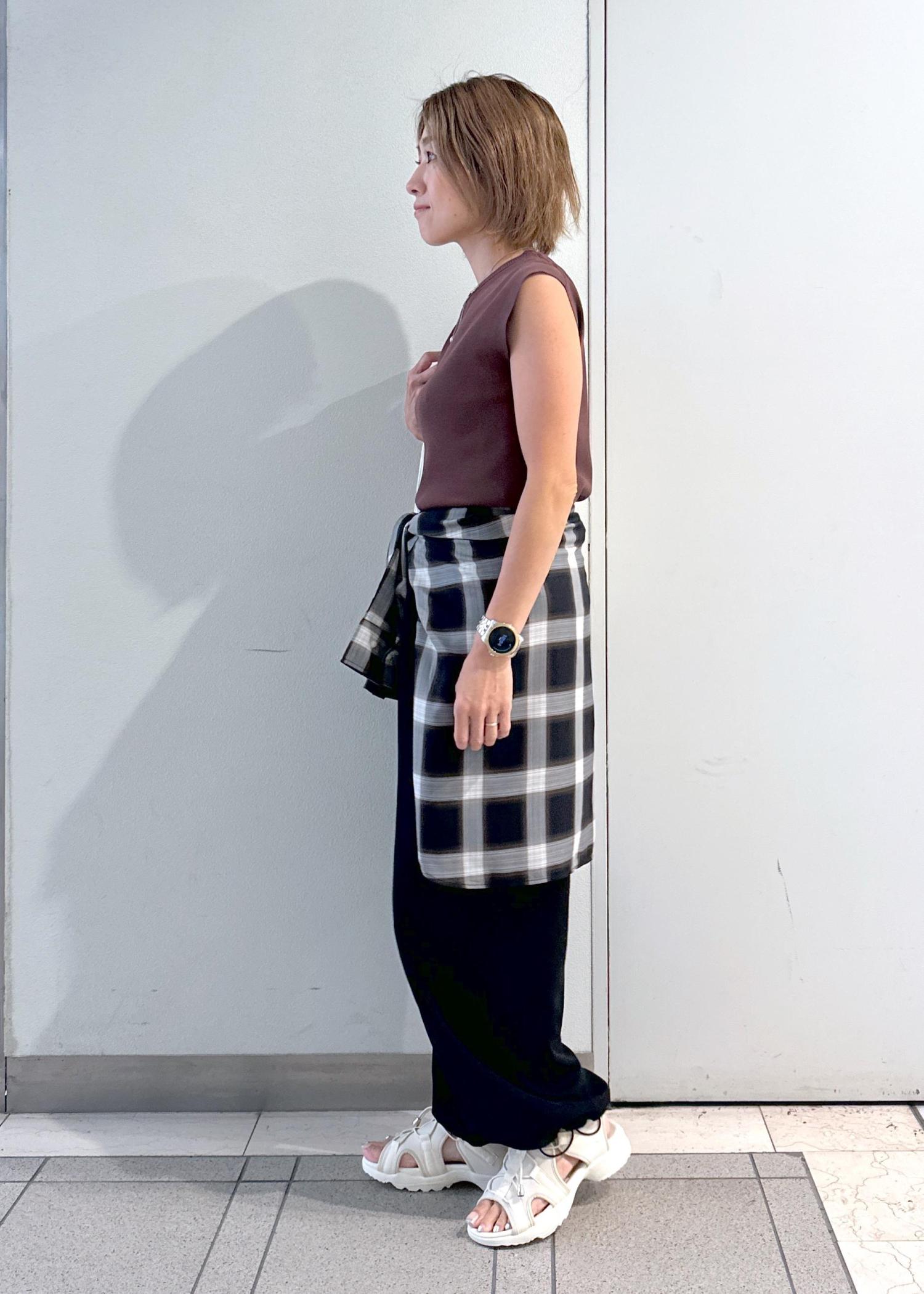 裾はお好みで絞れるので、コーディネートに合わせて変えると印象も変わります。 -