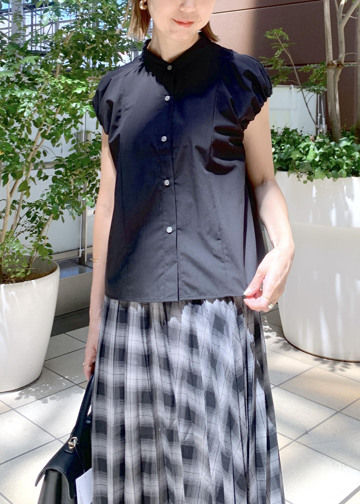 シンプルなブラックのシャツを合わせて大人なスタイリングに。