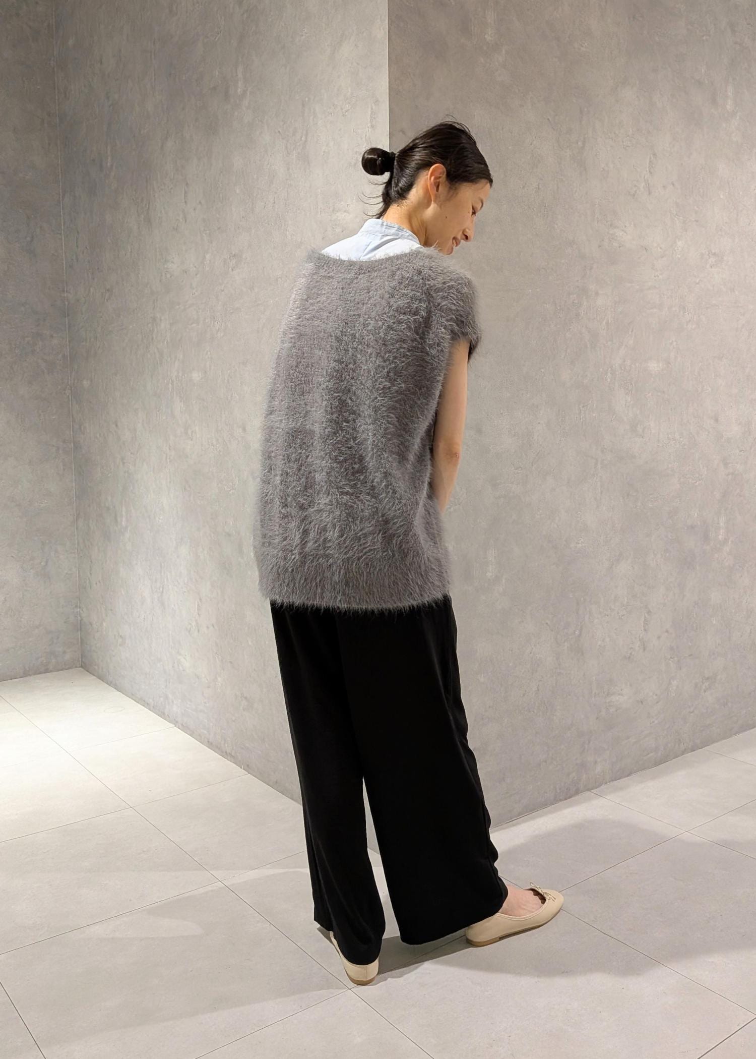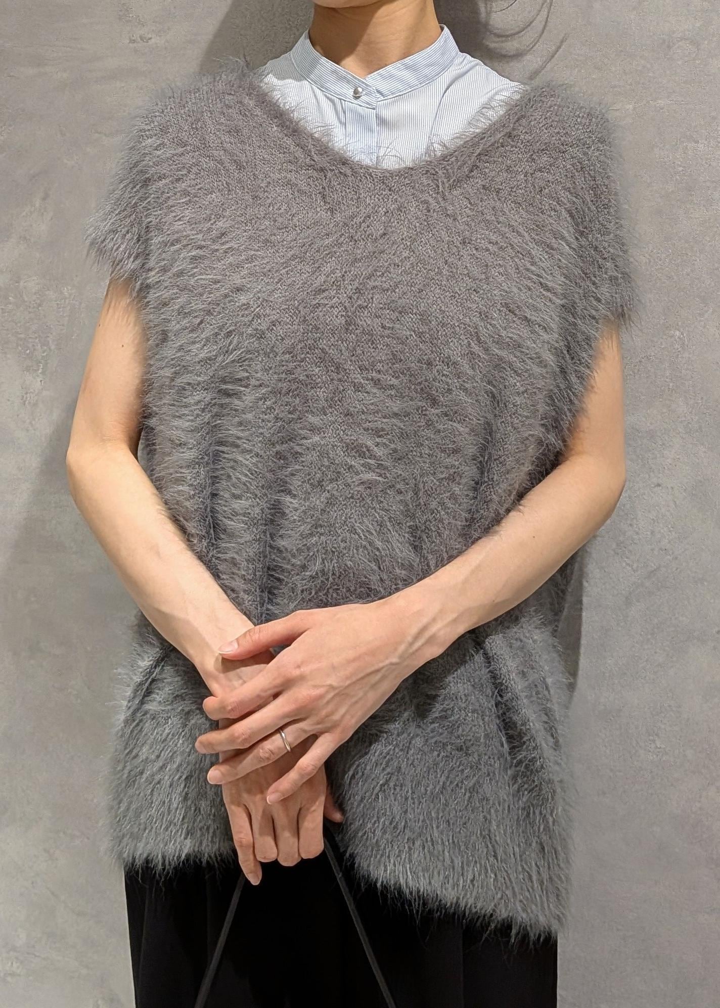 肌触りのいいフェザーニットに、ストライプのシャツを合わせてカジュアルコーデに。
