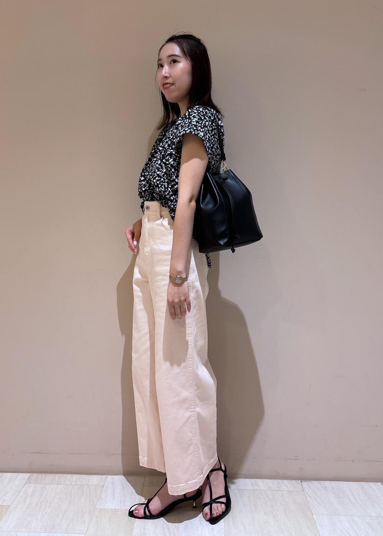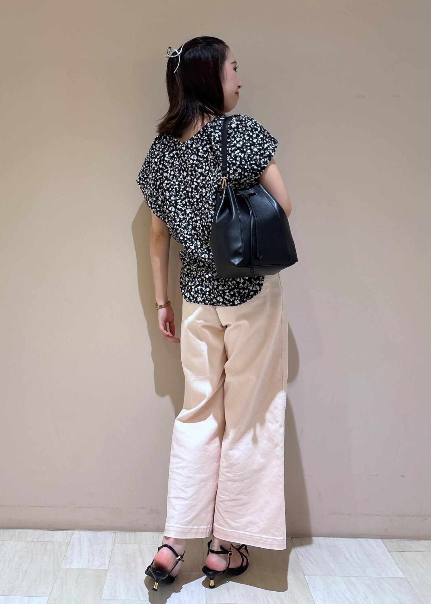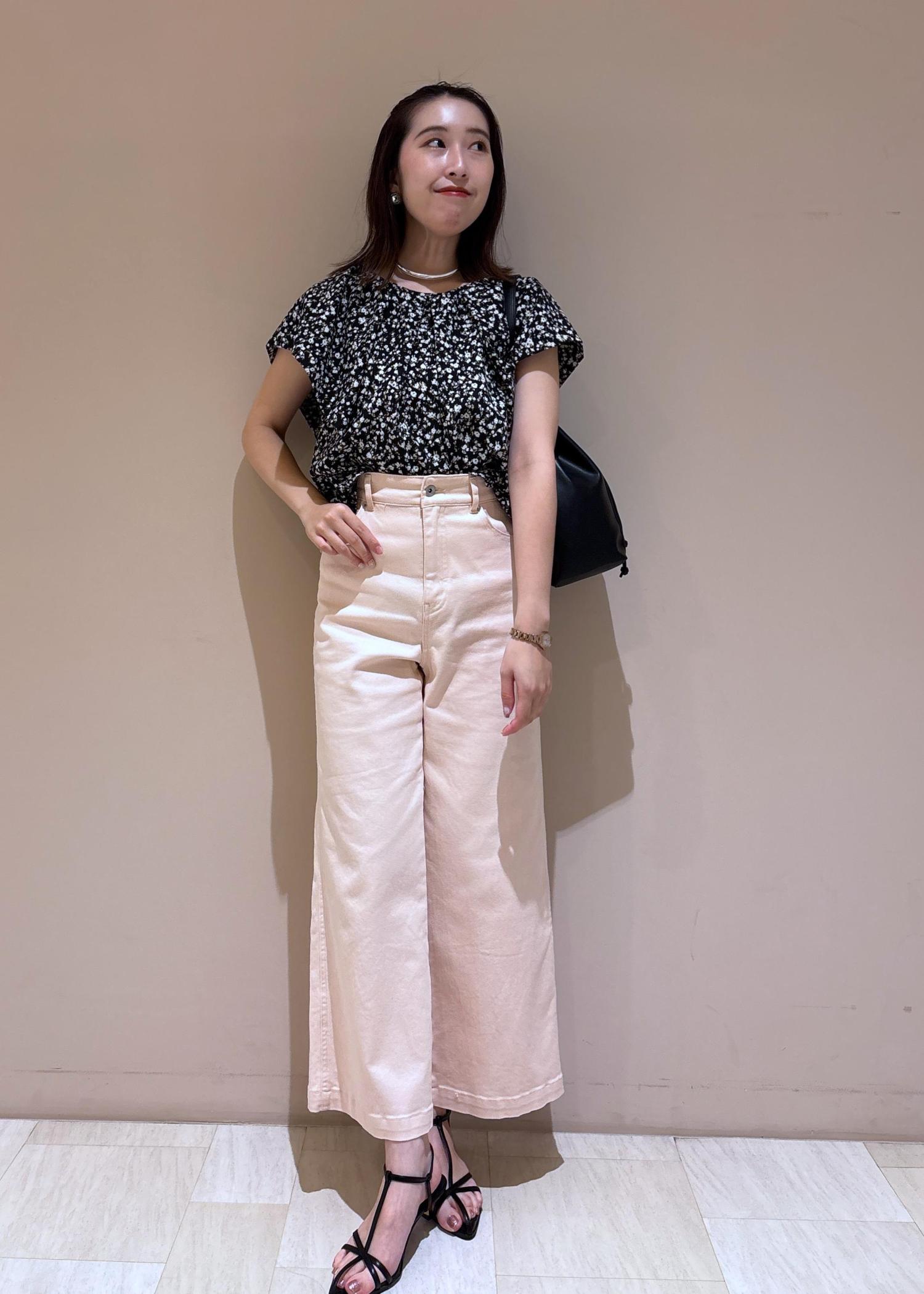 淡い色味のピンクデニムは、柄物のブラウスを持ってくるのがおすすめです!