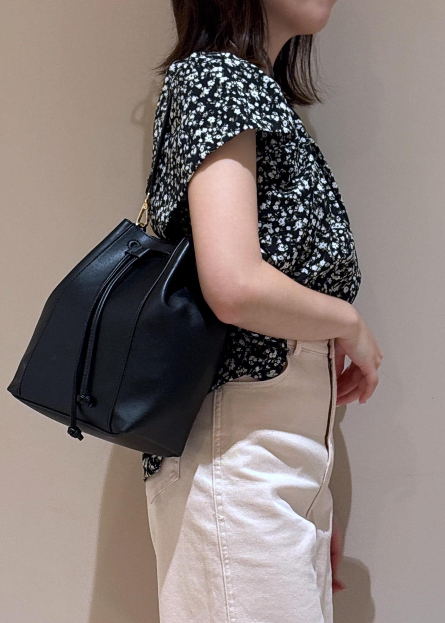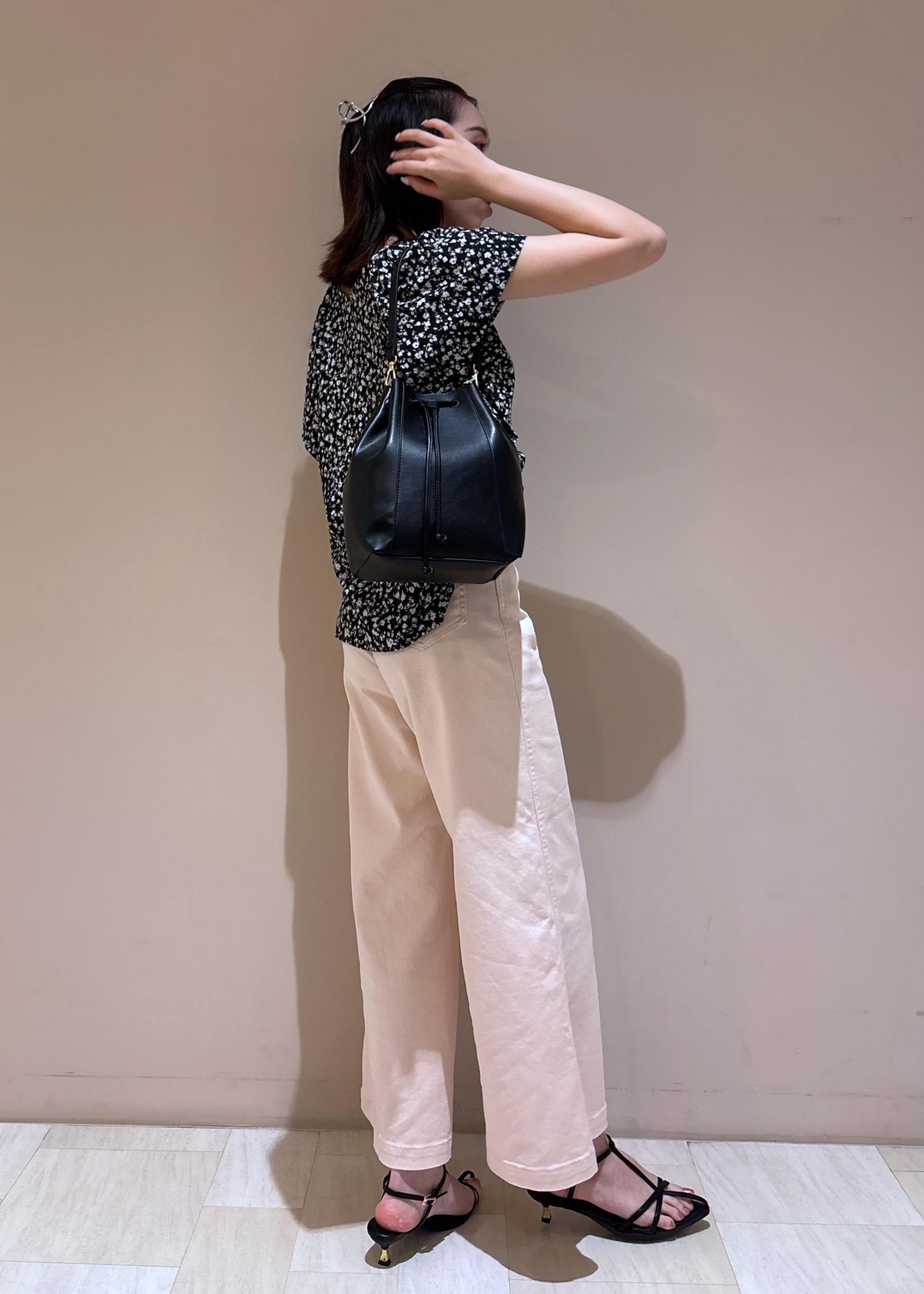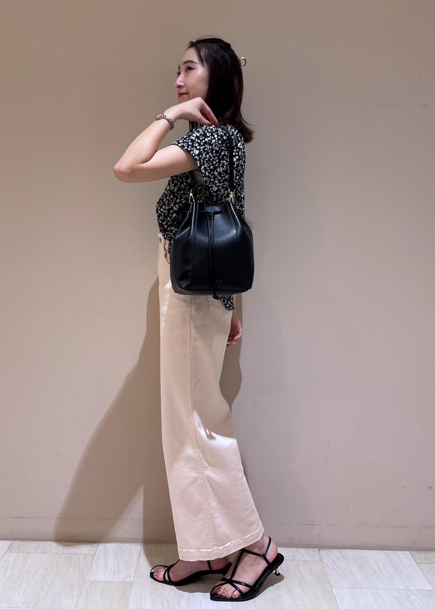 バッグと足元もブラックで統一するとより引き締まって見えます。