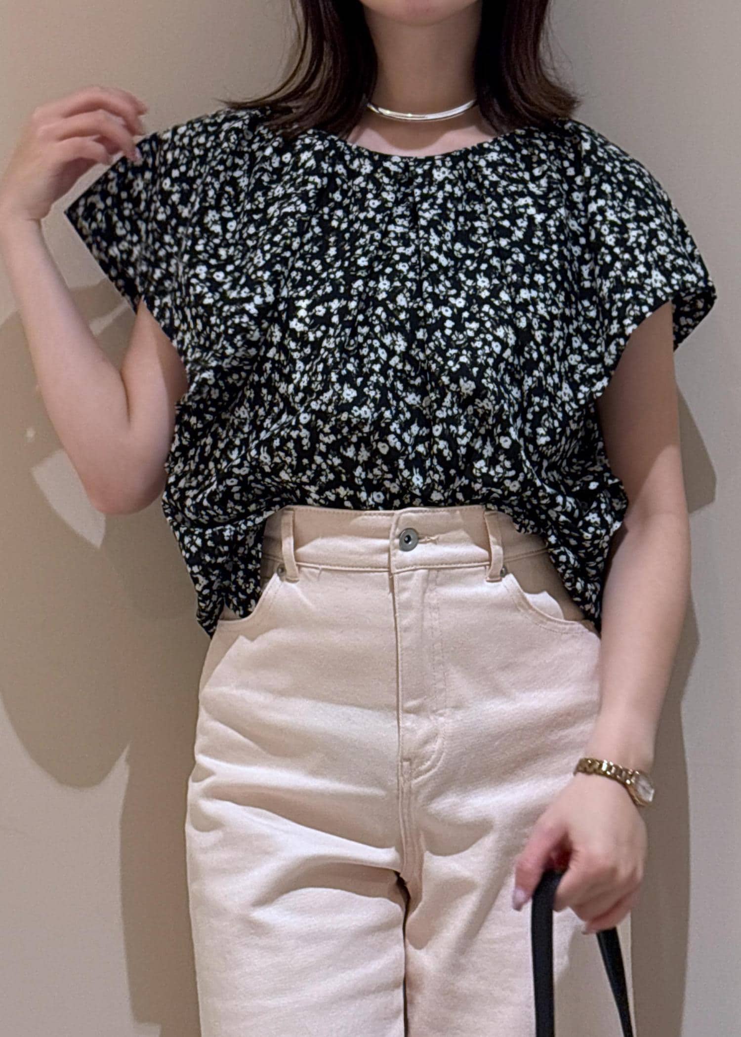 花柄ラッフルブラウス×ピンクデニムコーデ