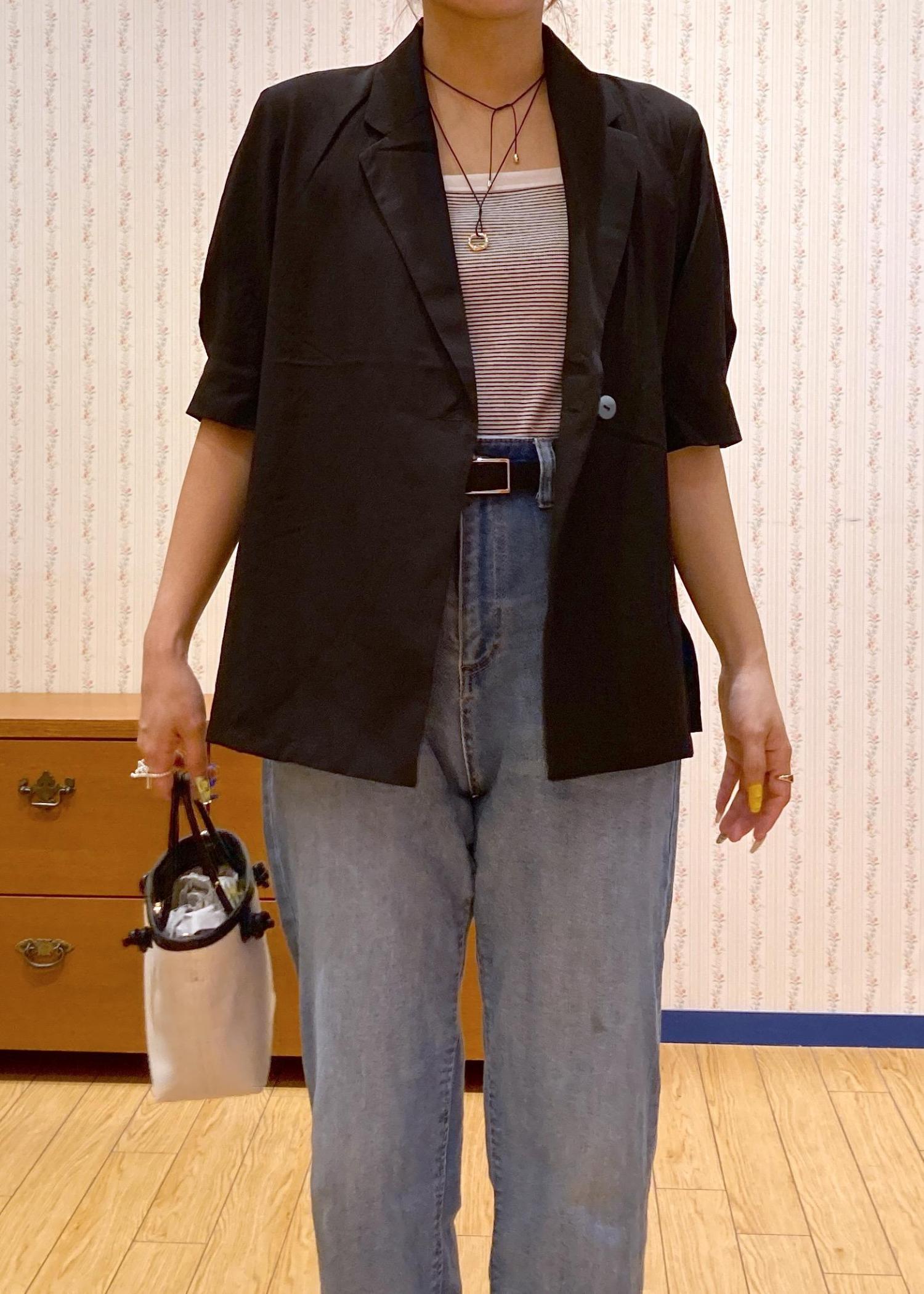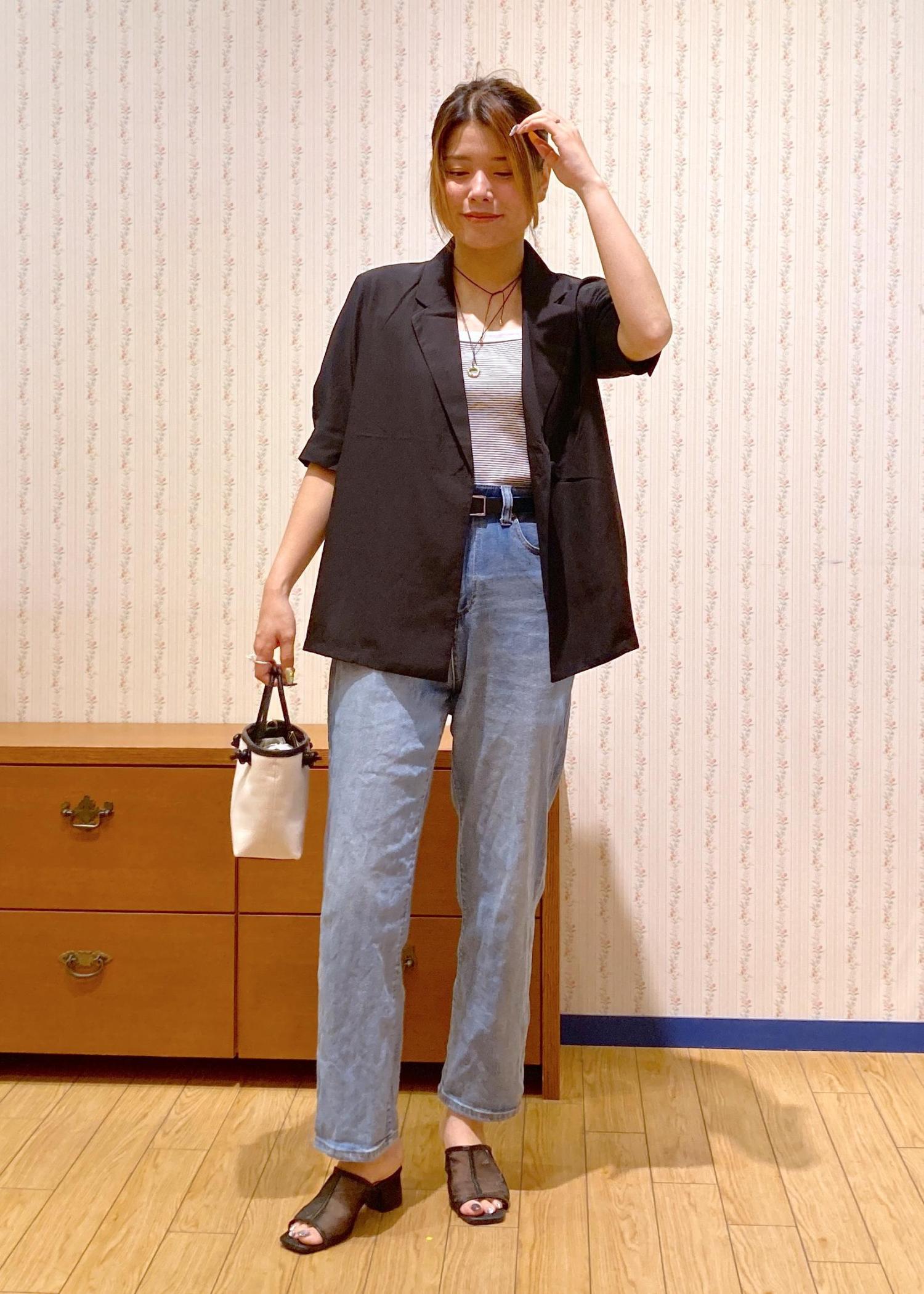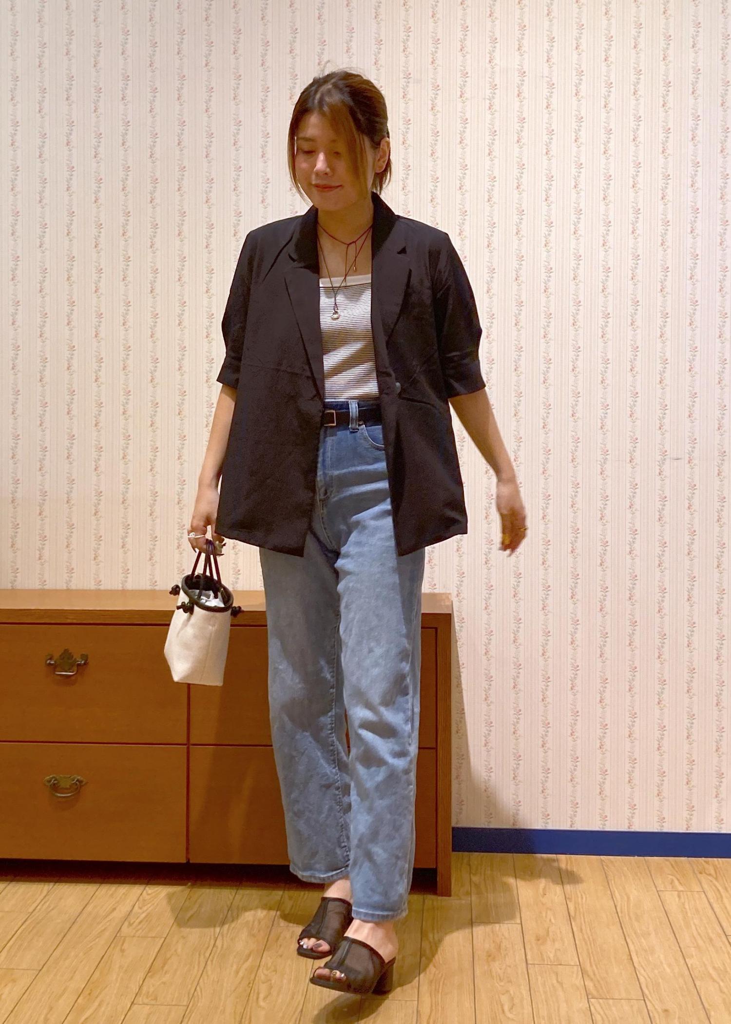 薄色マムデニムにシャツジャケットを羽織ったシンプルな大人カジュアルコーディネート。