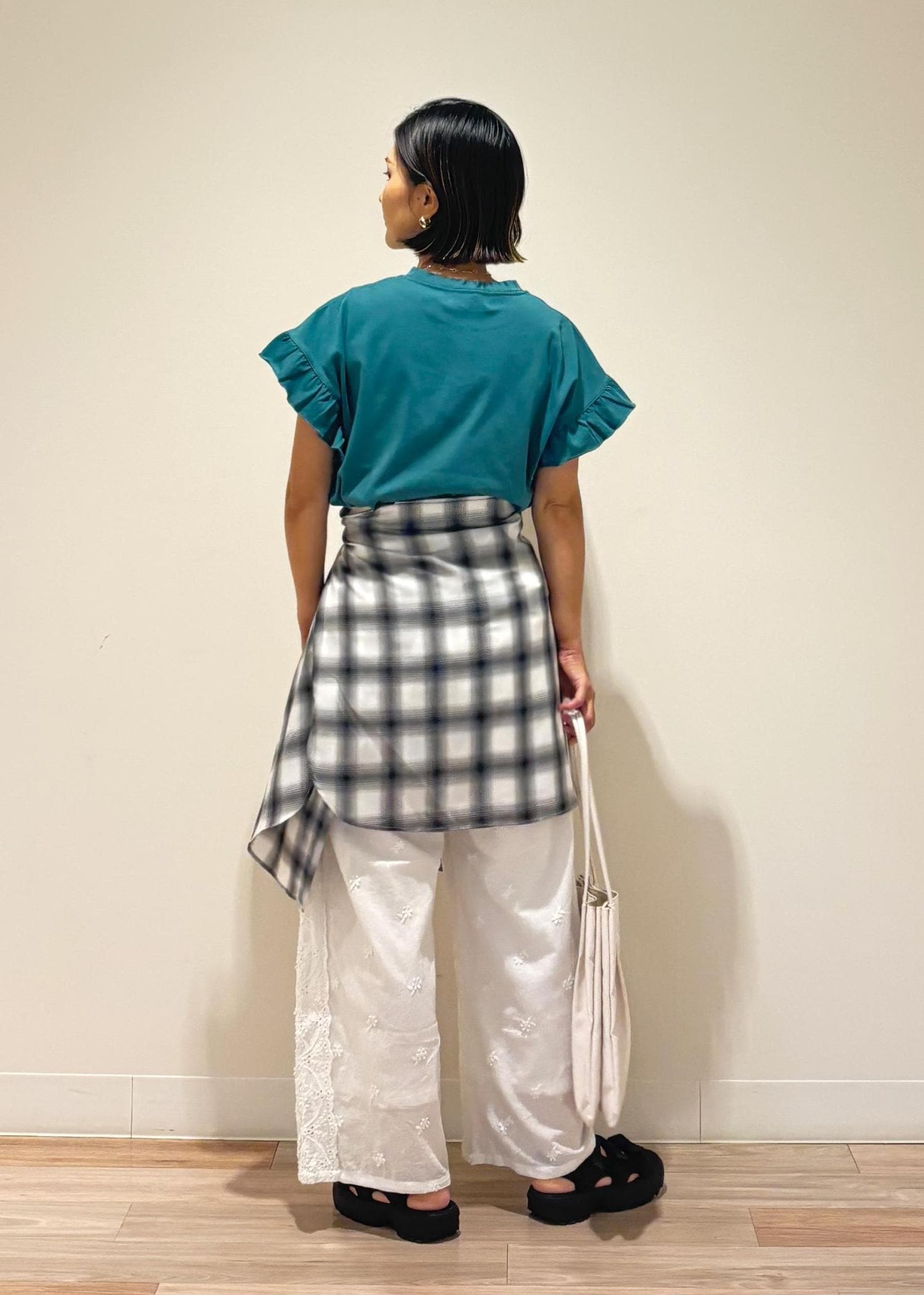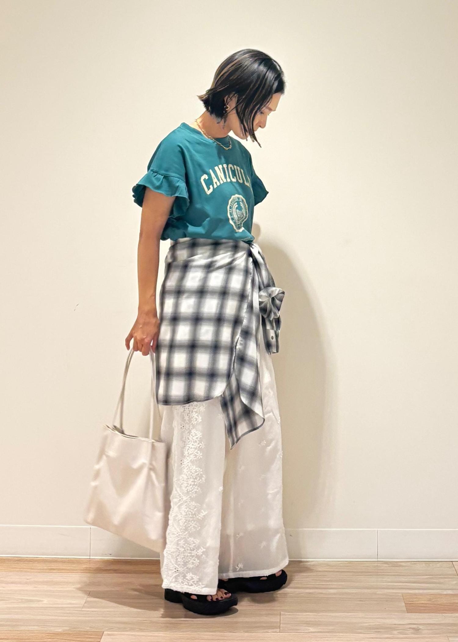 レースパンツにロゴTシャツとチェックシャツを合わせて、カジュアルなスタイリングにしてみました!