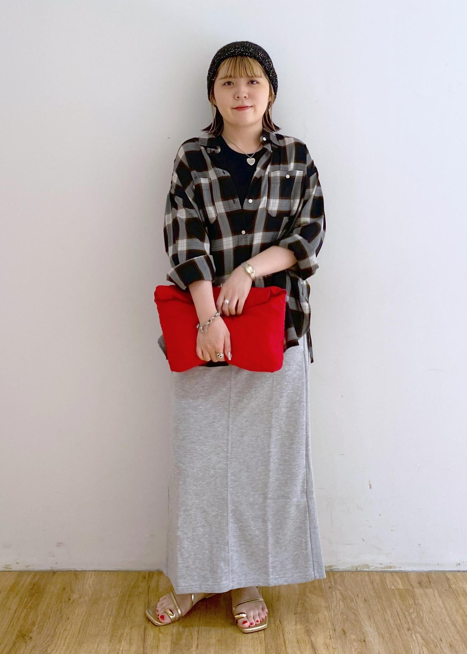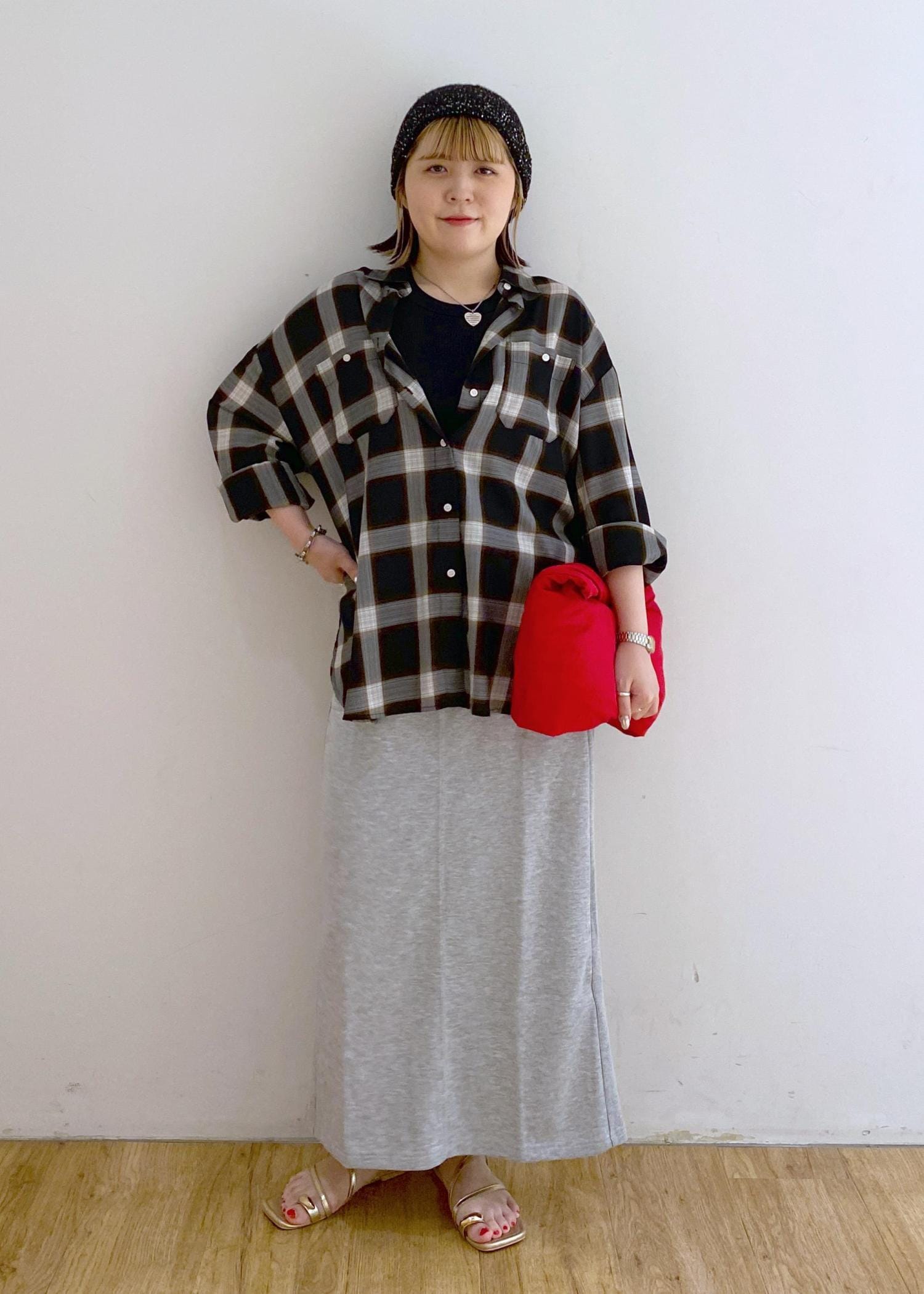 差し色で赤のトートバッグを合わせたのがポイントです◎