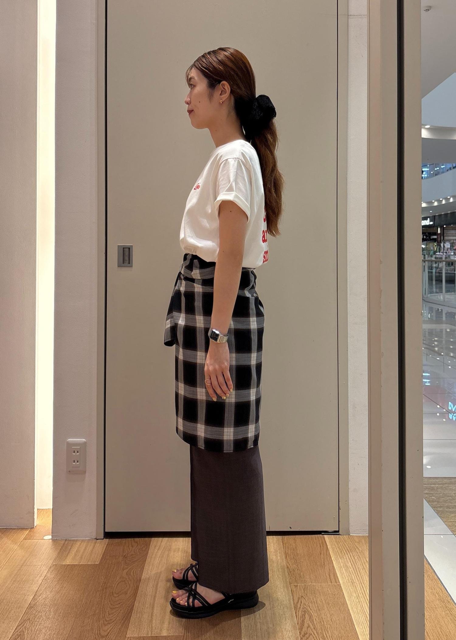 今回は、ブラウンの無印パンツと合わせたので柄をアクセントにチェックシャツを越しに巻きレイヤードしました◎