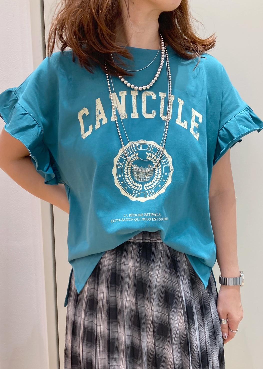 フリル袖が1枚で可愛いTシャツ。カジュアルな印象が強いカレッジロゴですが、フリルのデザインなので、甘めな雰囲気がお好きな方にもおすすめです。