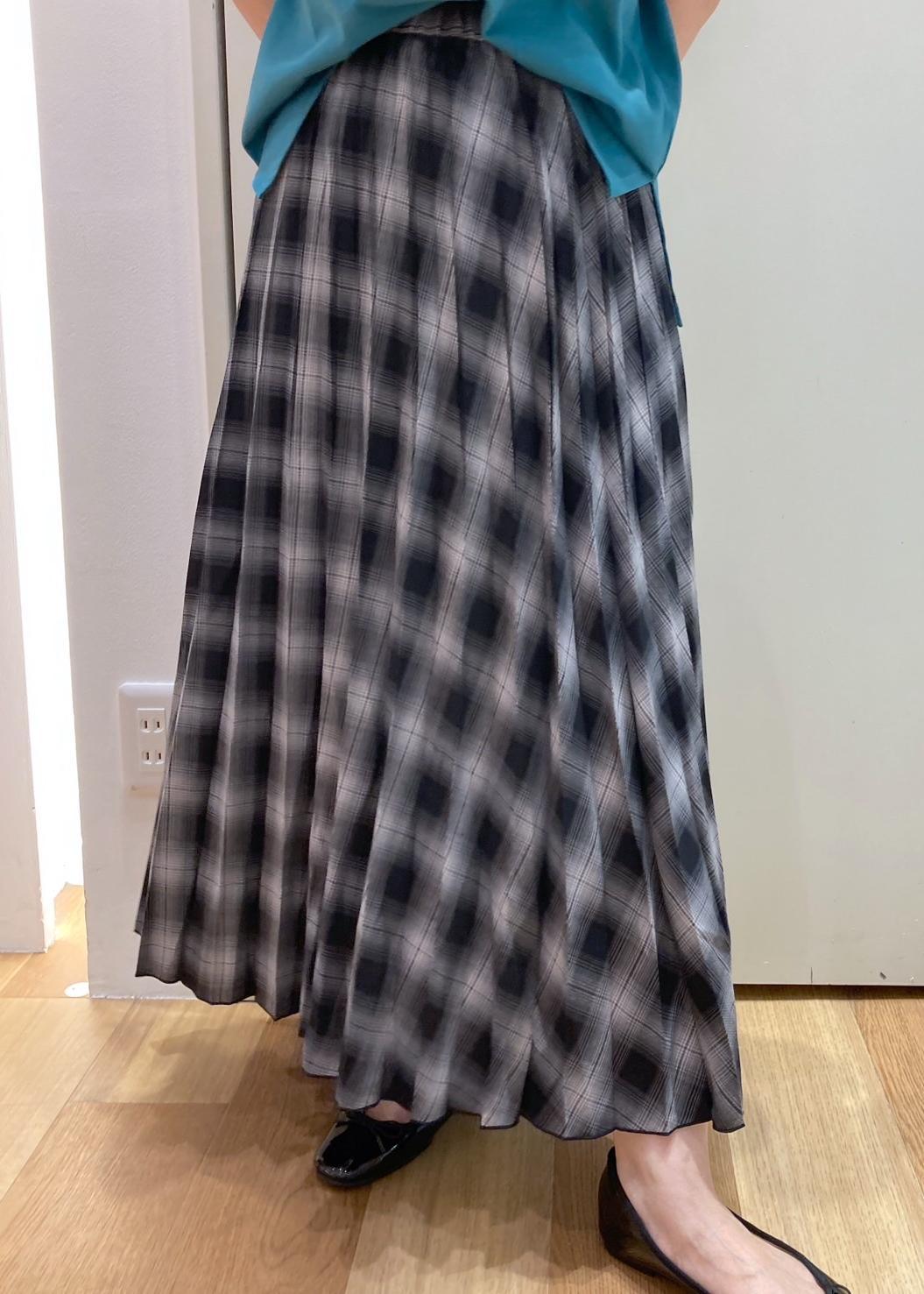 今の時期からお持ちのTシャツに取り入れ、秋気分を感じることのできるチェックスカートは、ウエストゴムで楽に履けます。落ち着いたカラーの配色のチェックなので、カジュアルがお好きな方は、カラーのトップスを持ってくるとディリーな印象に。