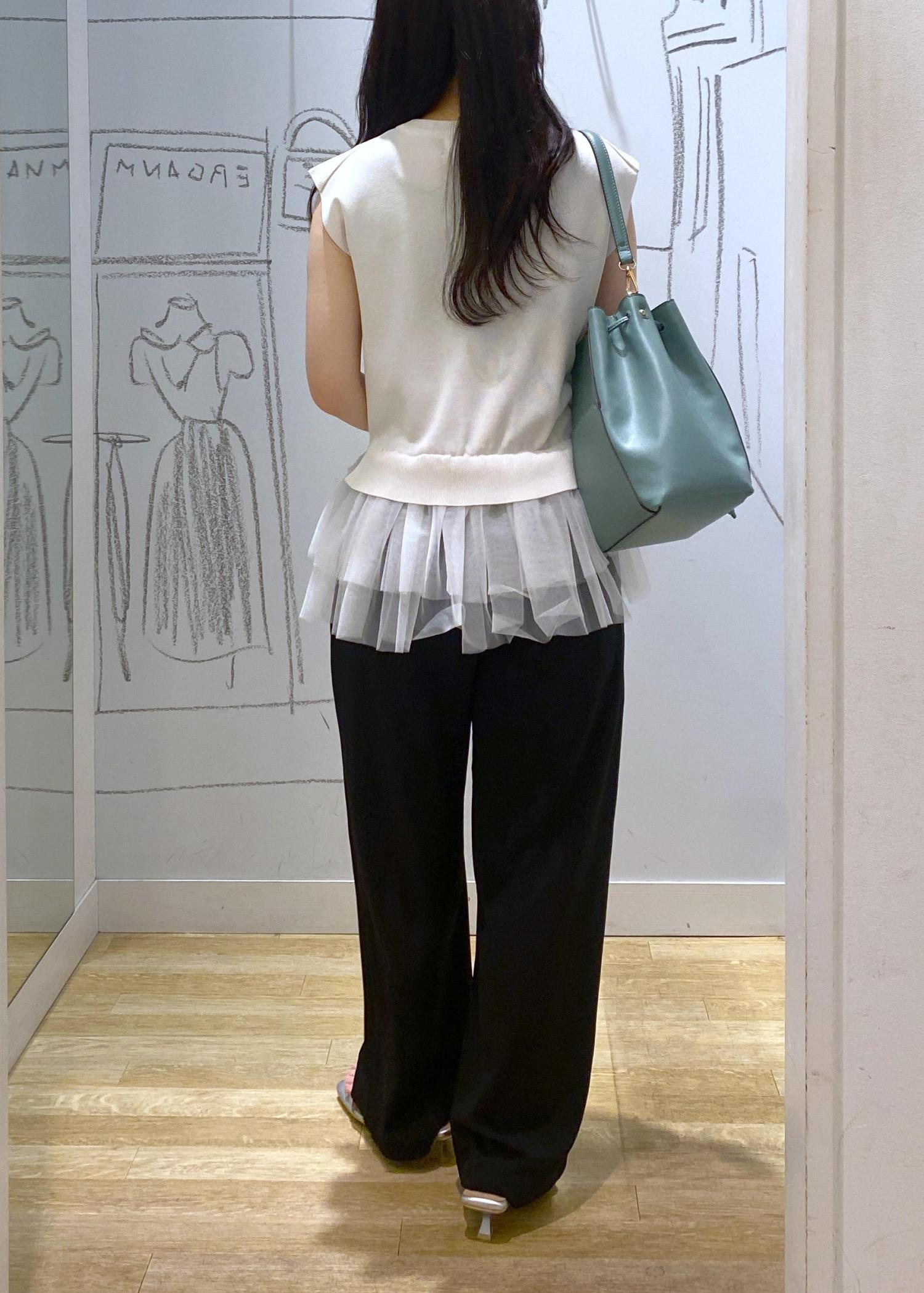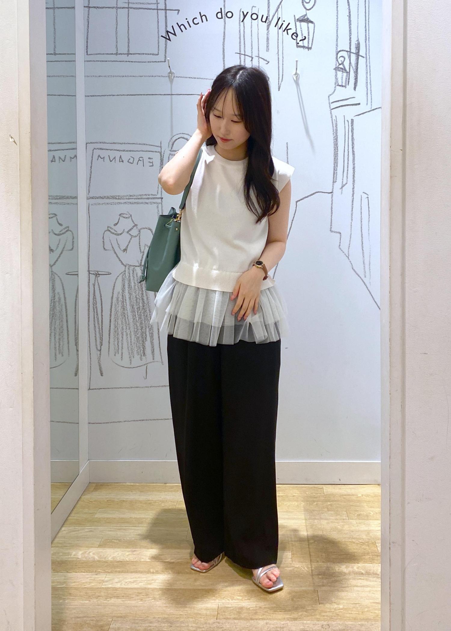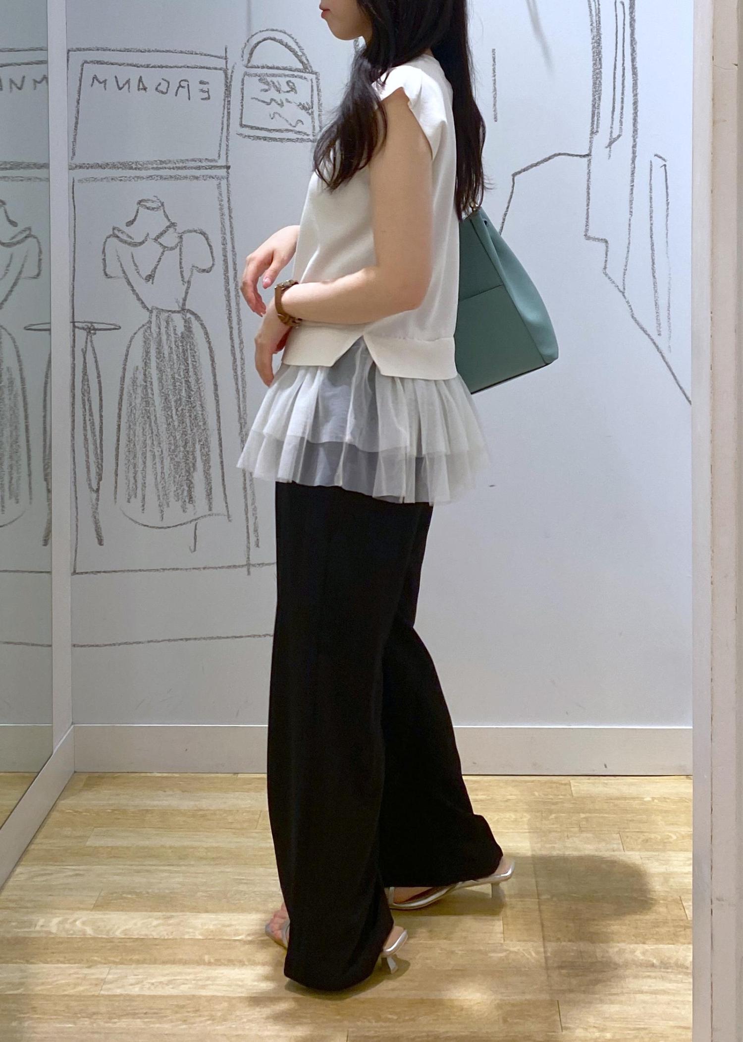 一見シンプルに見えるコーデですが、トップスにチュールを持ってくることで華やかさを出しました◎