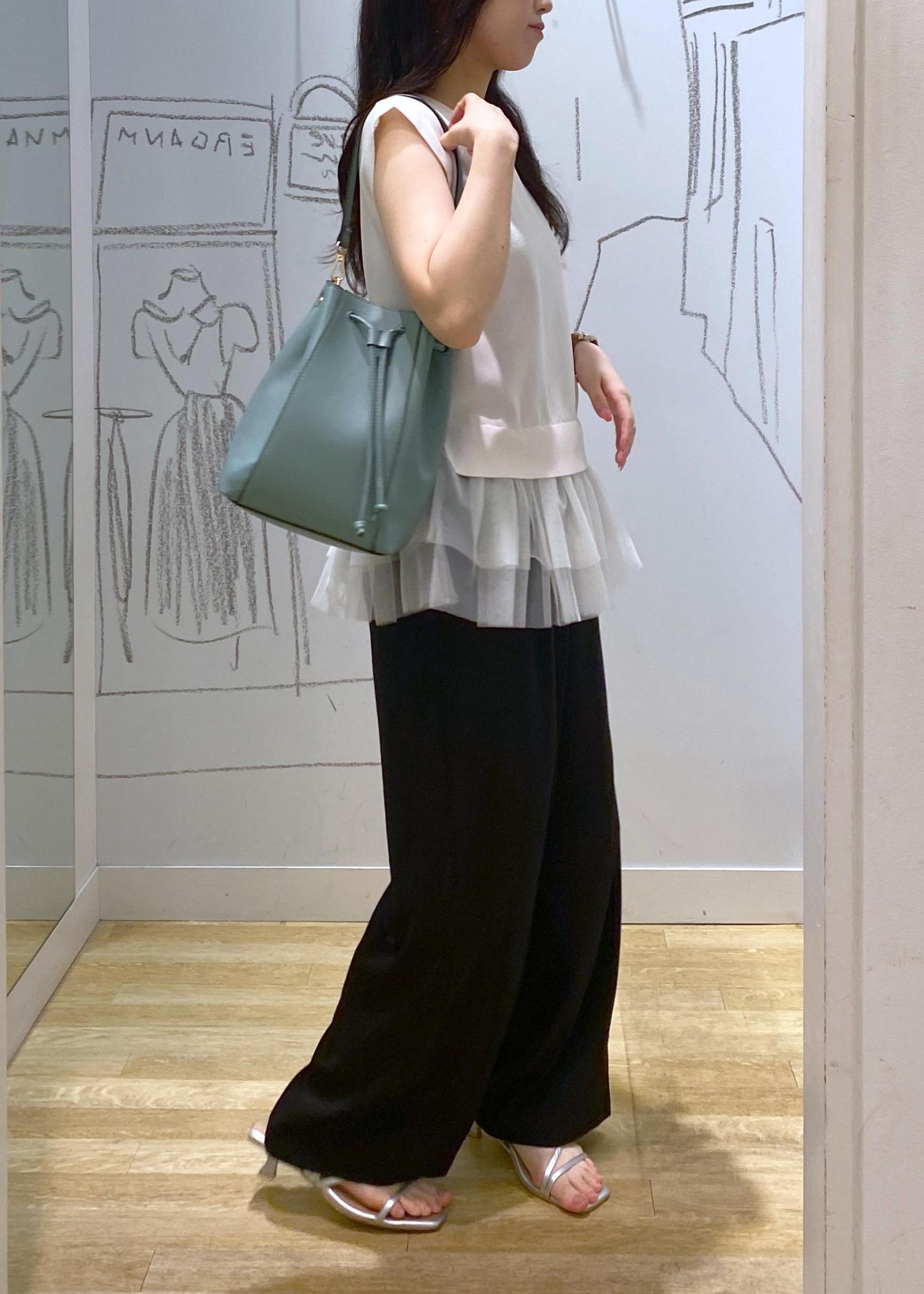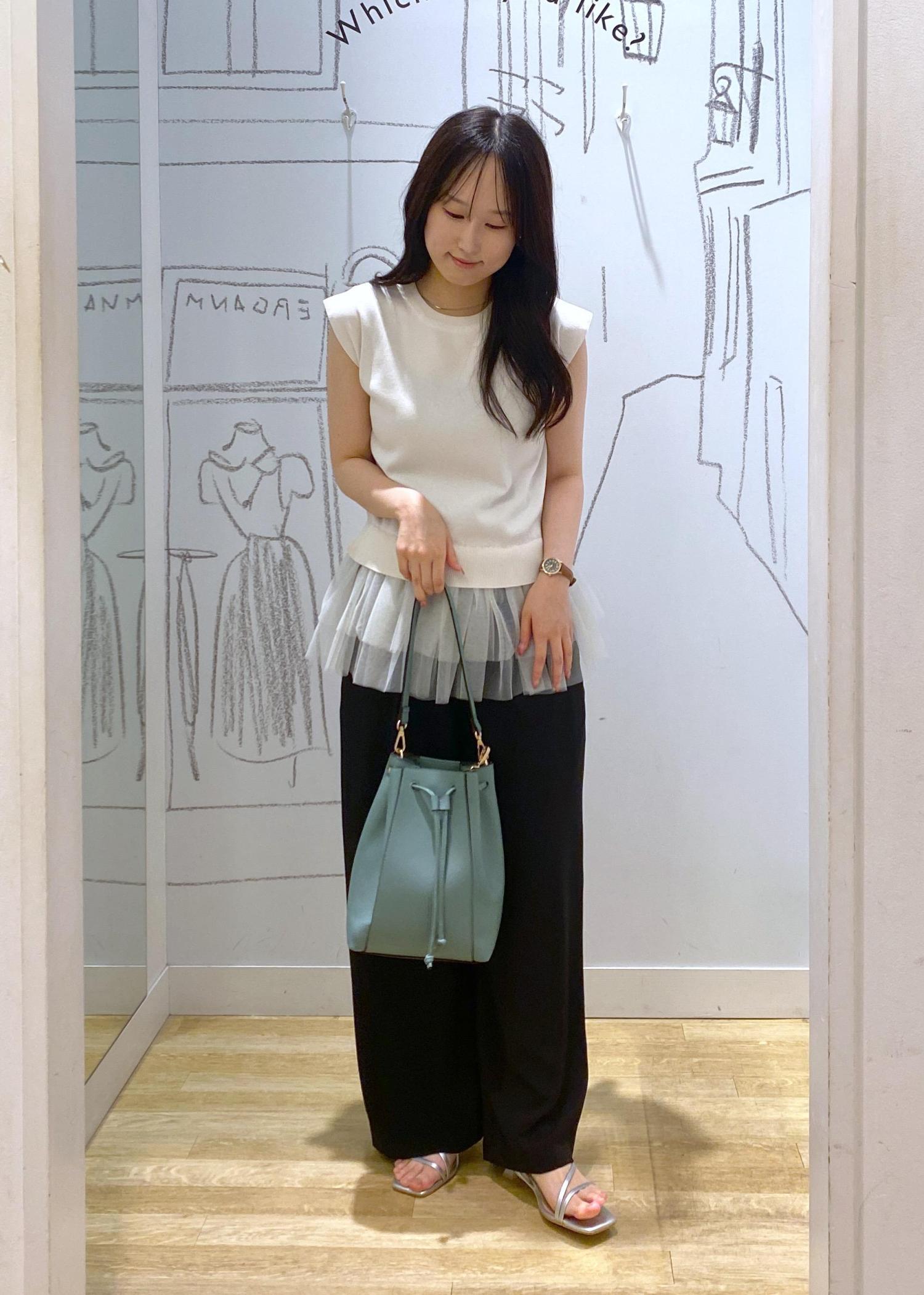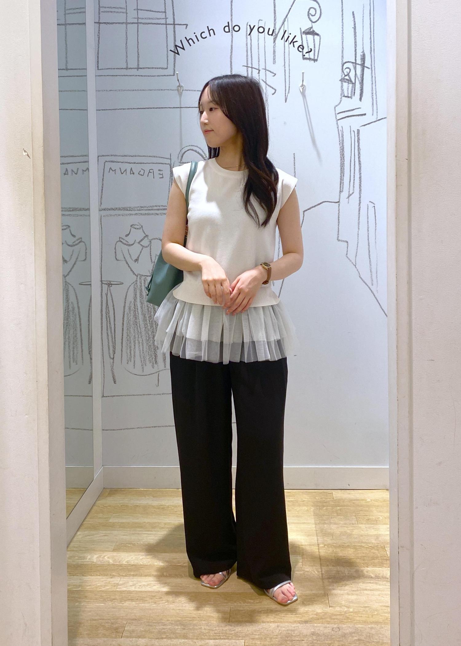 一見シンプルに見えるコーデですが、トップスにチュールを持ってくることで華やかさを出しました◎