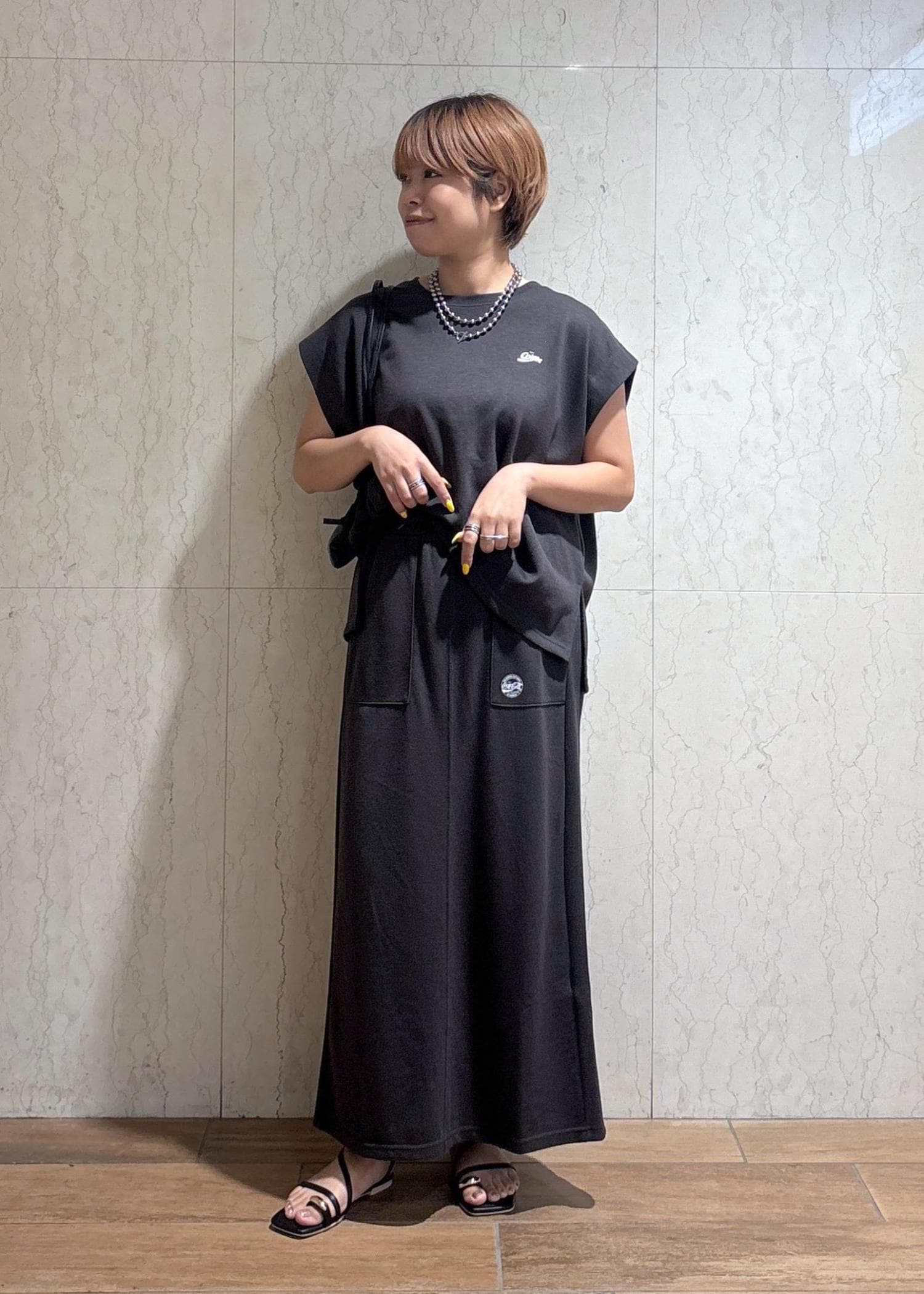 丈感はフラットのサンダルを履いて、くるぶしが隠れるぐらいの長さです。 -