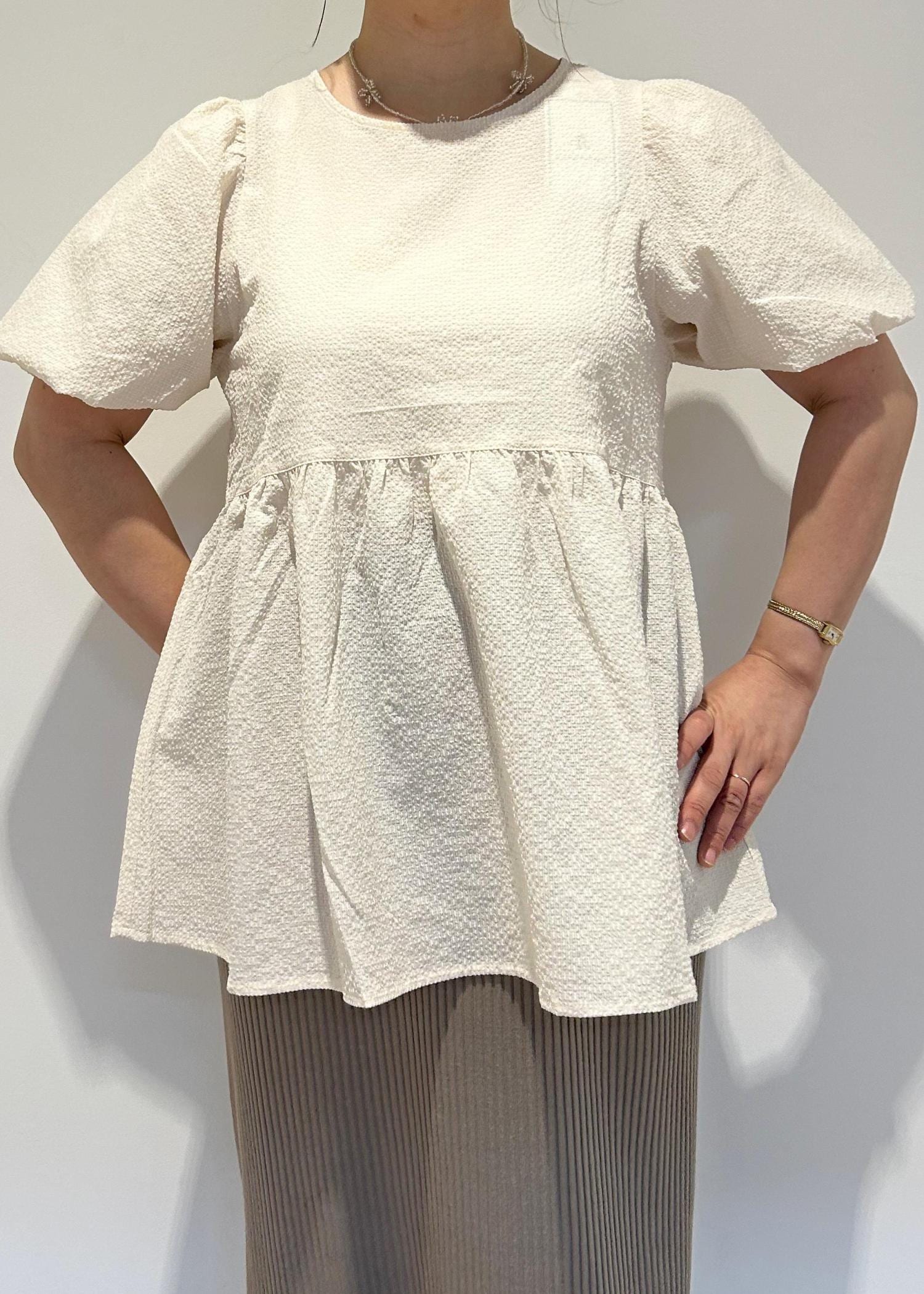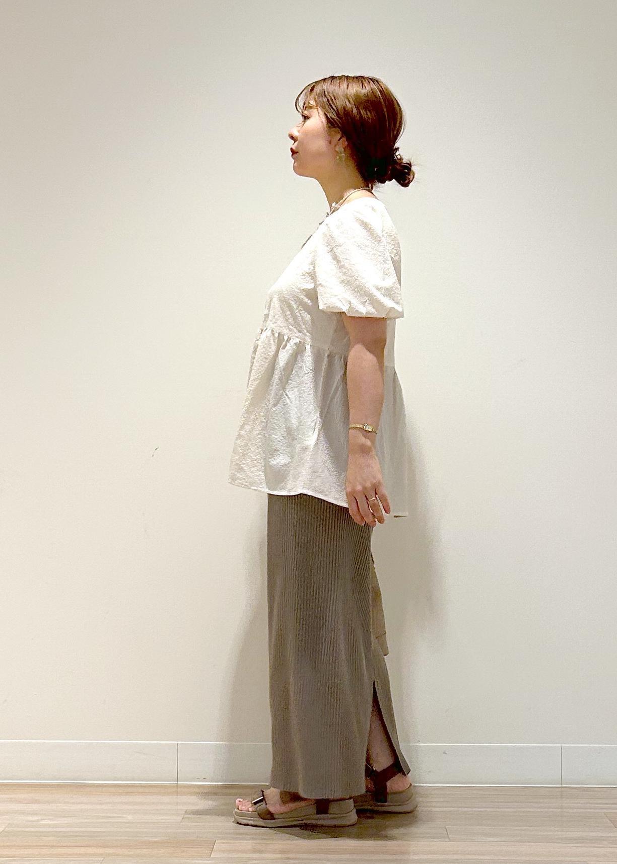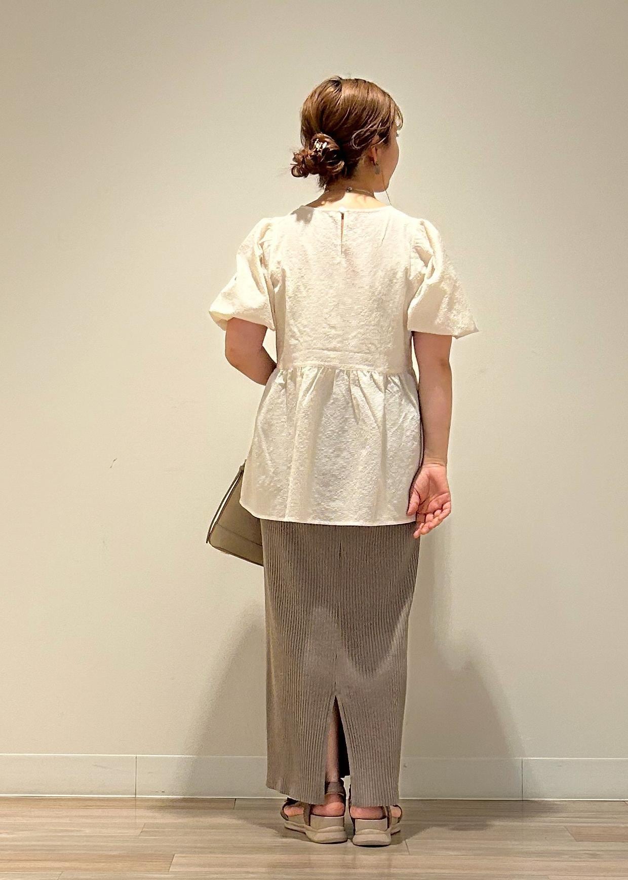 ペプラムデザインのブラウスには、アイラインのスカートがバランスが良く見えておすすめです。