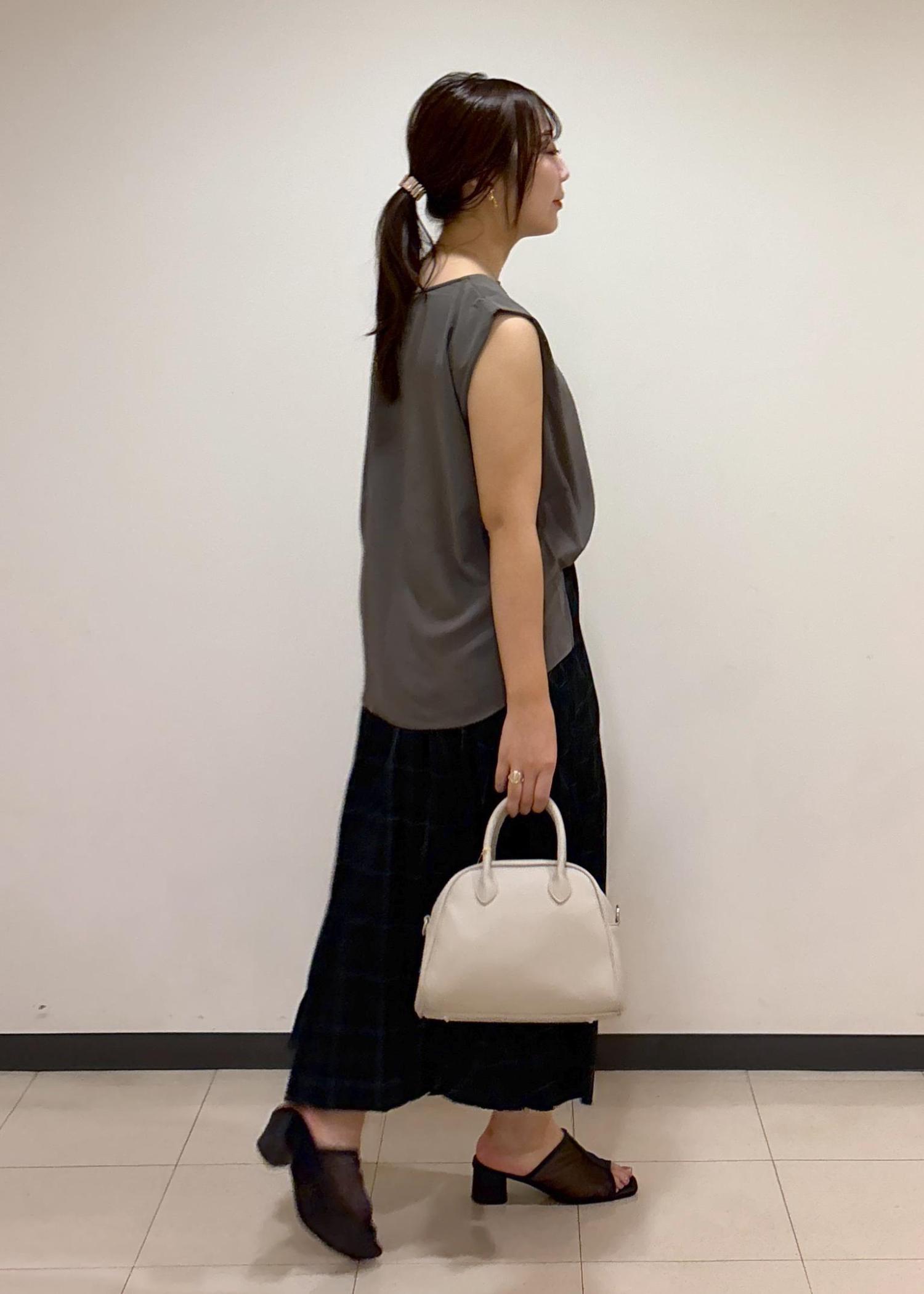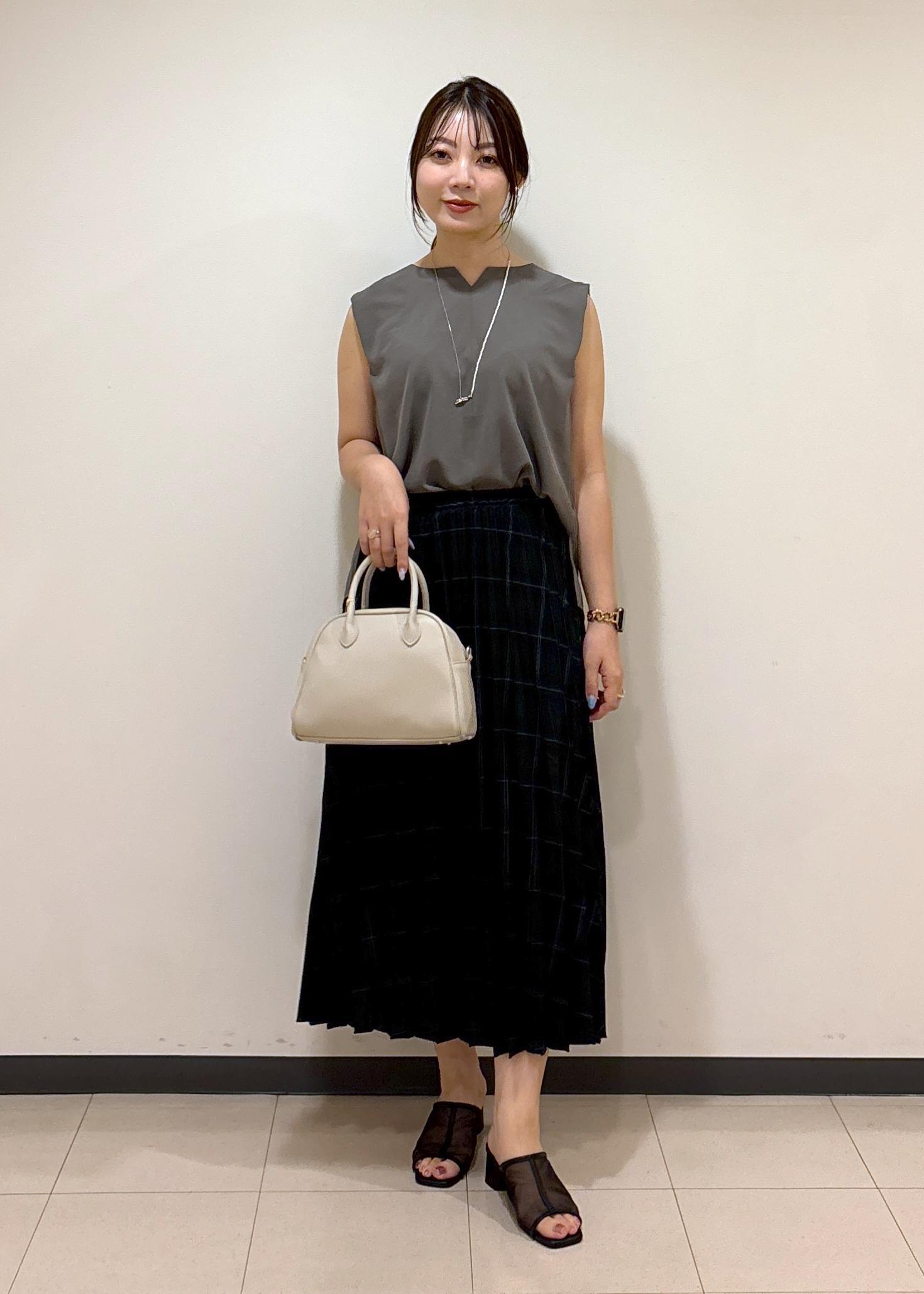 涼しげな素材感で快適ながら秋を意識した色味のコーデ。