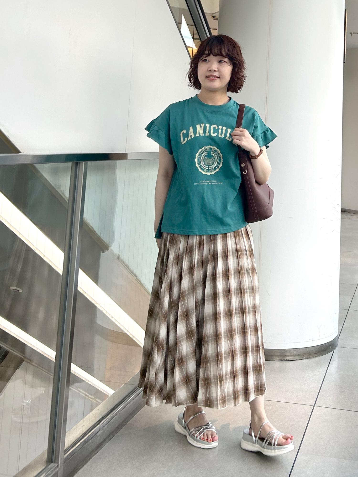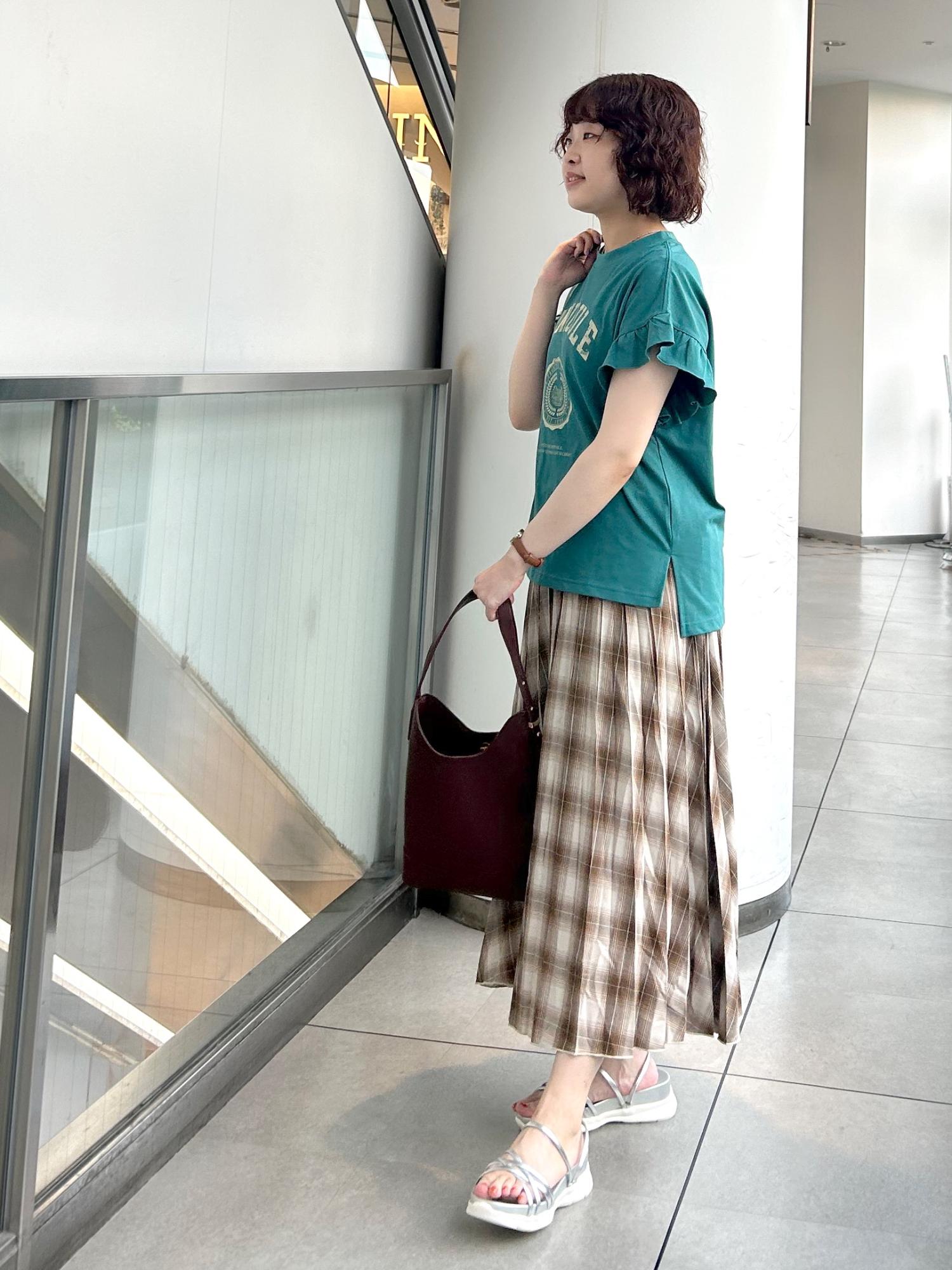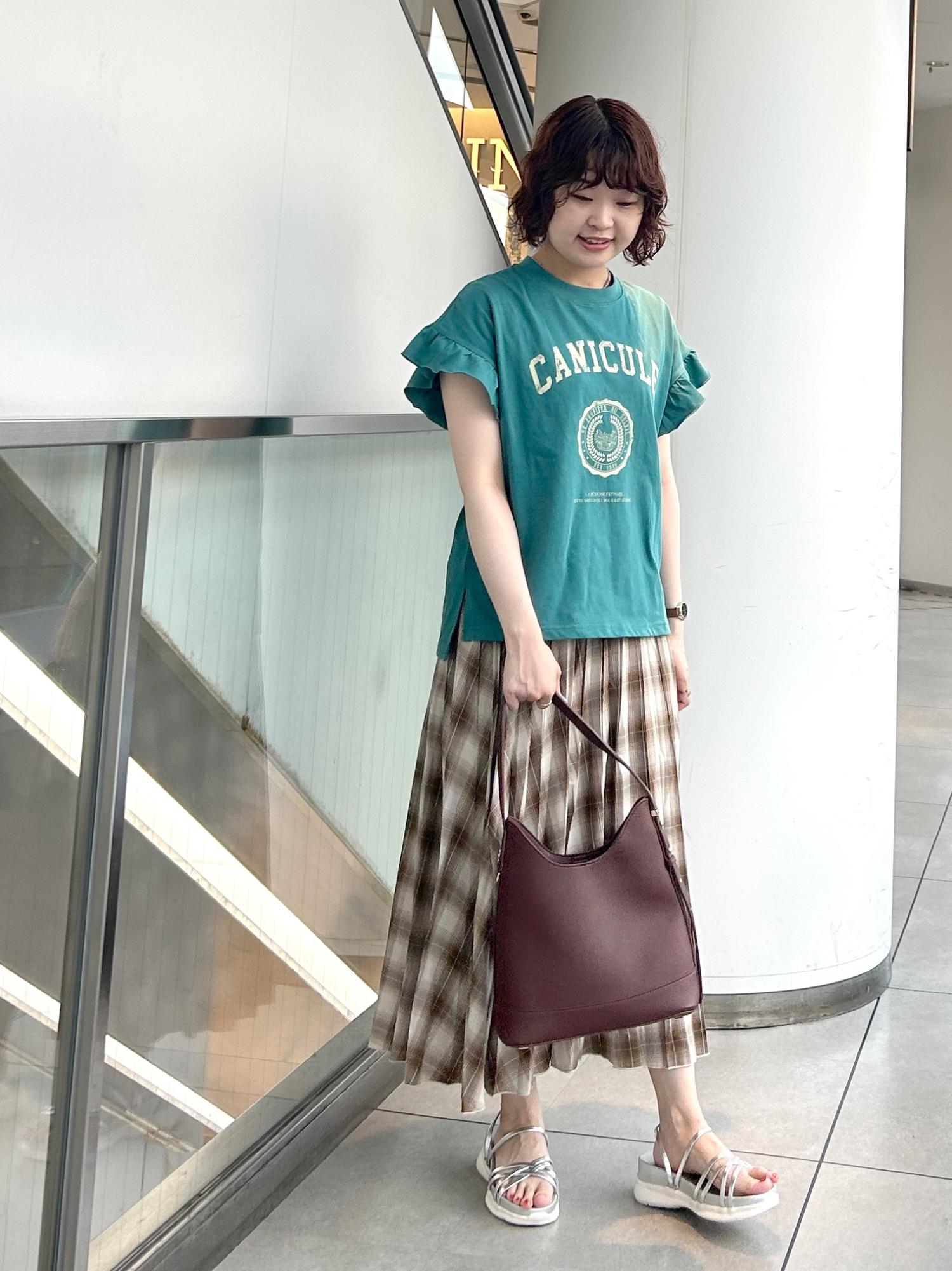グリーンをアクセントに、チェックスカートで秋らしさを