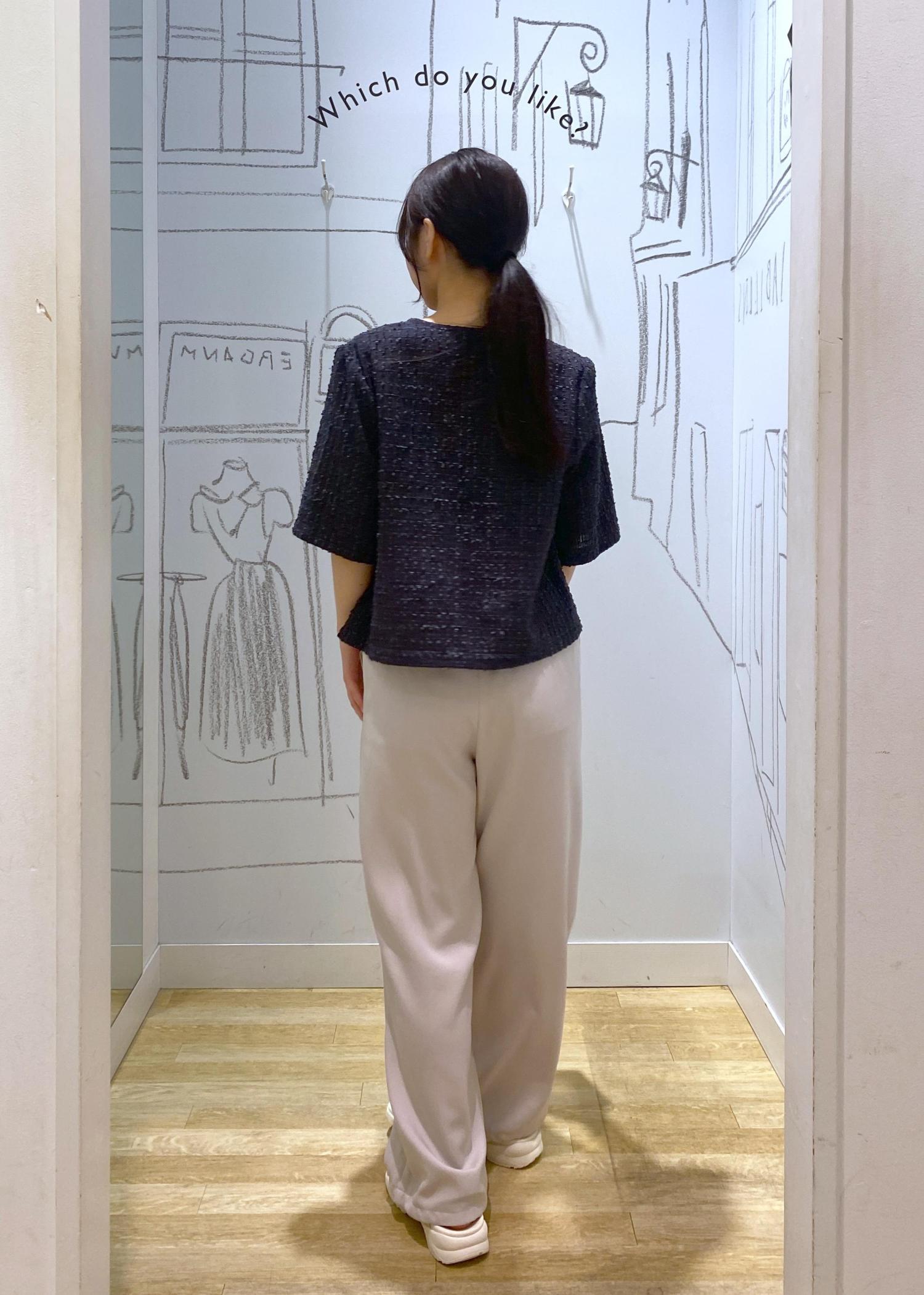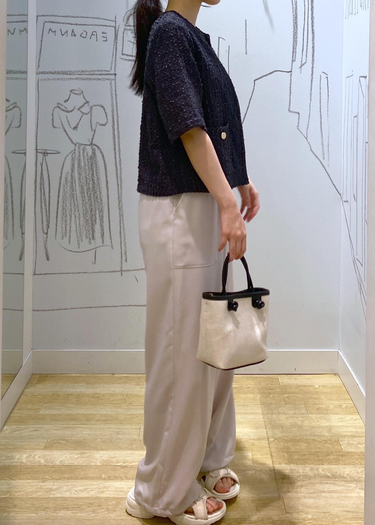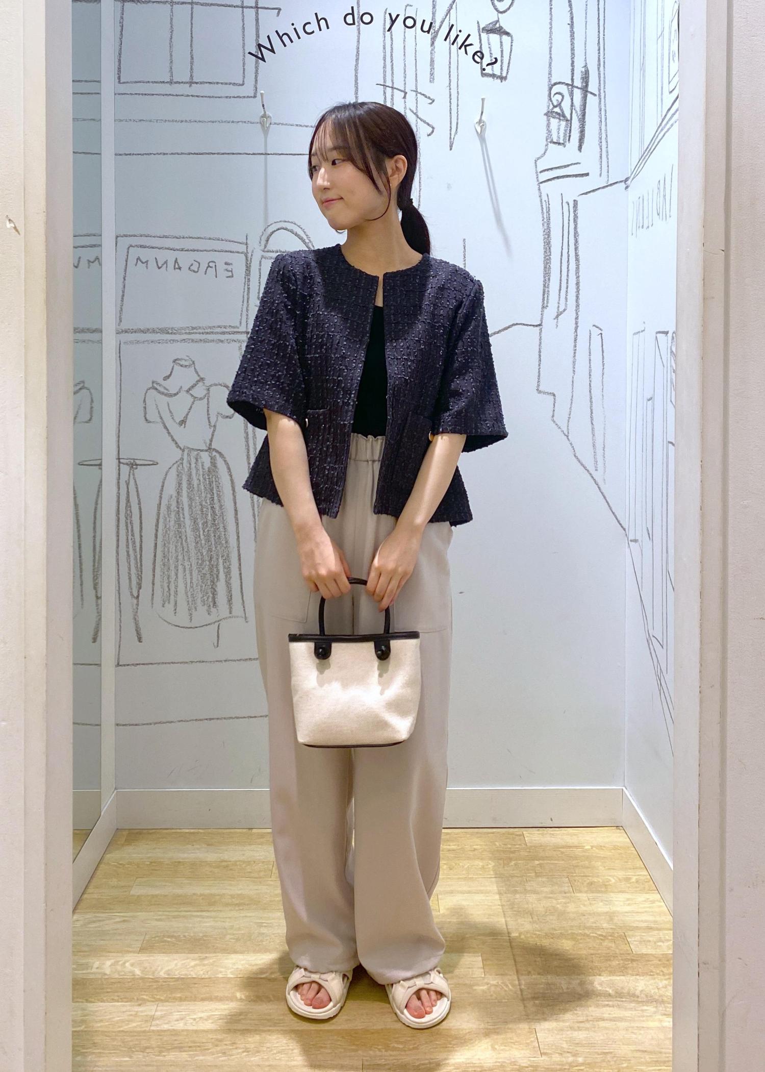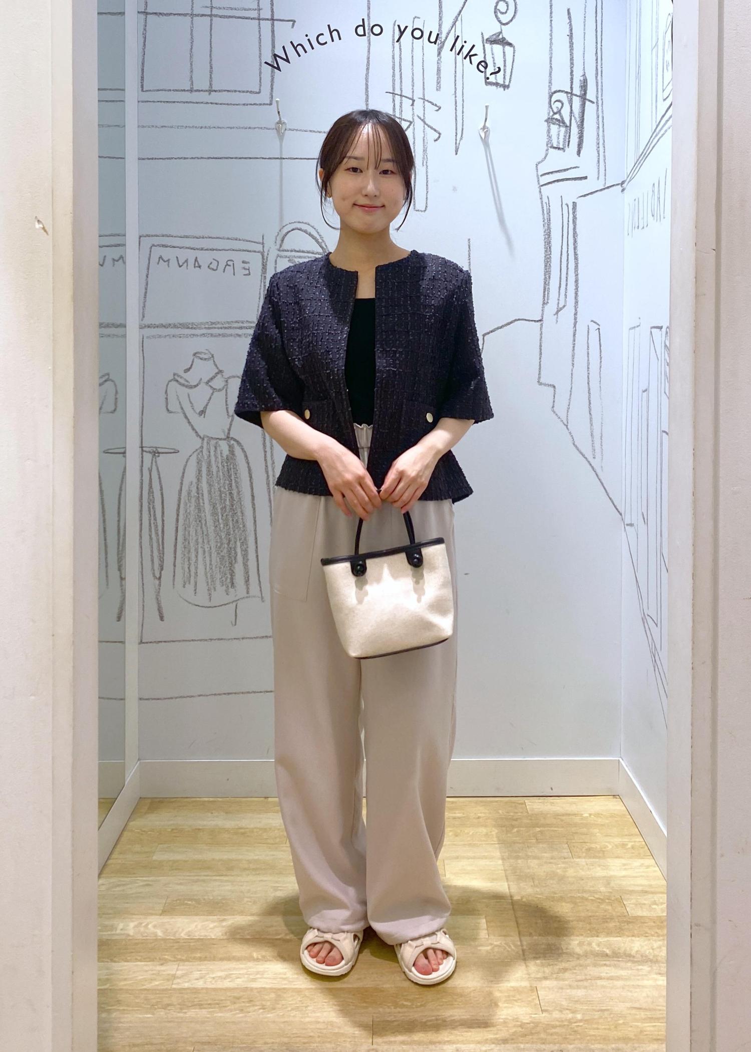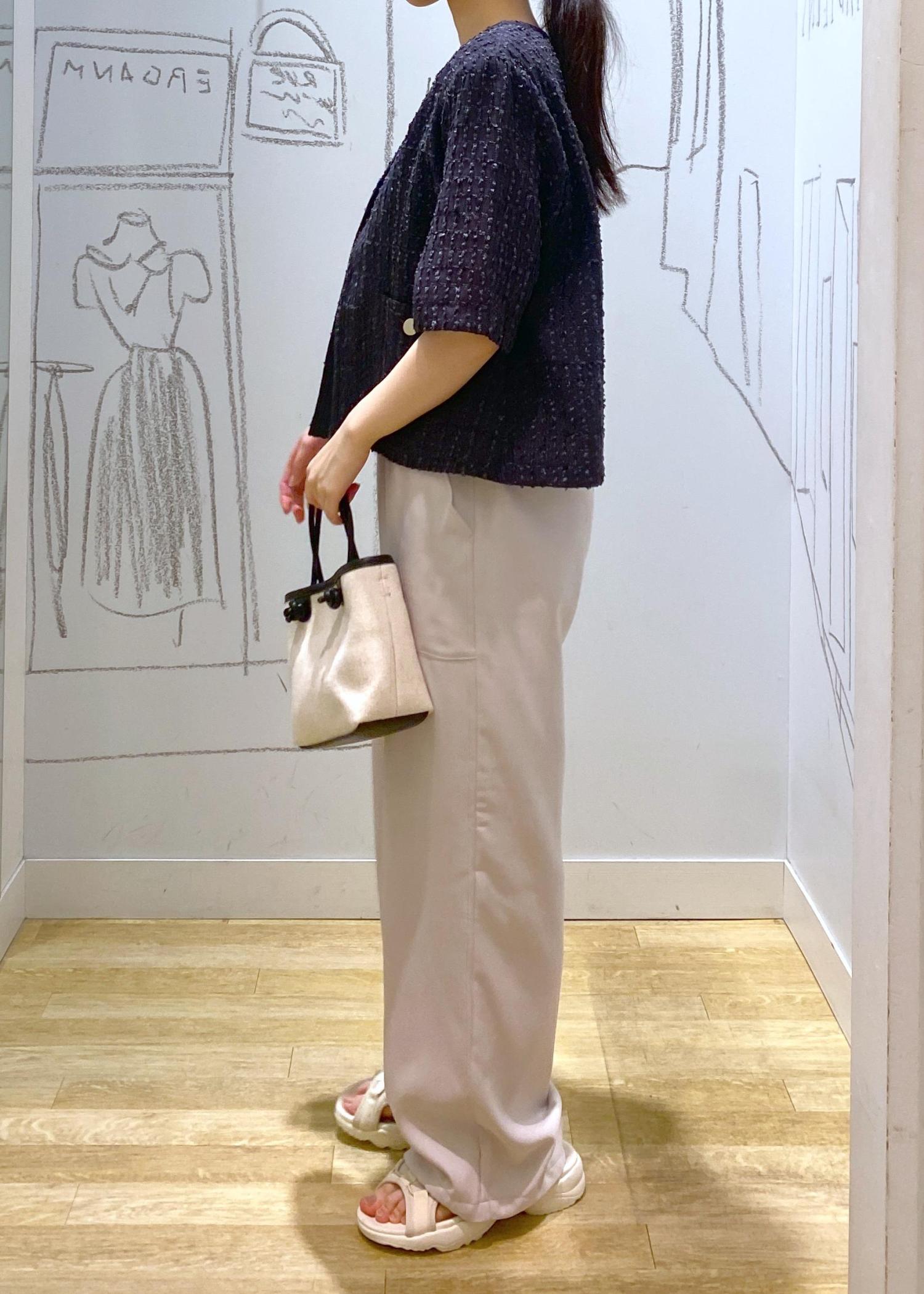 ツイードジャケットと大人っぽいアイテムにワイドパンツを合わせることでカジュアルっぽさも出しました◎