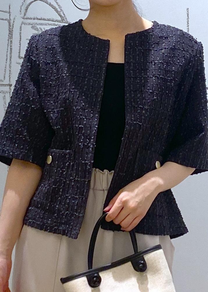 アウトレットROPÉ PICNIC【サマー・ツイード】ハーフスリーブジャケットチャコール / 38¥4,495レビューシンプルなツイードジャケットに金ボタンが付いていることで高見えが叶います◎