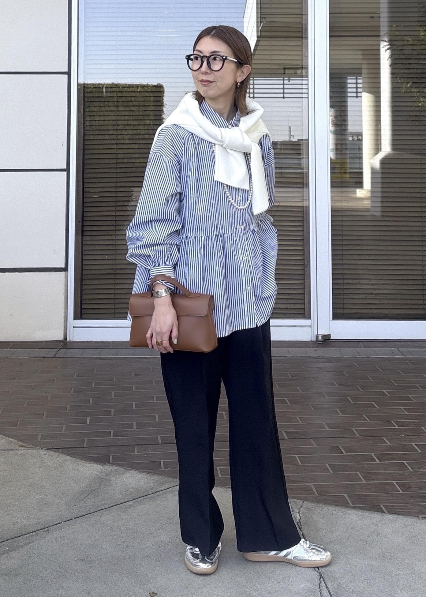 ブラウン×ブルーのレイヤード秋コーデ