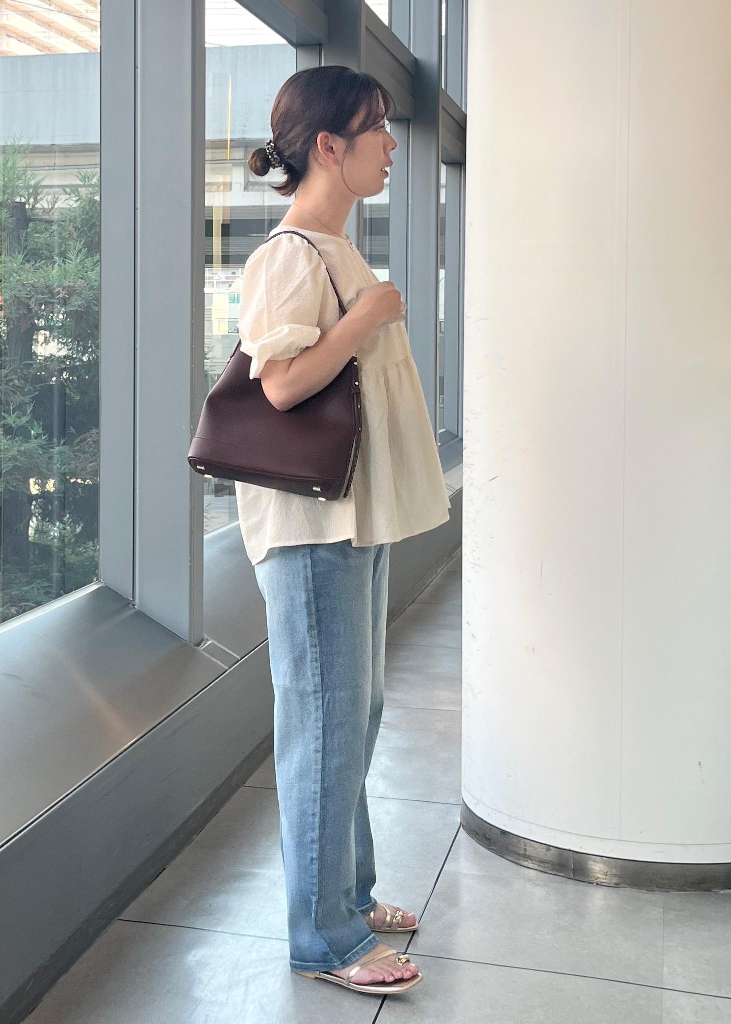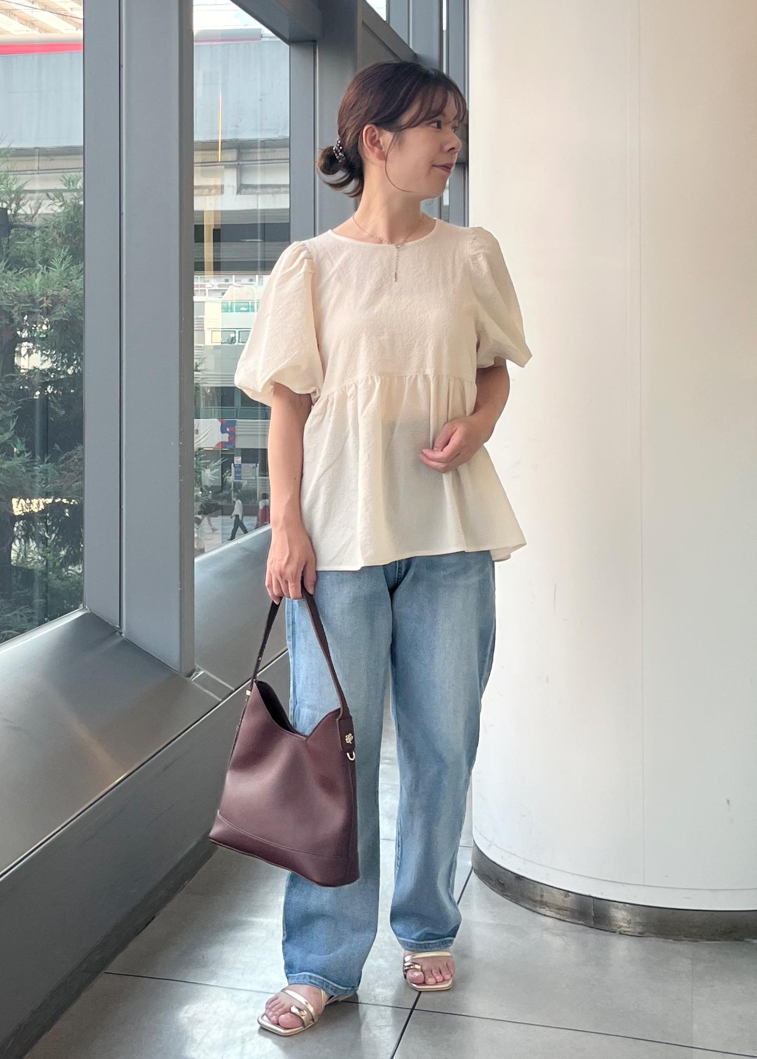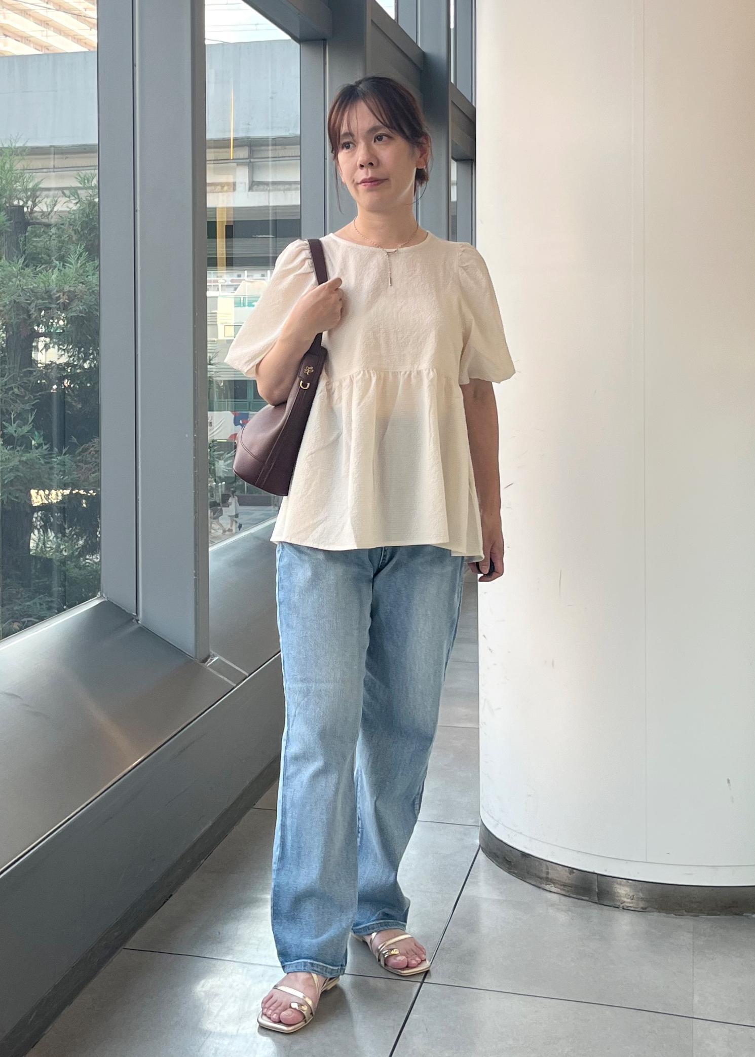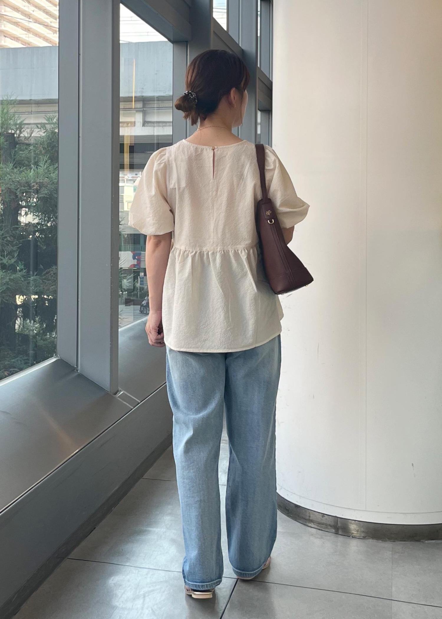 ポコポコした生地感が可愛いペプラムブラウスをデニムで合わせました(^_^)