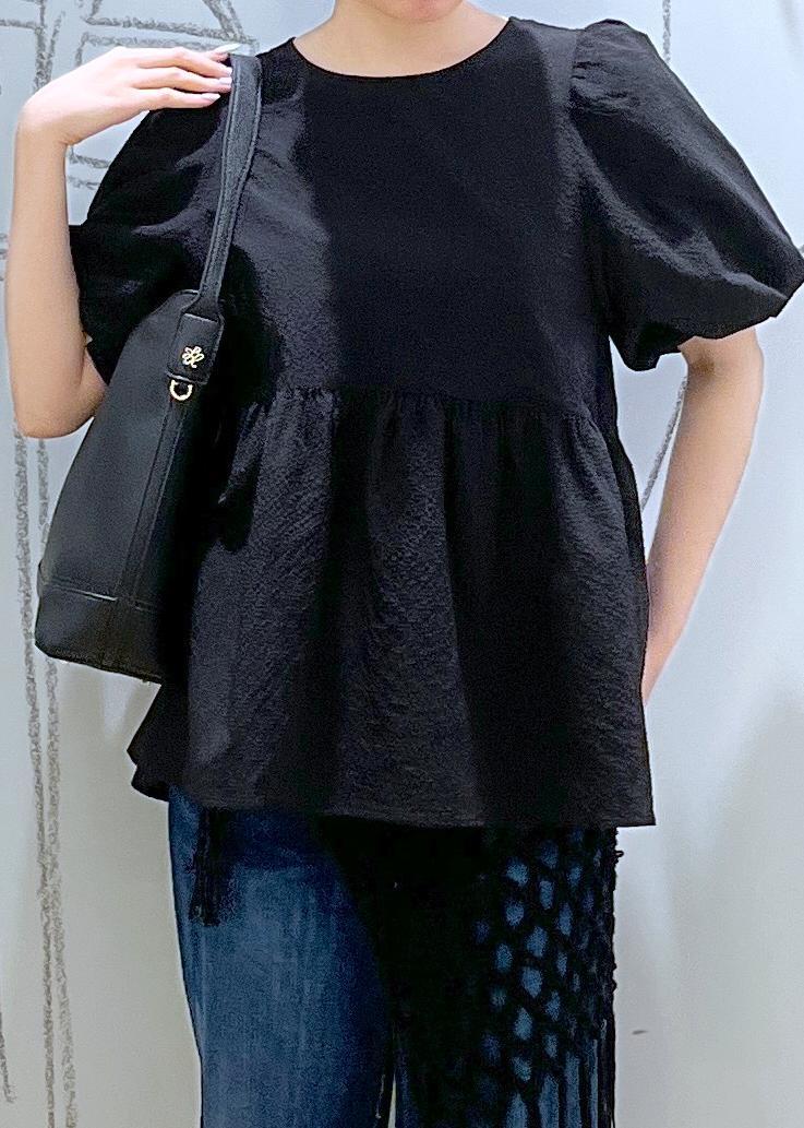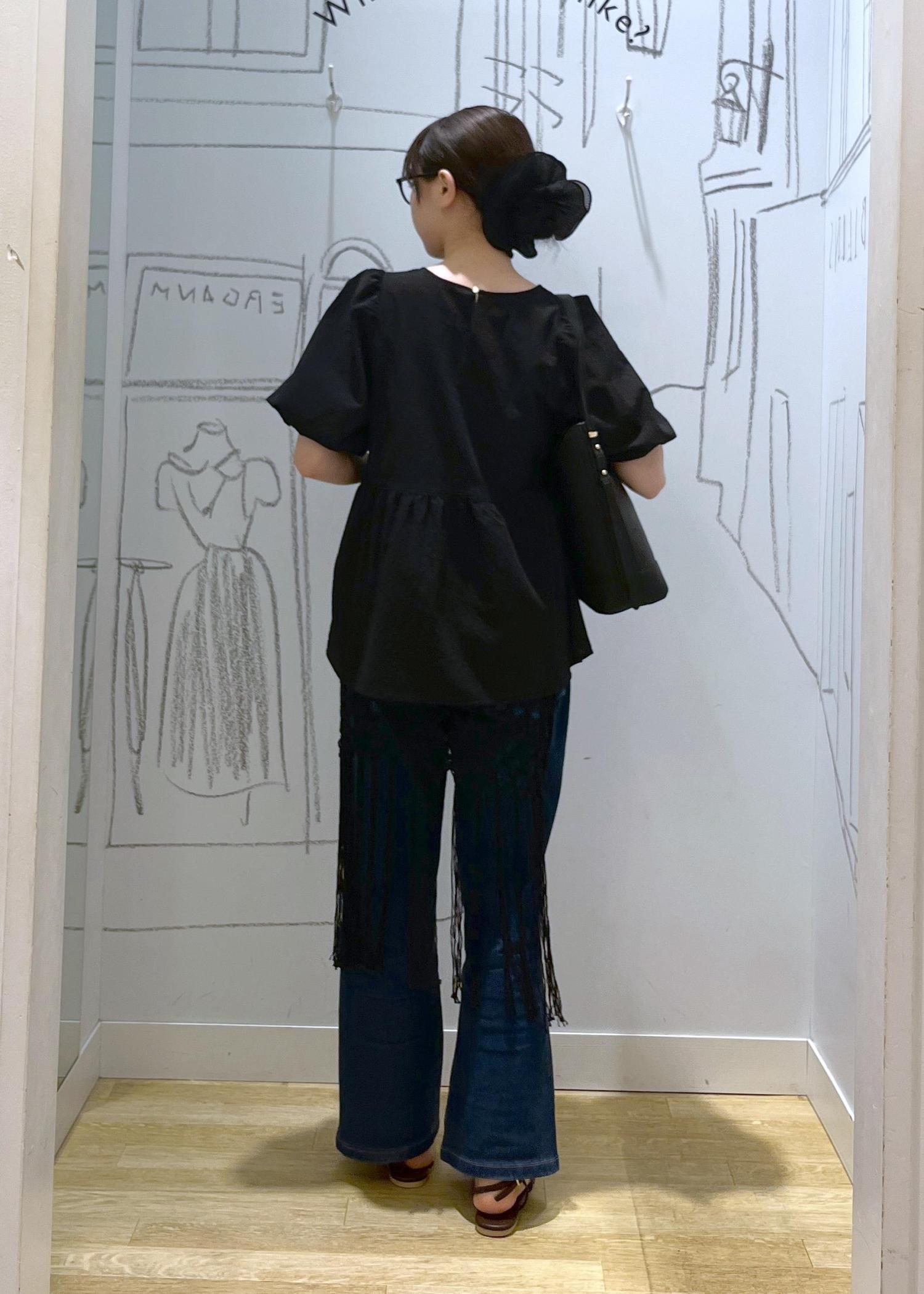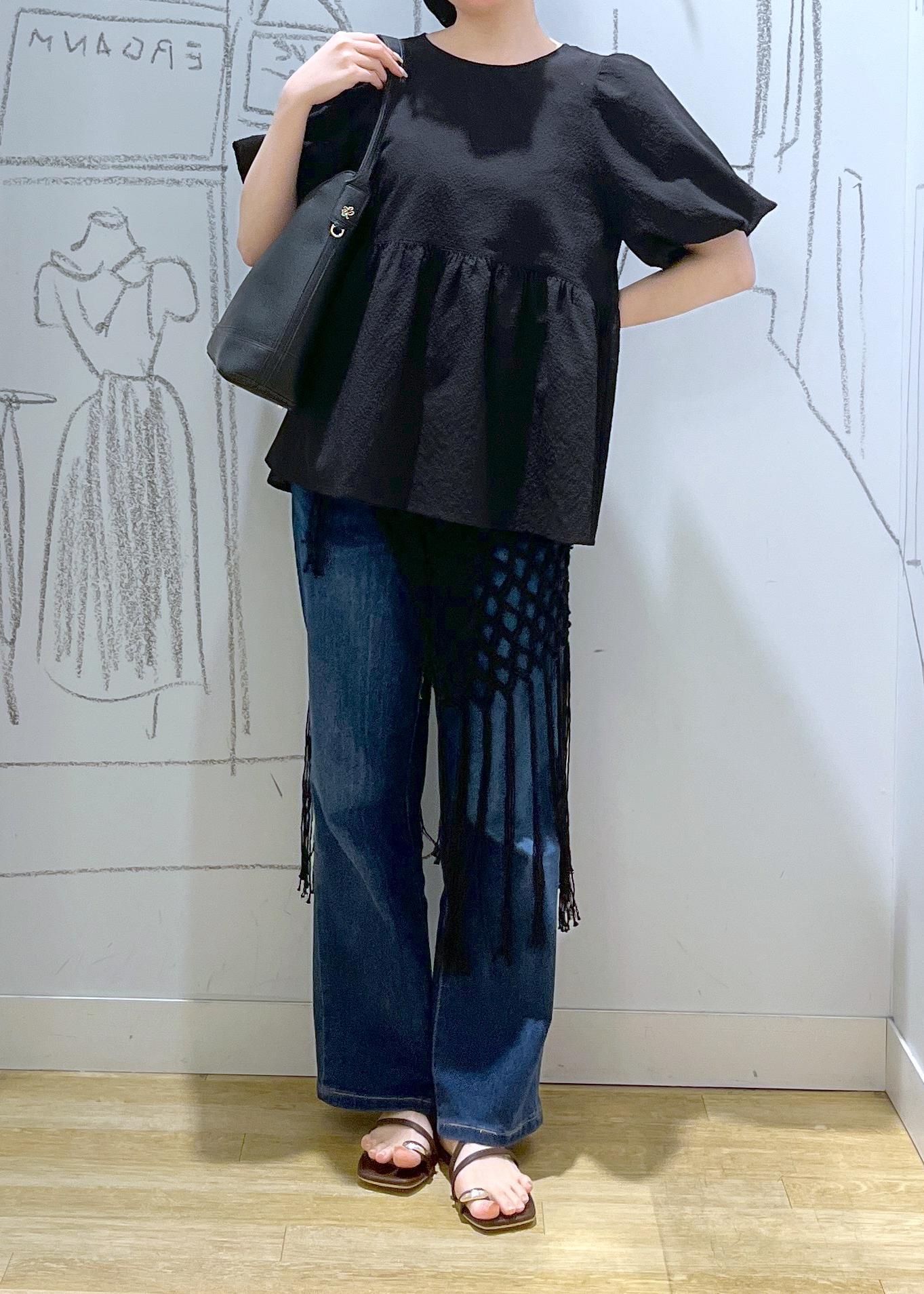 バルーンスリーブのブラウスに細身のデニムを合わせ、