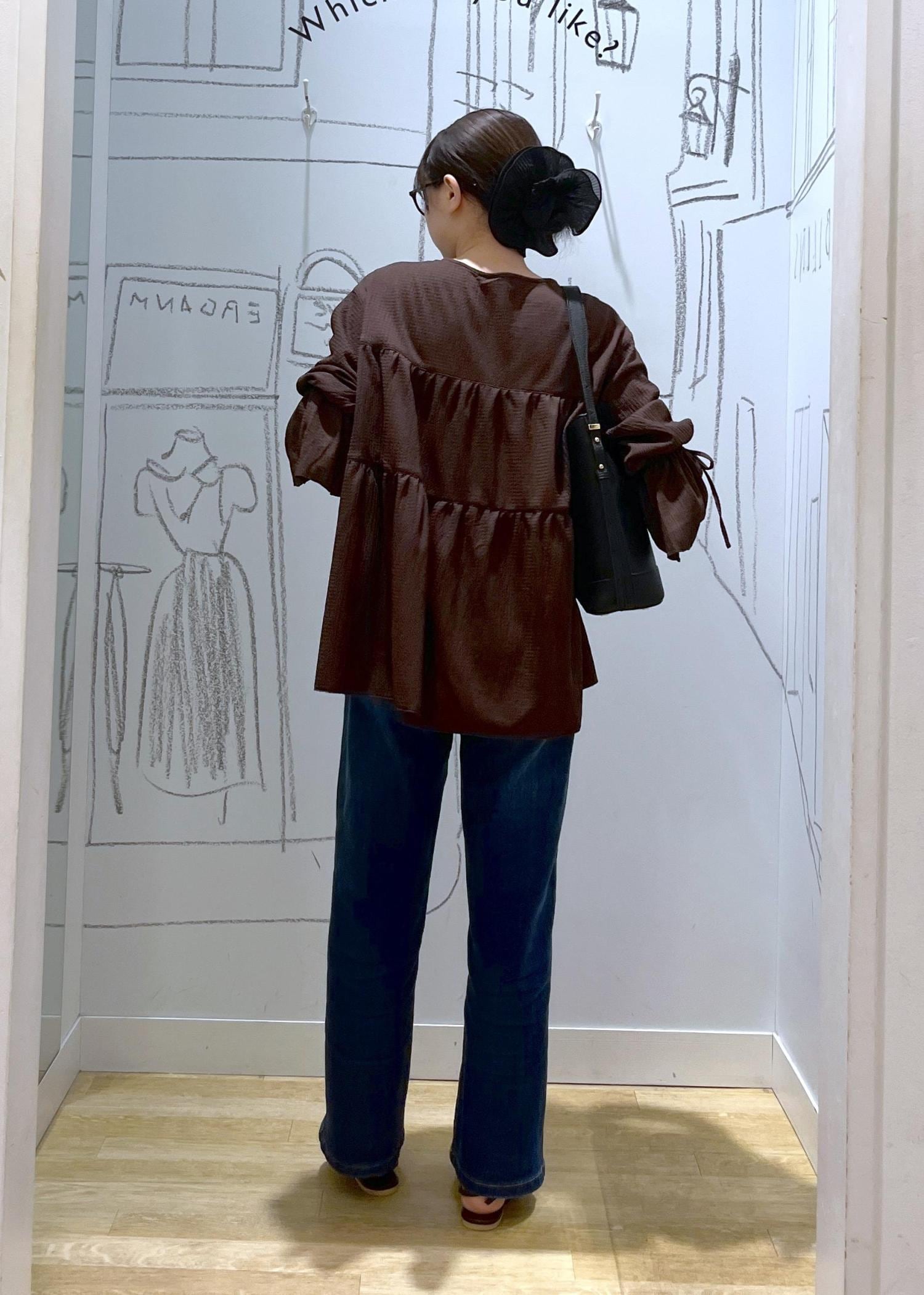 カーディガンの袖口とフレアデニムで形を合わせ、