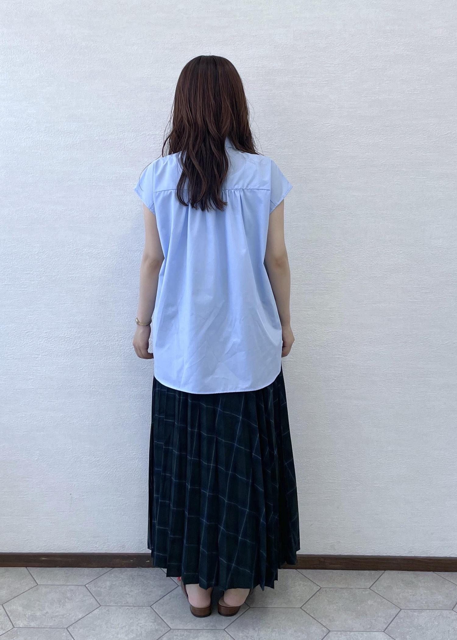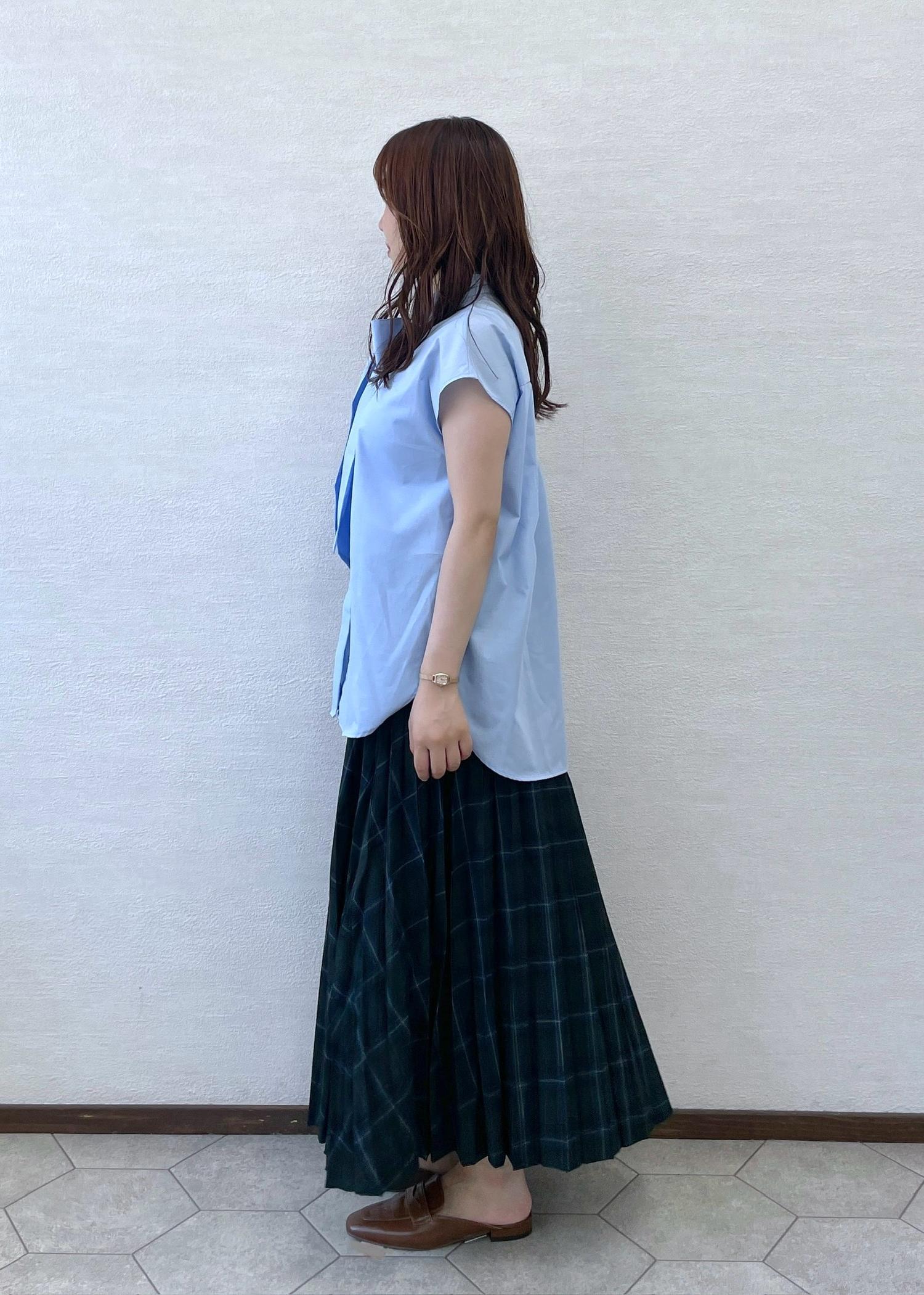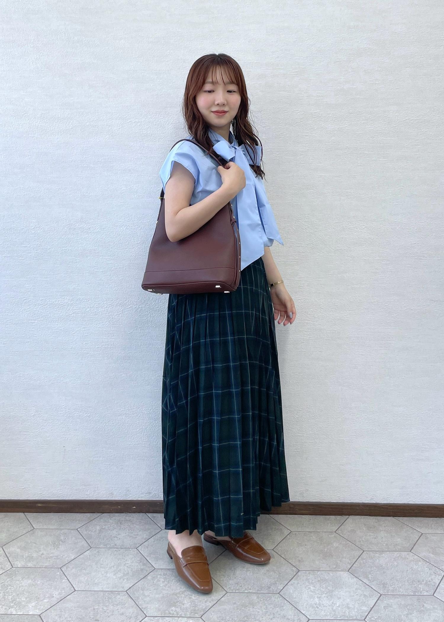 ブルーシャツにチェックのスカートがとても可愛いです!小物はブラウンで合わせました!全体的に落ち着いた色ですが、どれも生地が薄く涼しい素材なので今からでも着ていただけます!