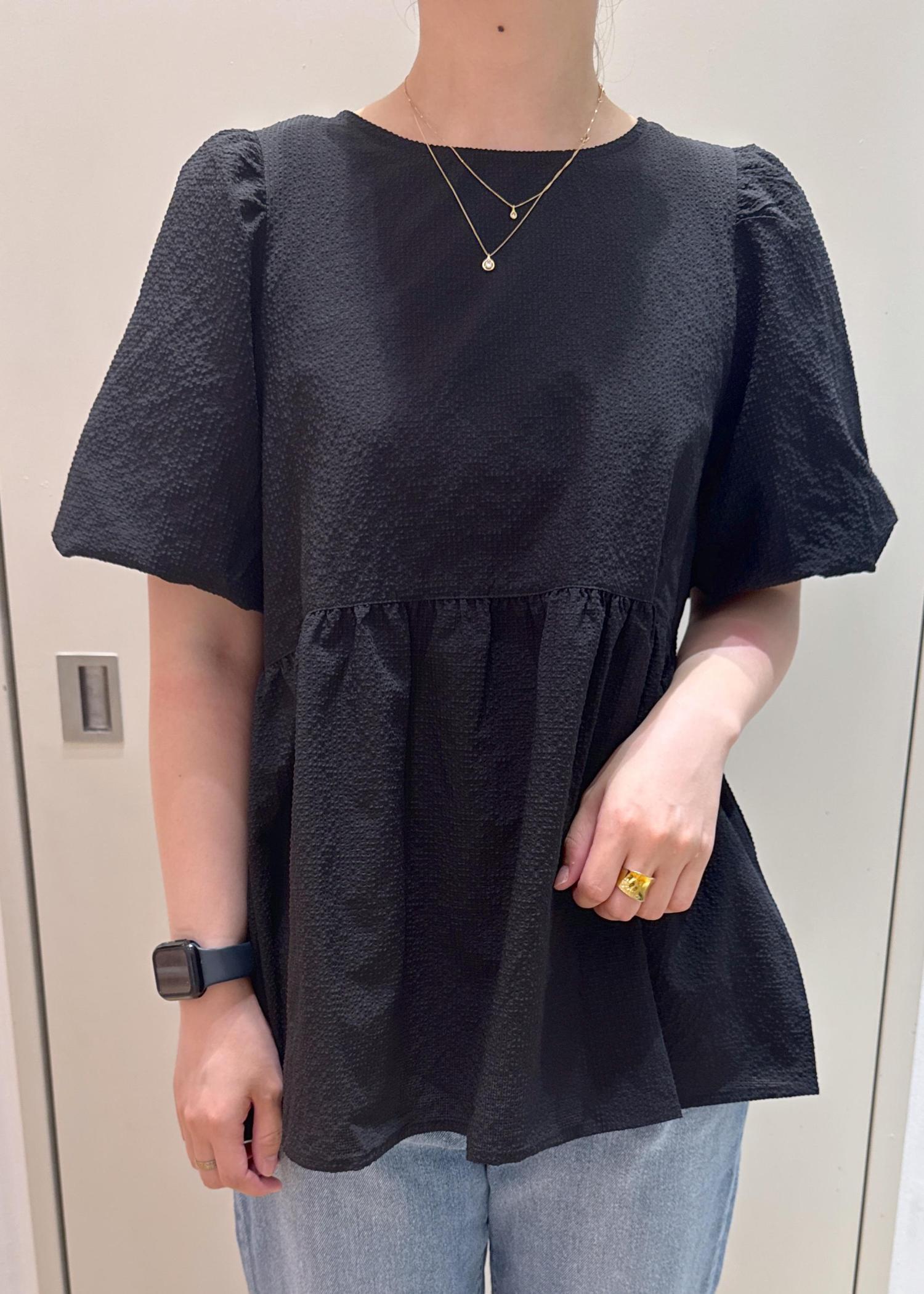 バルーンのような袖のペプラムブラウスに、デニムを合わせたきれいめ感のあるカジュアルコーデです。