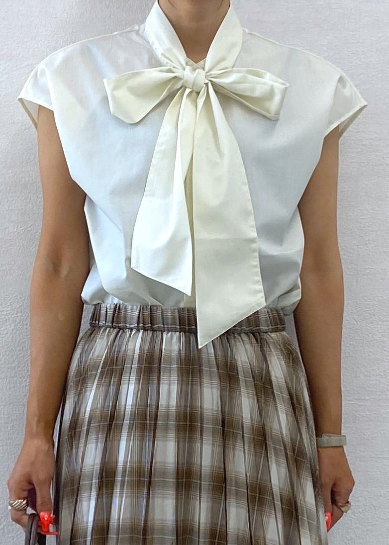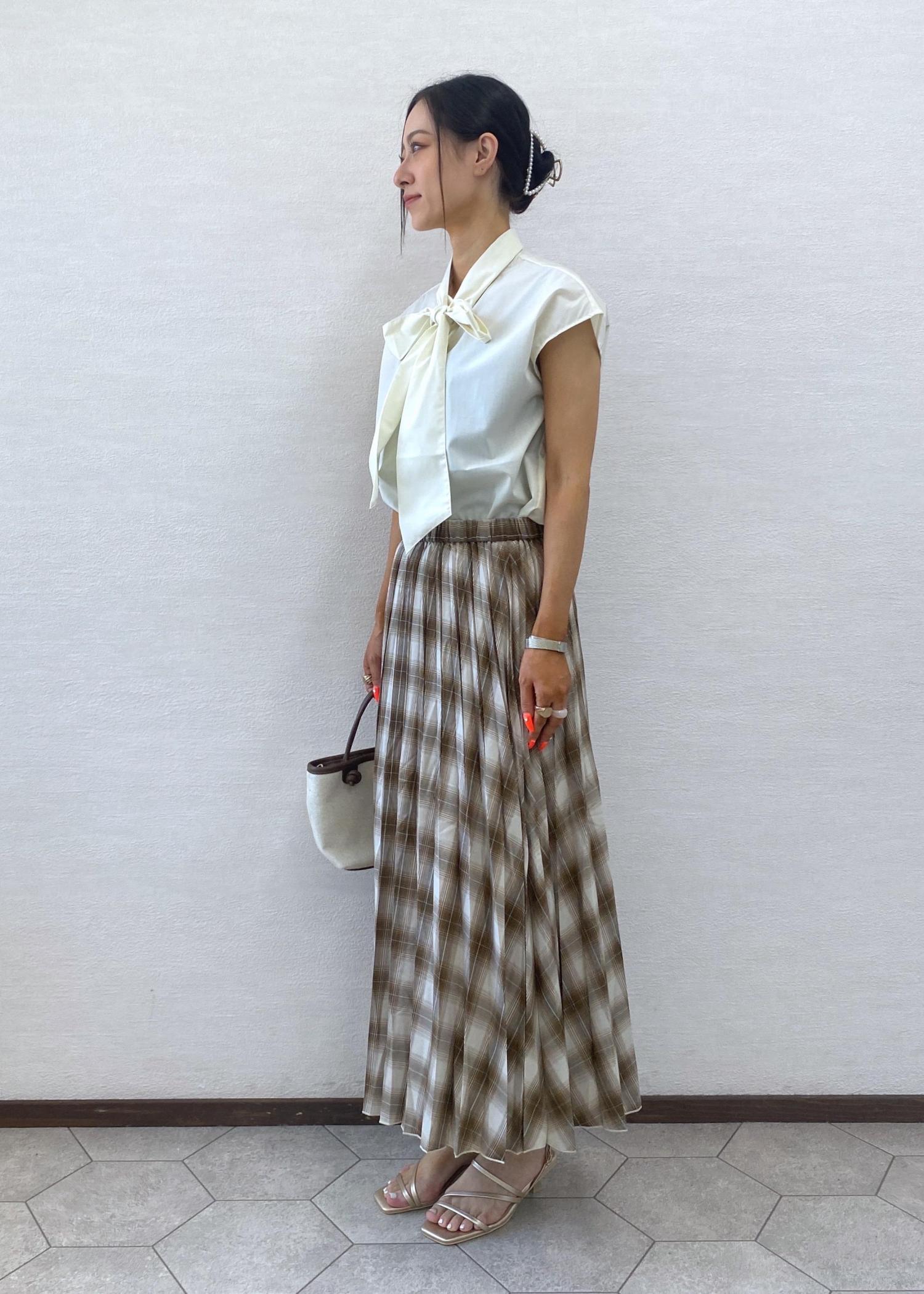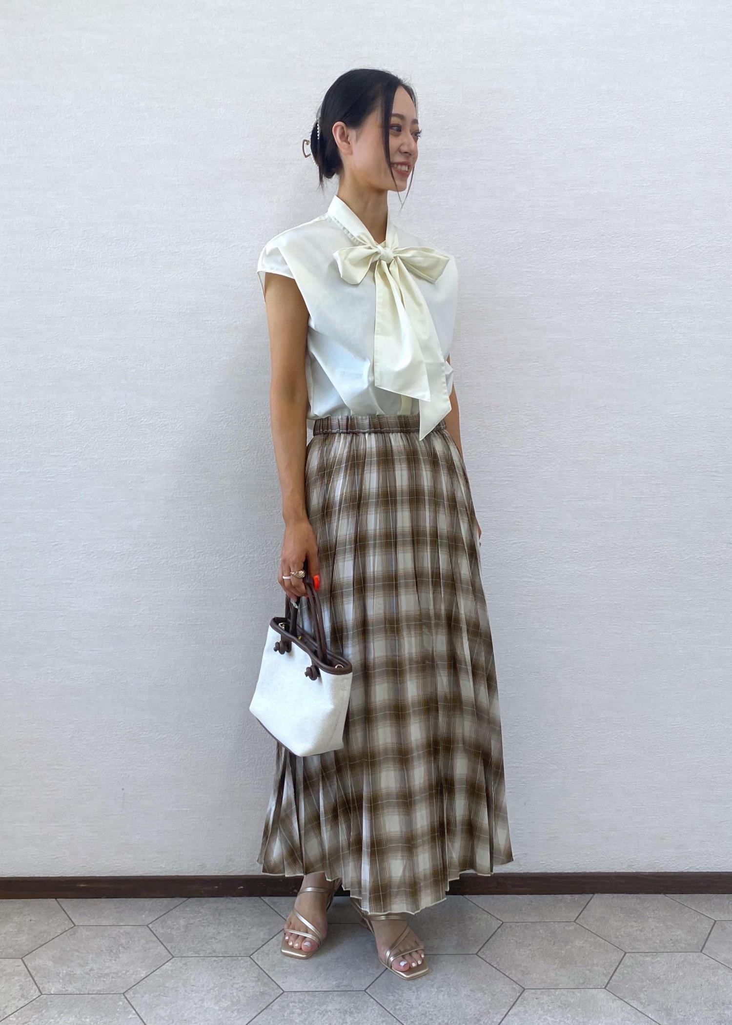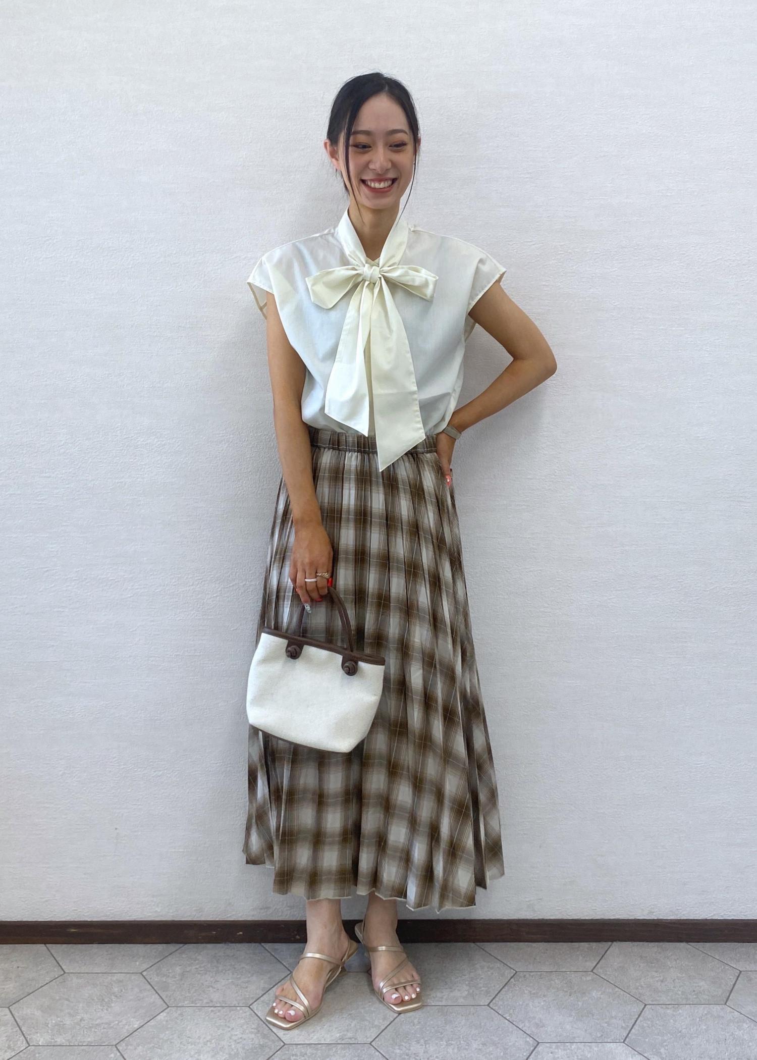 大きいボウタイリボンが可愛いブラウスにチェック柄のスカートを合わせた秋を先取りできるコーディネートです。