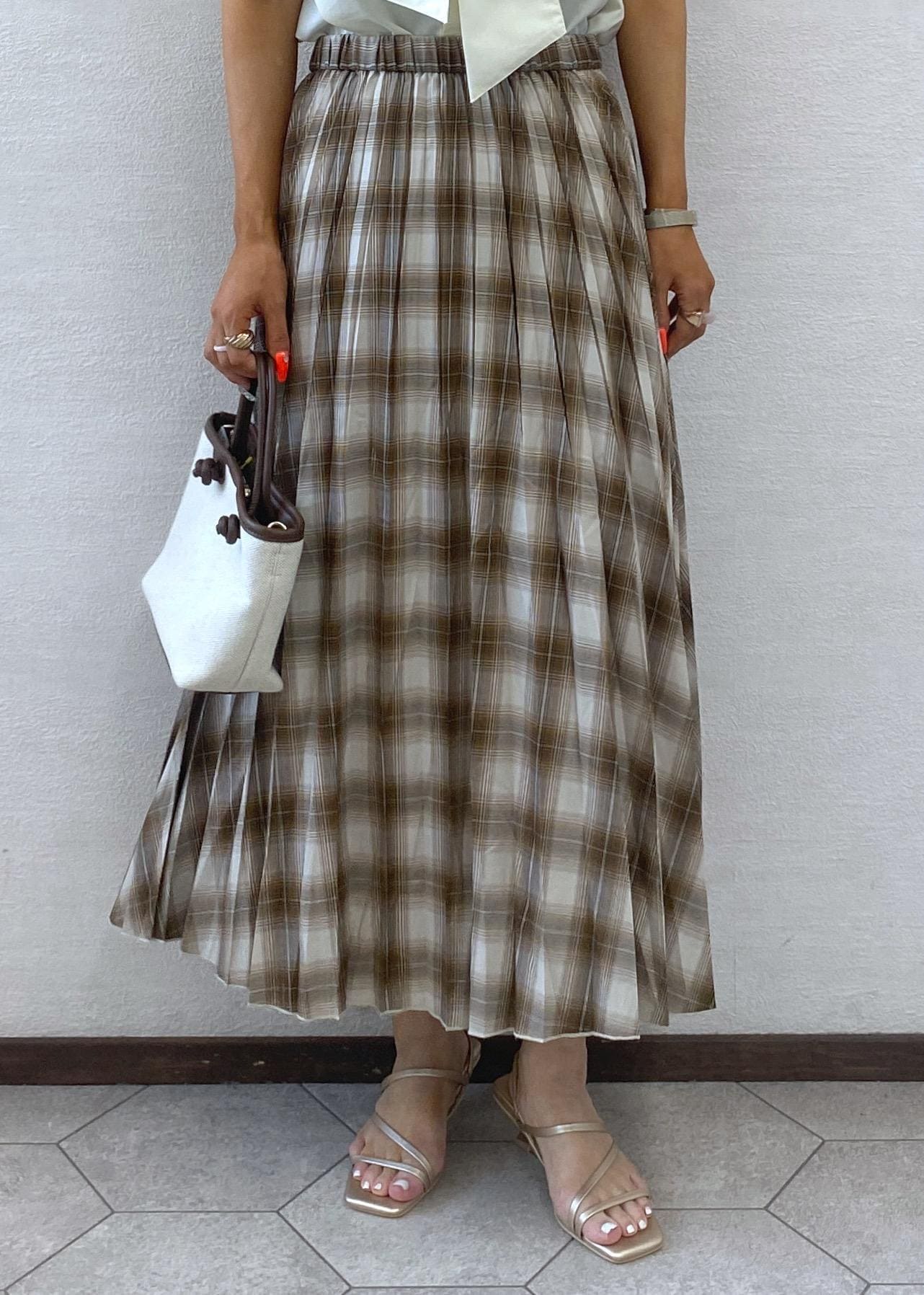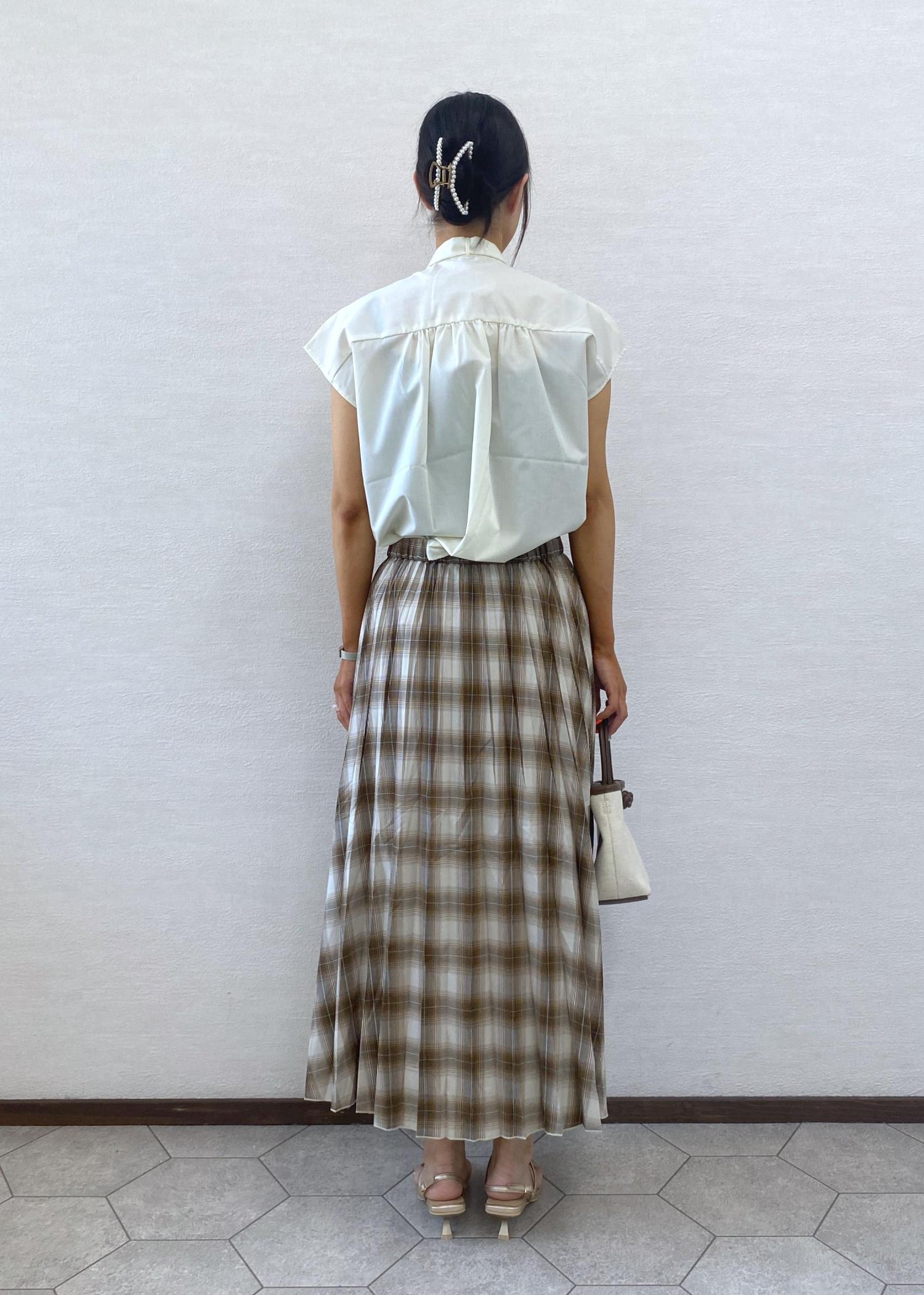 チェック柄プリーツスカートの大人フェミニンコーデ