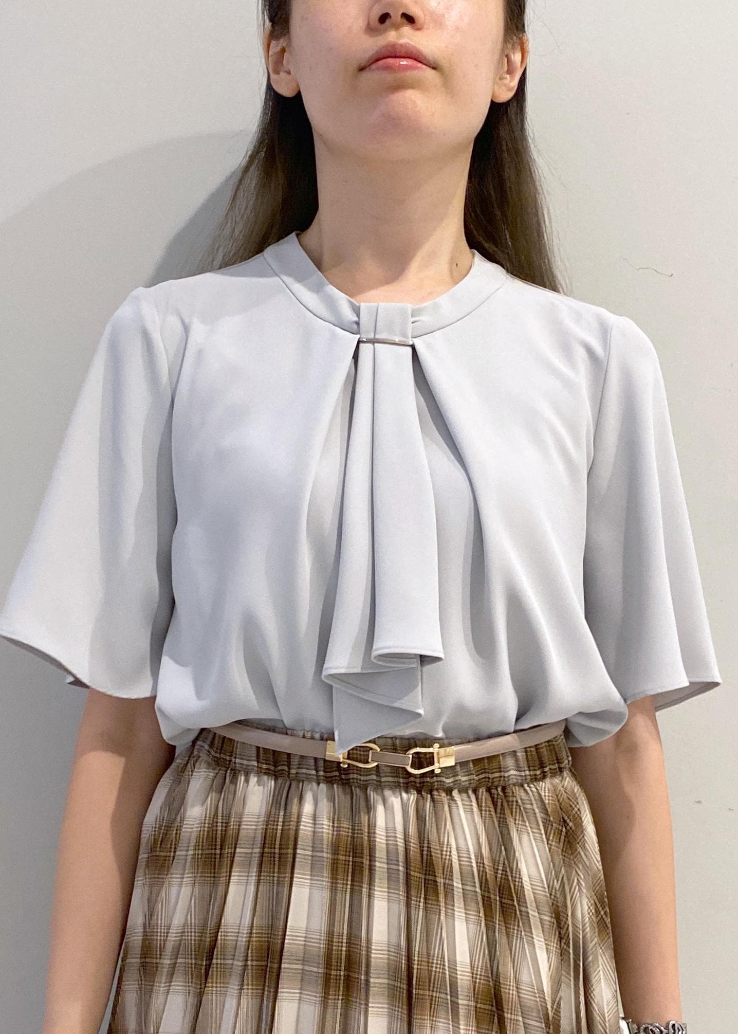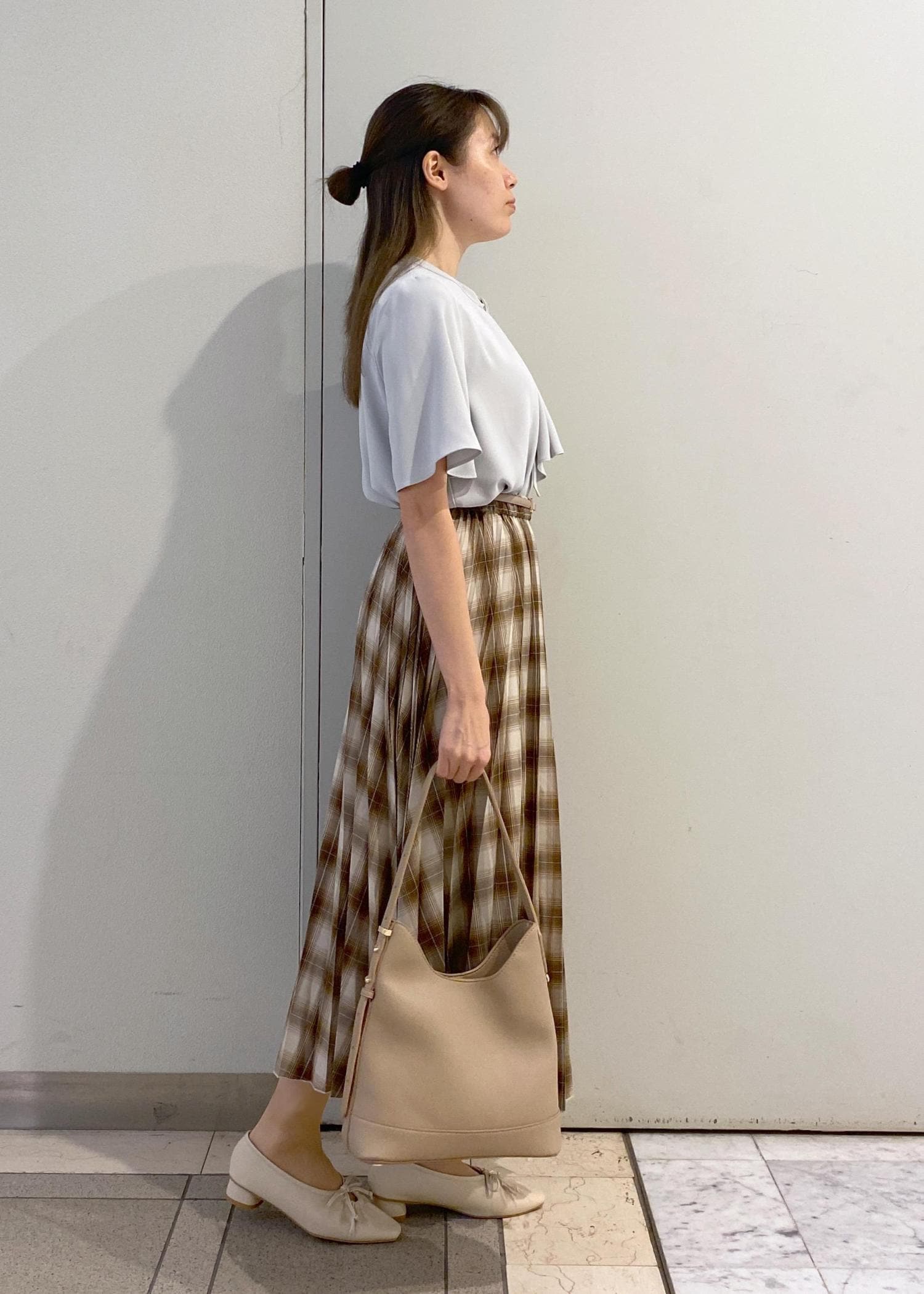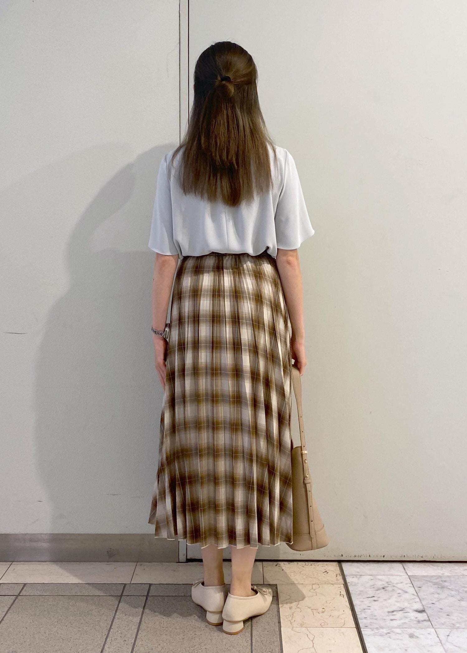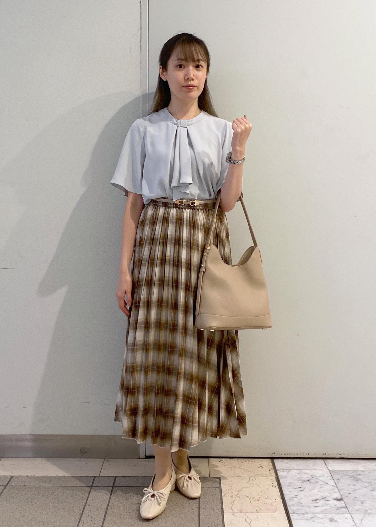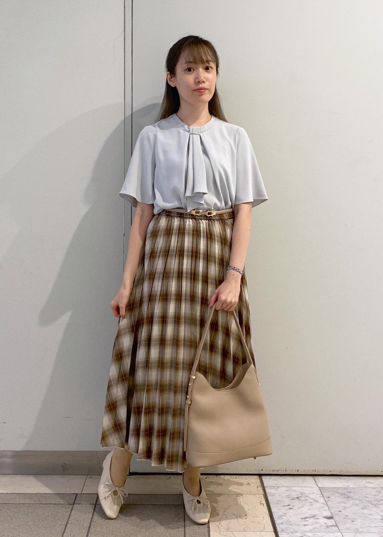 “きちんと感”のあるブラウスにチェックのプリーツスカートを合わせた、きれいめフェミニンなコーディネート。