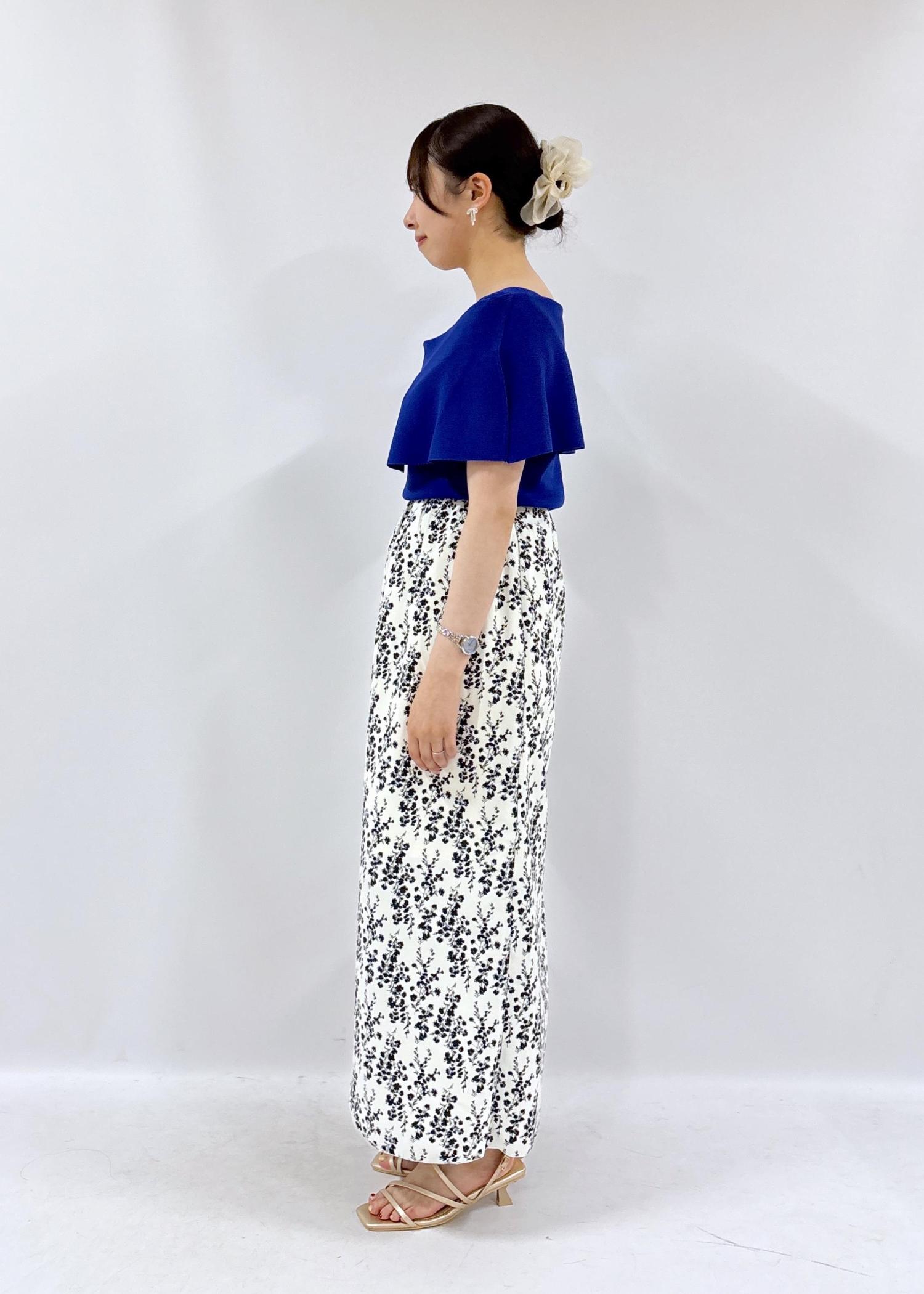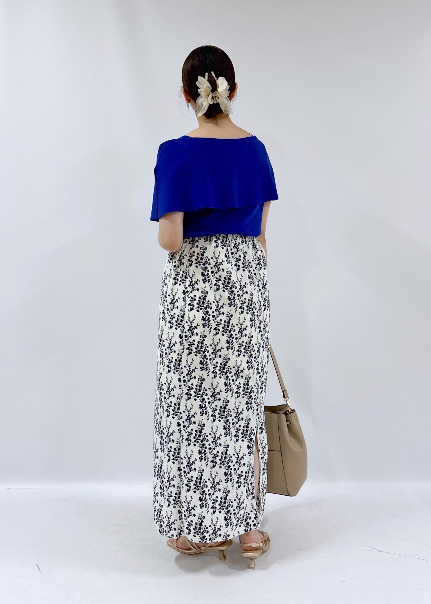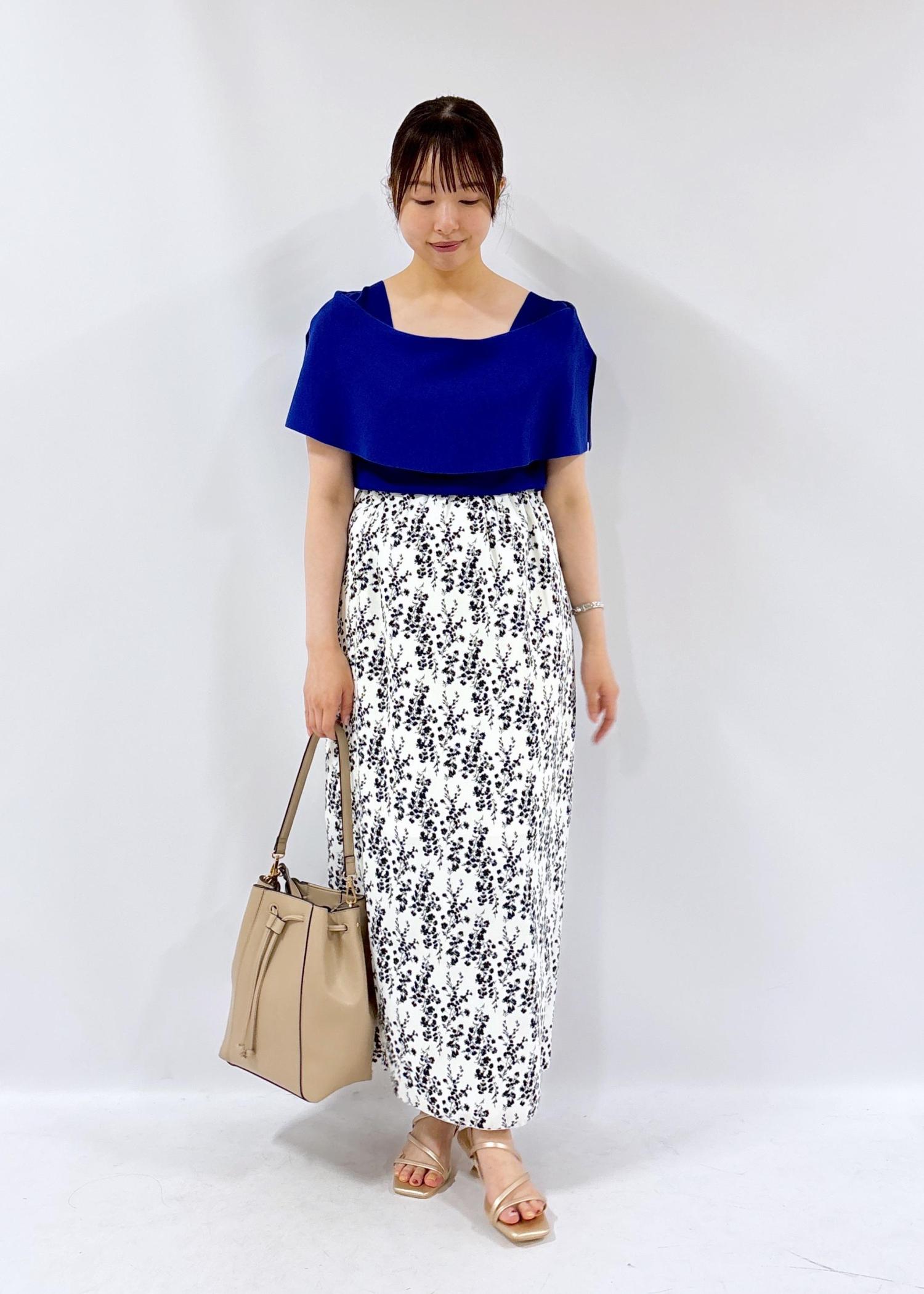 夏らしい大人っぽい雰囲気のコーデです。ケープニットは二の腕を隠しつつも、デコルテをしっかり見せてくれる華やかなアイテムになっております。ぜひ、夏のデートにオススメなコーデです♪