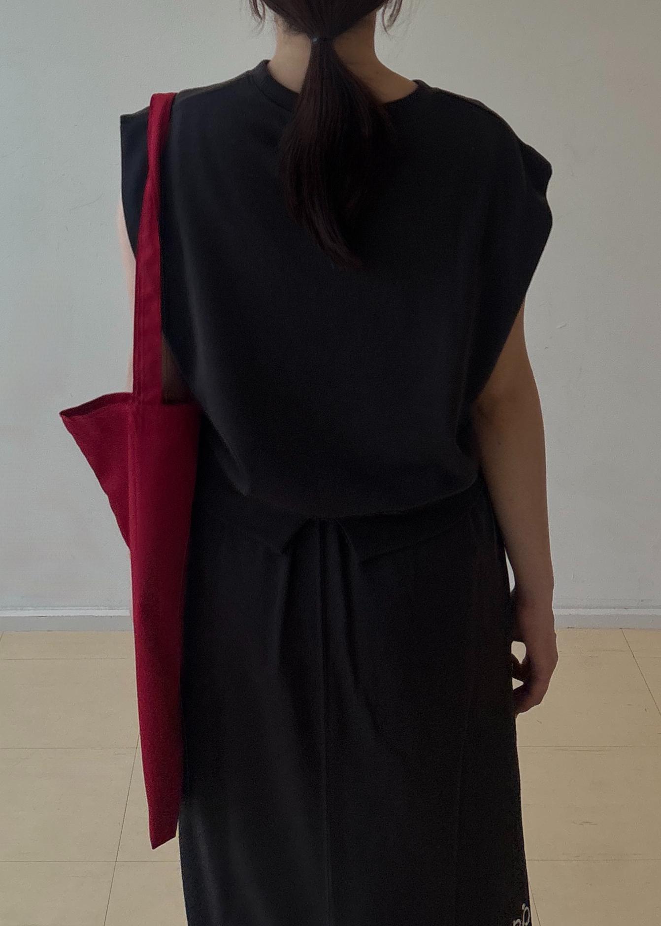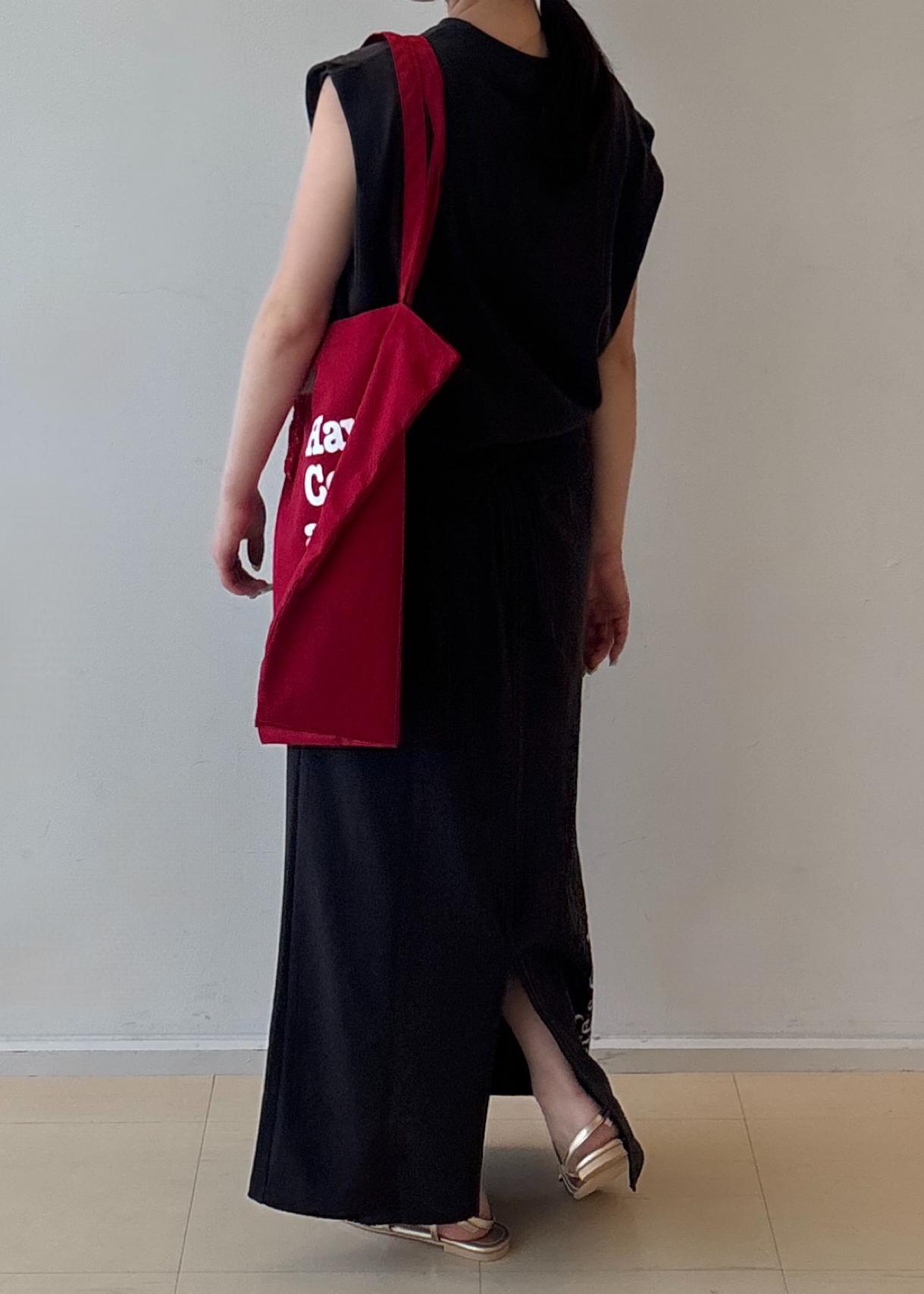 足元は抜け感のあるサンダルで軽さを出し、赤のトートバッグでアクセントを効かせたスタイリングがポイント!