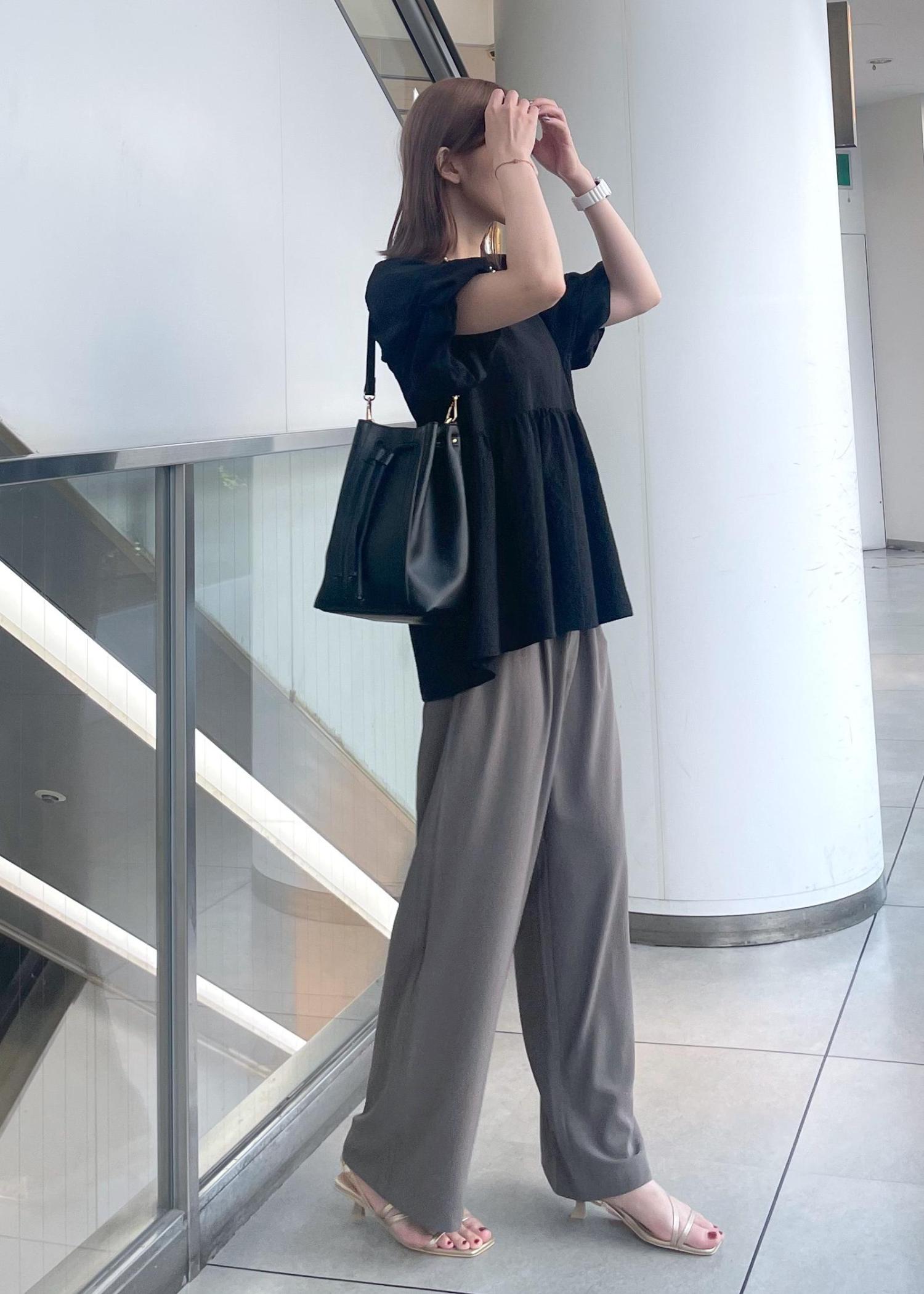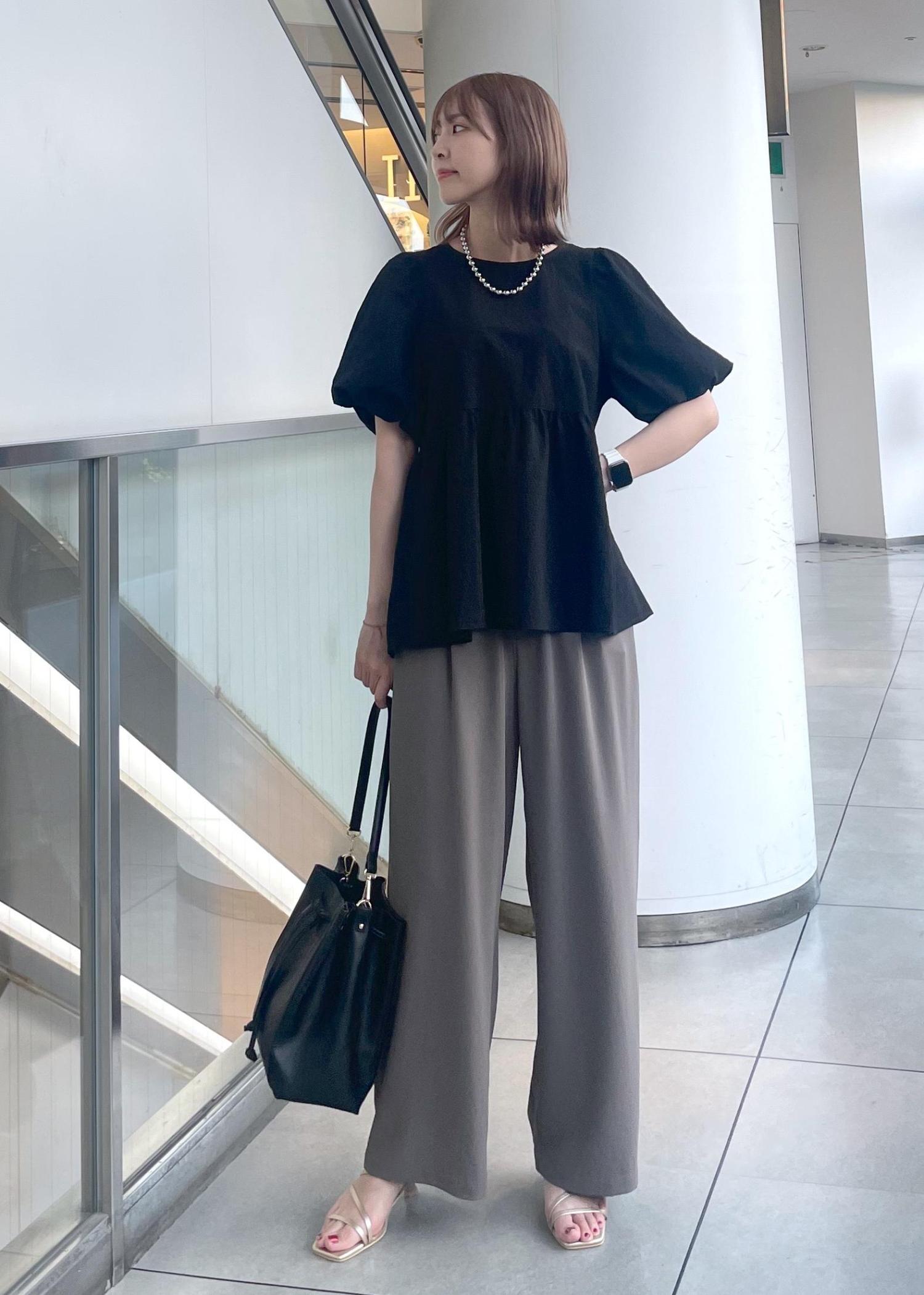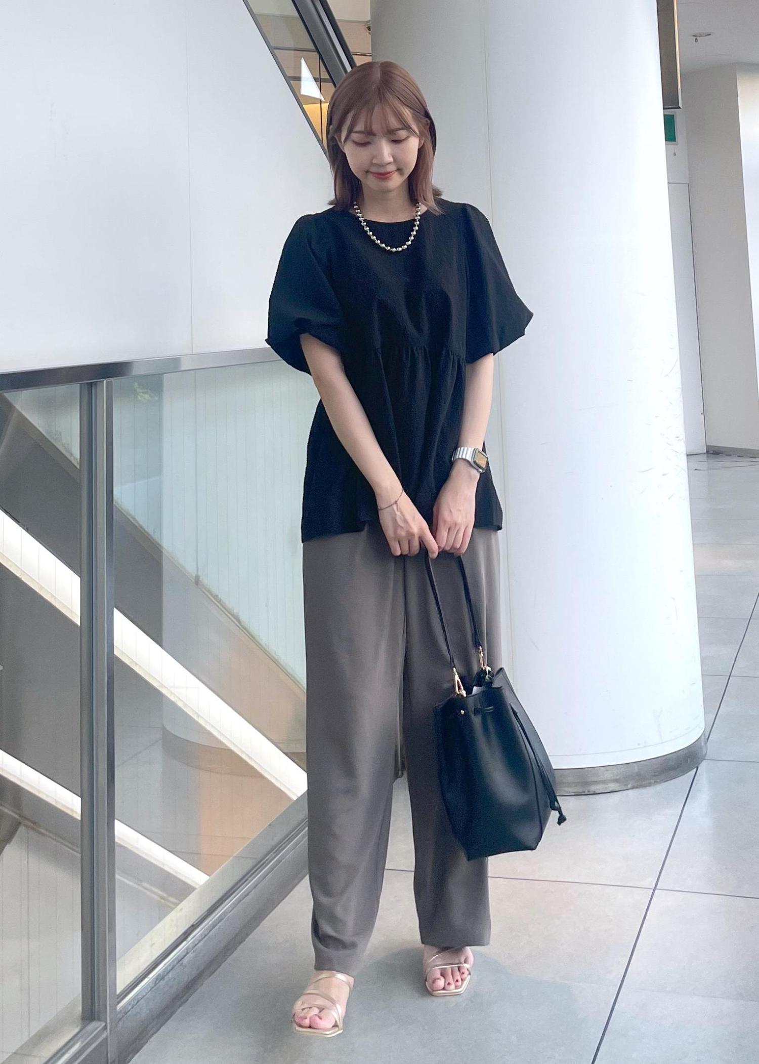 体型カバーにもなるペプラムブラウスは、生地も薄くて涼しいのでこの夏に重宝するアイテムです。ボトムスはスッキリ見えのジョグパンツがオススメスタイルです。