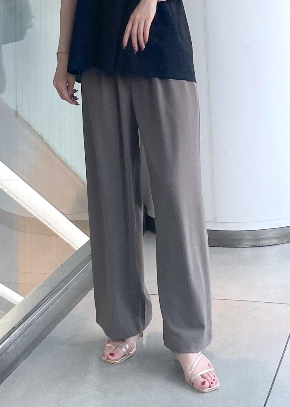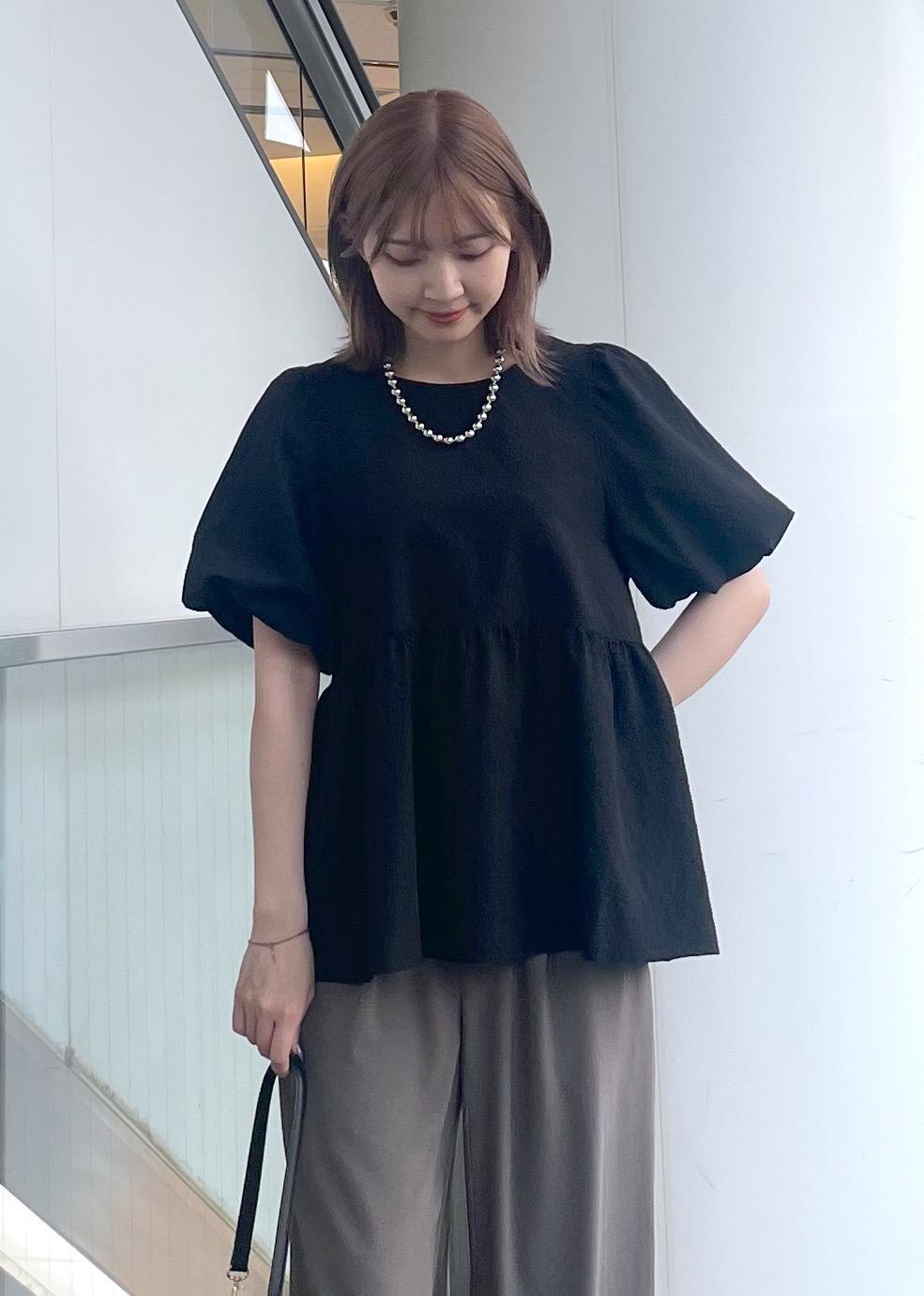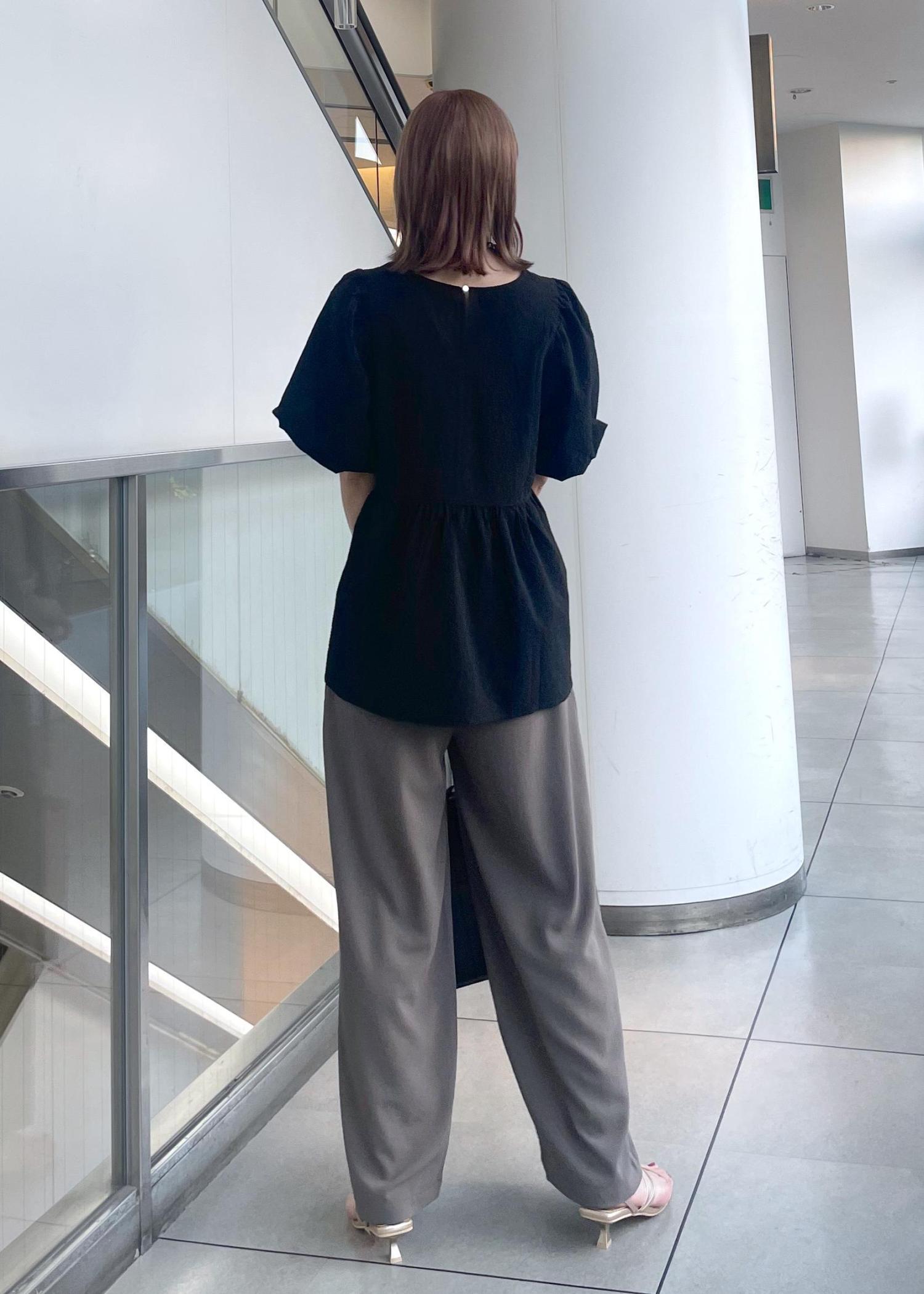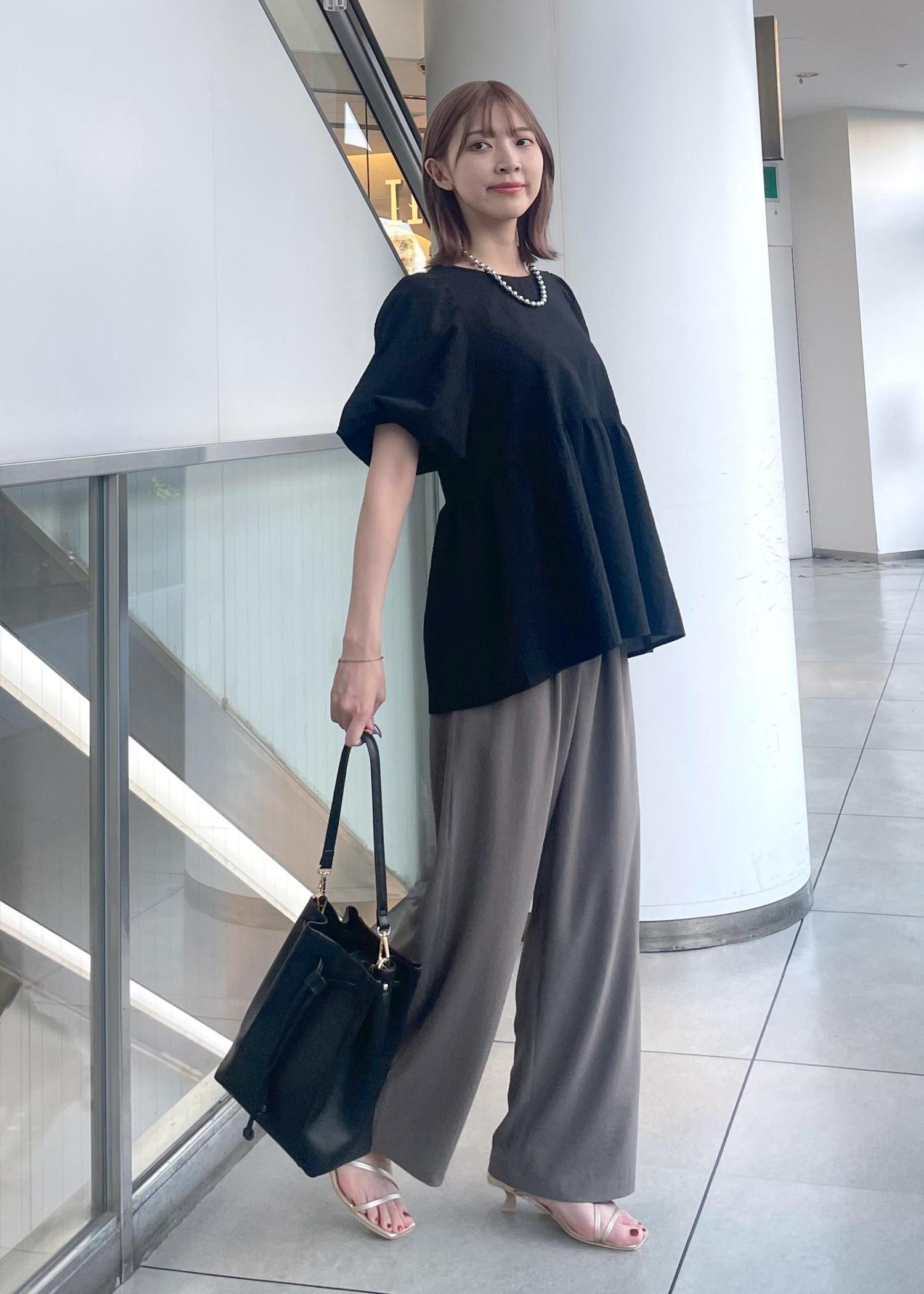 体型カバーにもなるペプラムブラウスは、生地も薄くて涼しいのでこの夏に重宝するアイテムです。ボトムスはスッキリ見えのジョグパンツがオススメスタイルです。