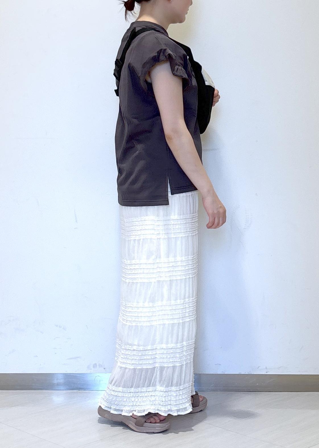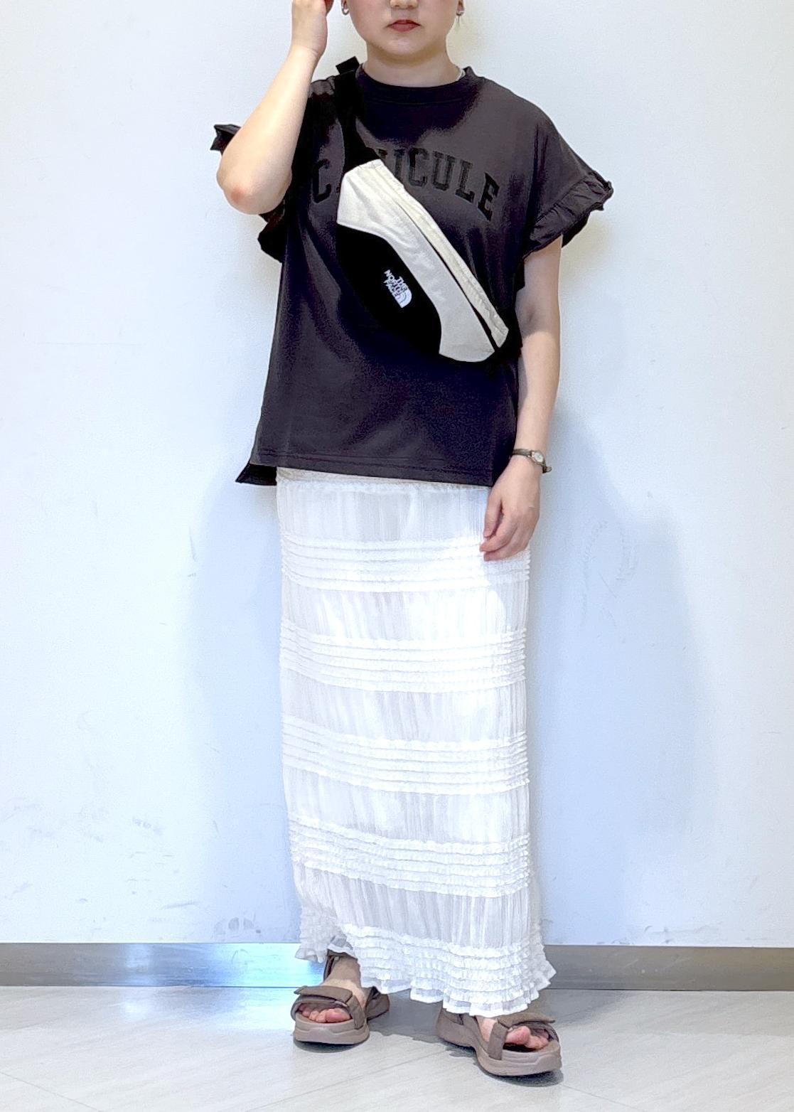カジュアルにまとめすぎず、少し甘めのスカートを合わせたところがポイントです。