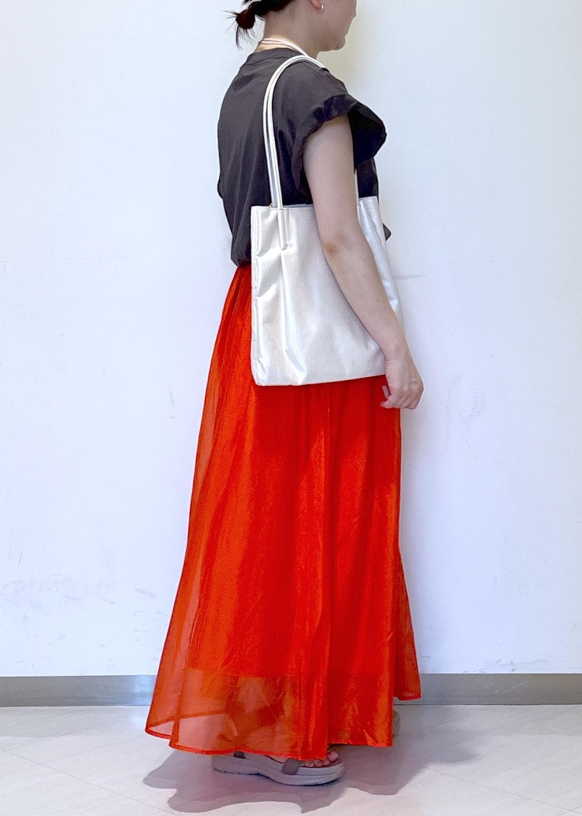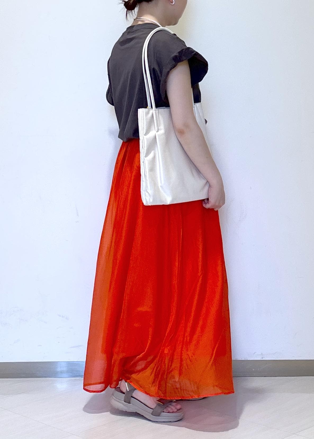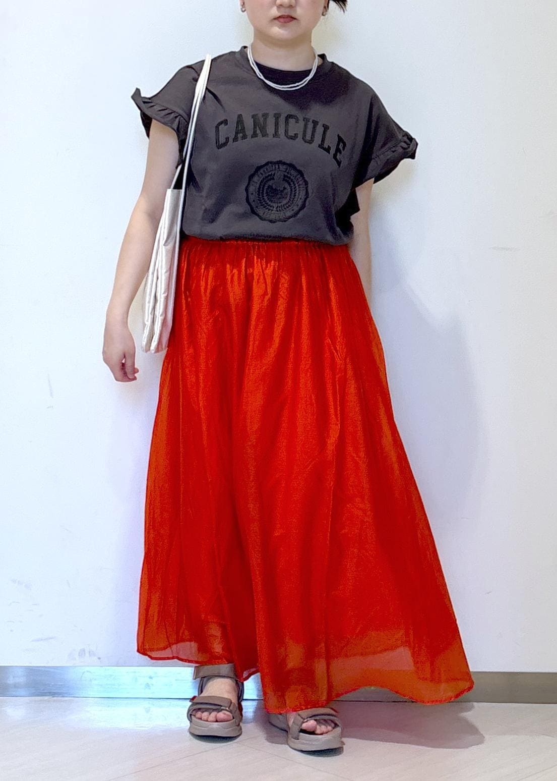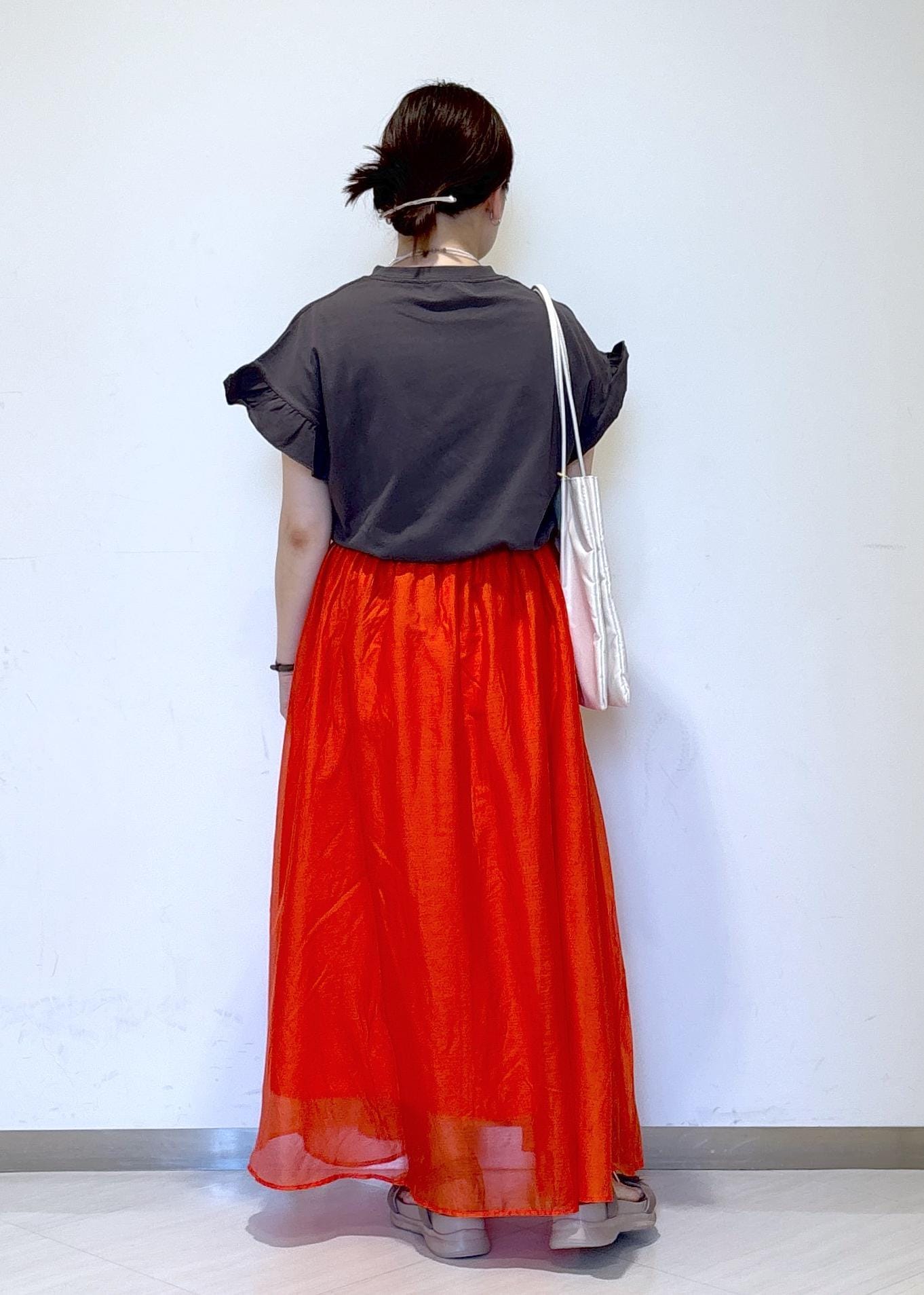 ROPÉ PICNICエアリーシアーギャザーロングスカートオレンジ / 38¥6,490レビュー私はウェスト周りがしっかりしているので、着膨れしないか心配でしたが、想像よりもボリュームはありませんでした◎