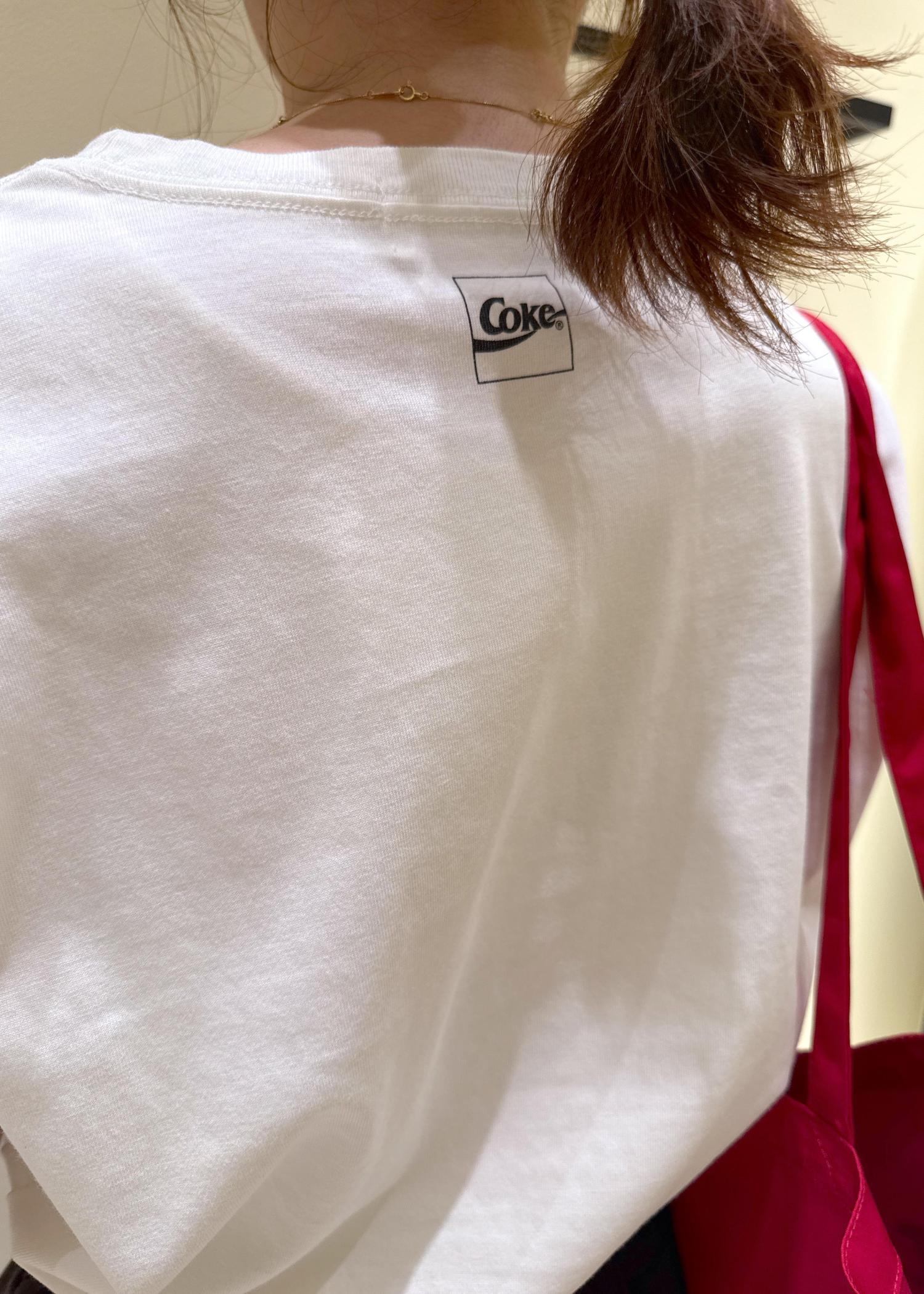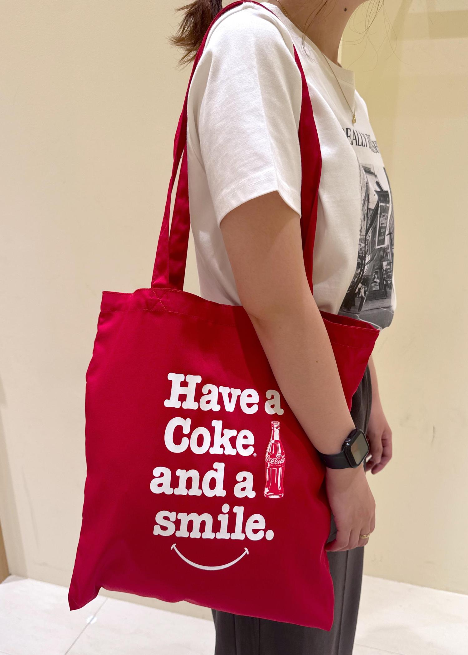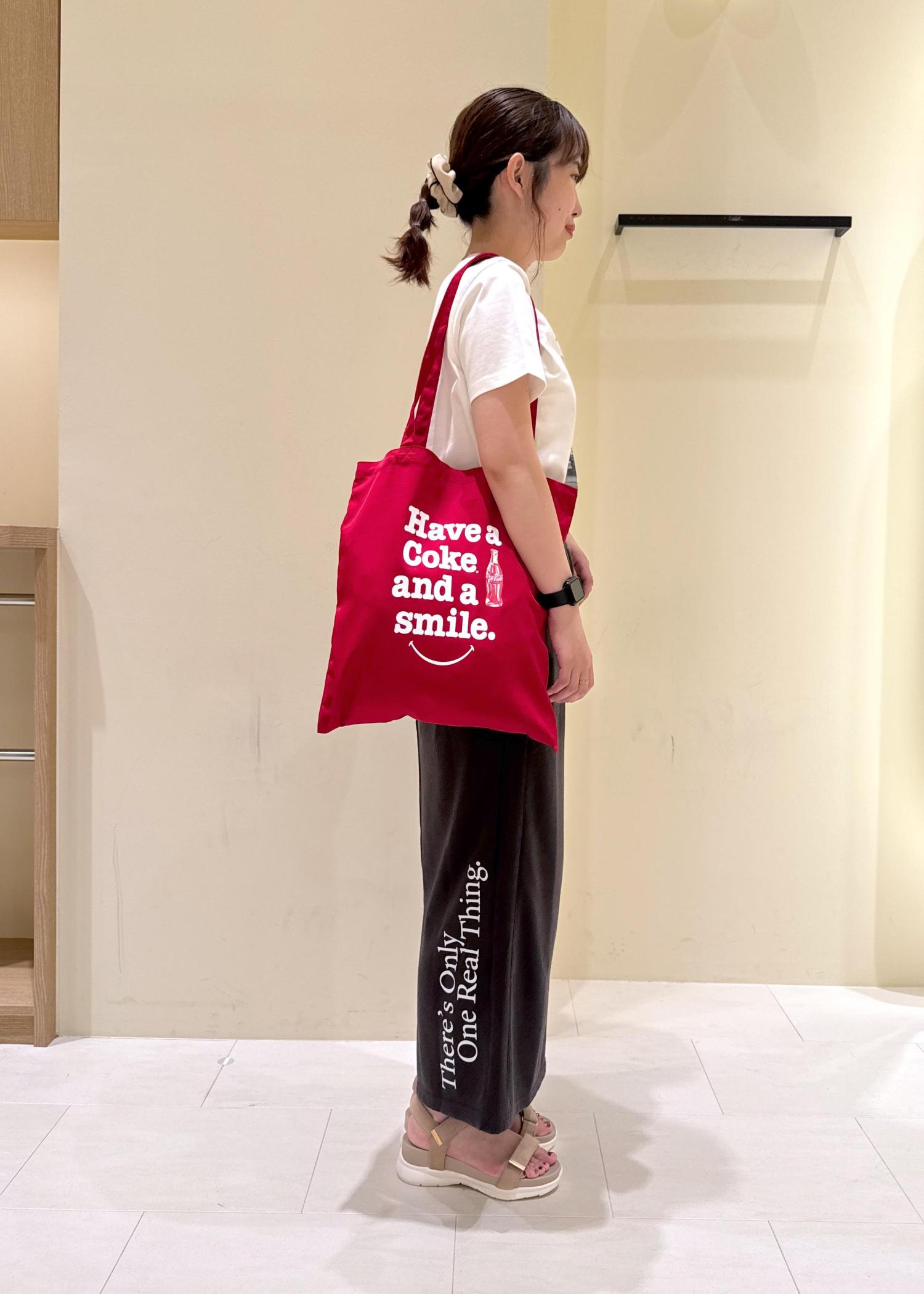 Coca-Cola Special CollectionのTシャツ、ミニ裏毛タイトスカート、さらにトートバッグも一緒に合わせたカジュアルコーデです。