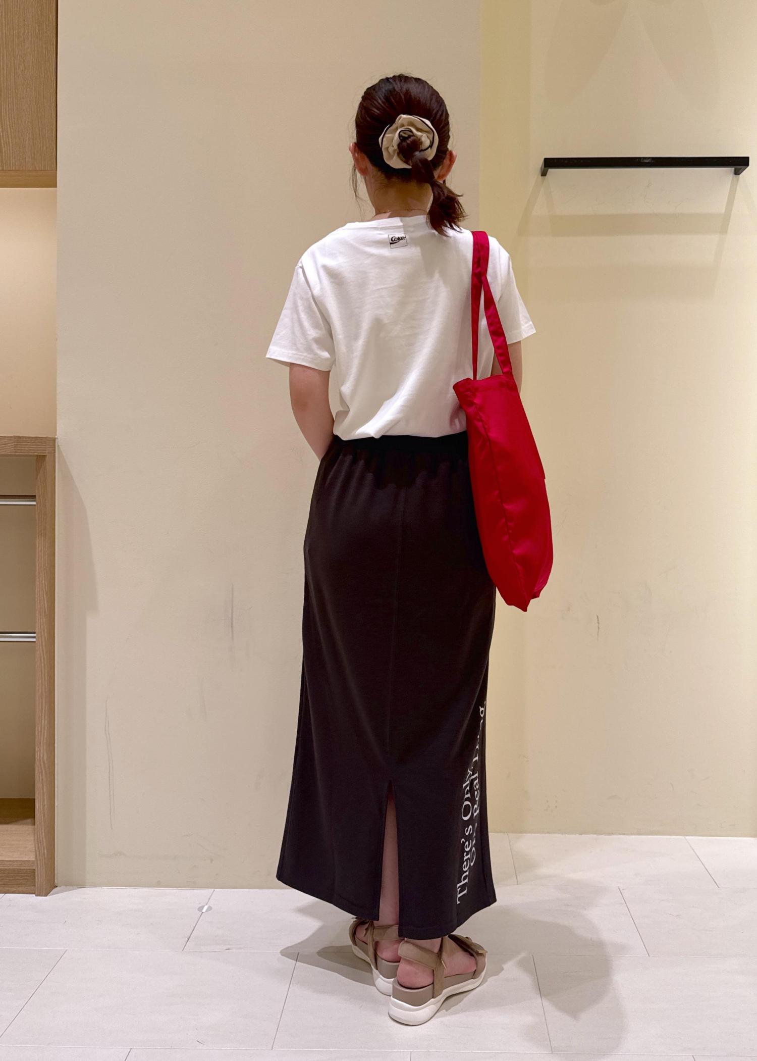 夏らしく白Tシャツを取り入れたので、スカートはチャコールにして色にメリハリをつけました。