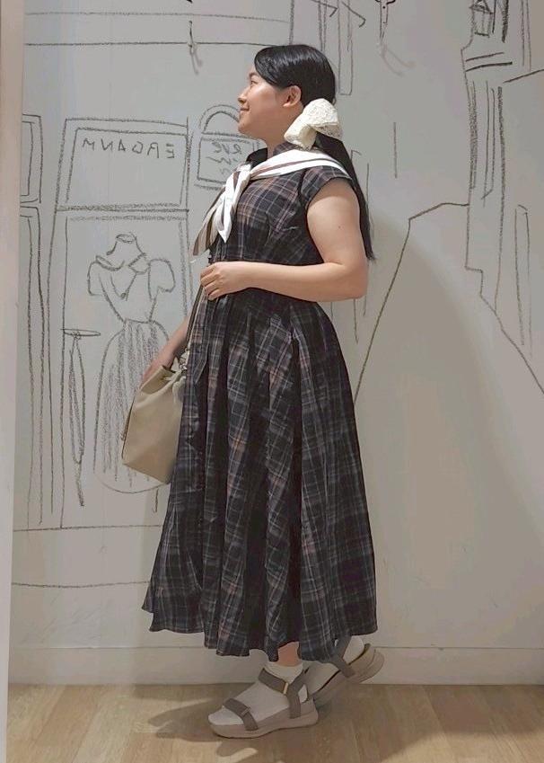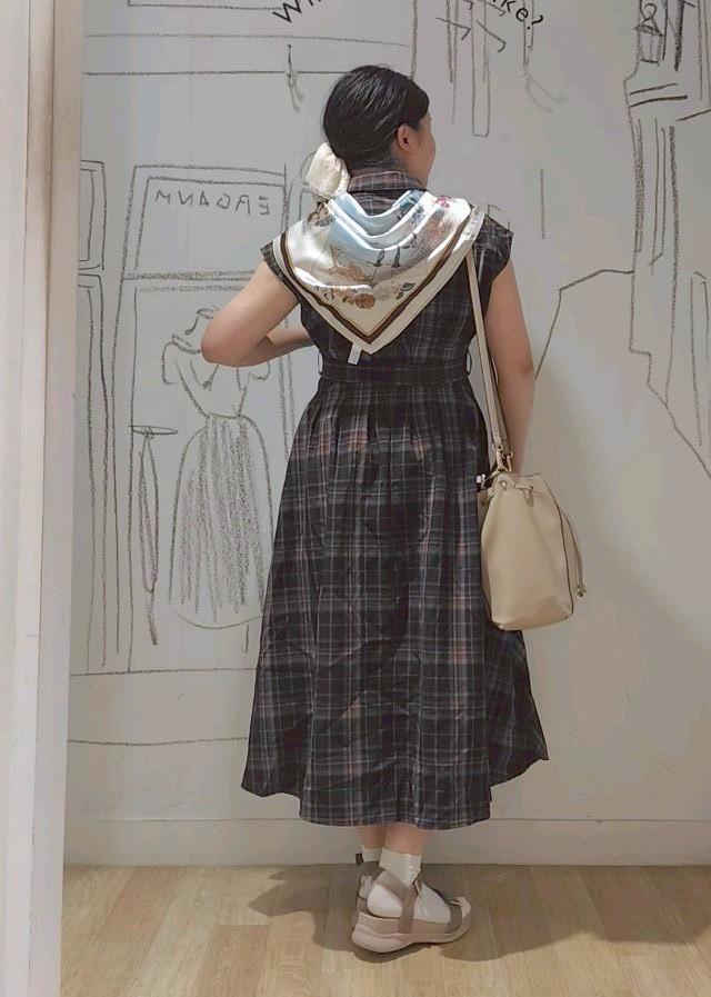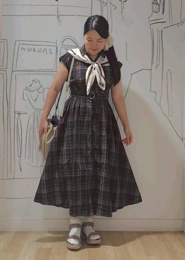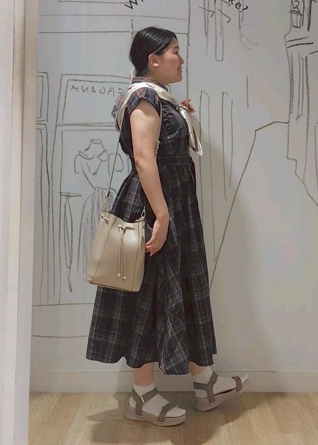 秋らしい色合いのチェック柄ワンピースに、ブラウンのアイテムを合わせてみました。
