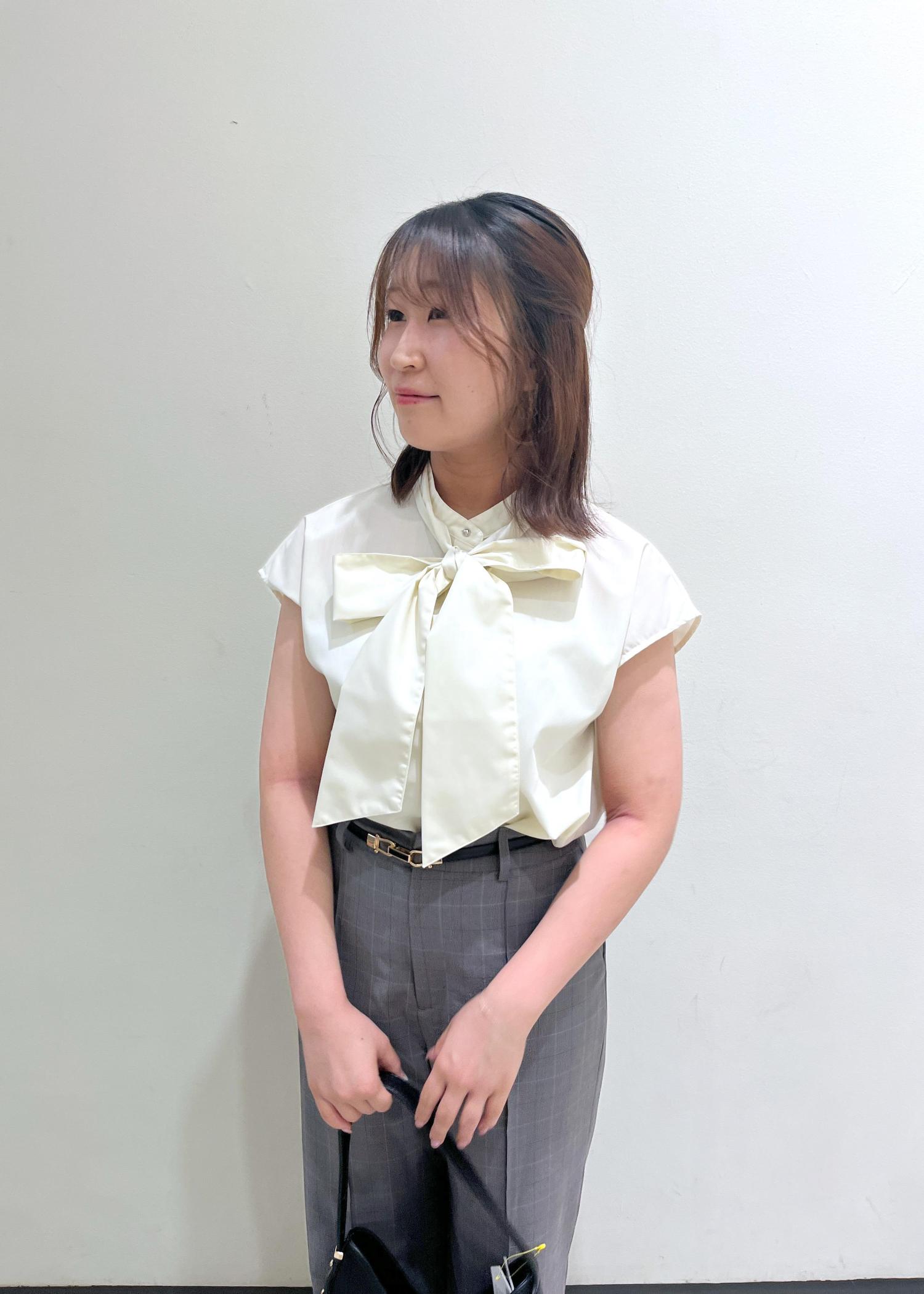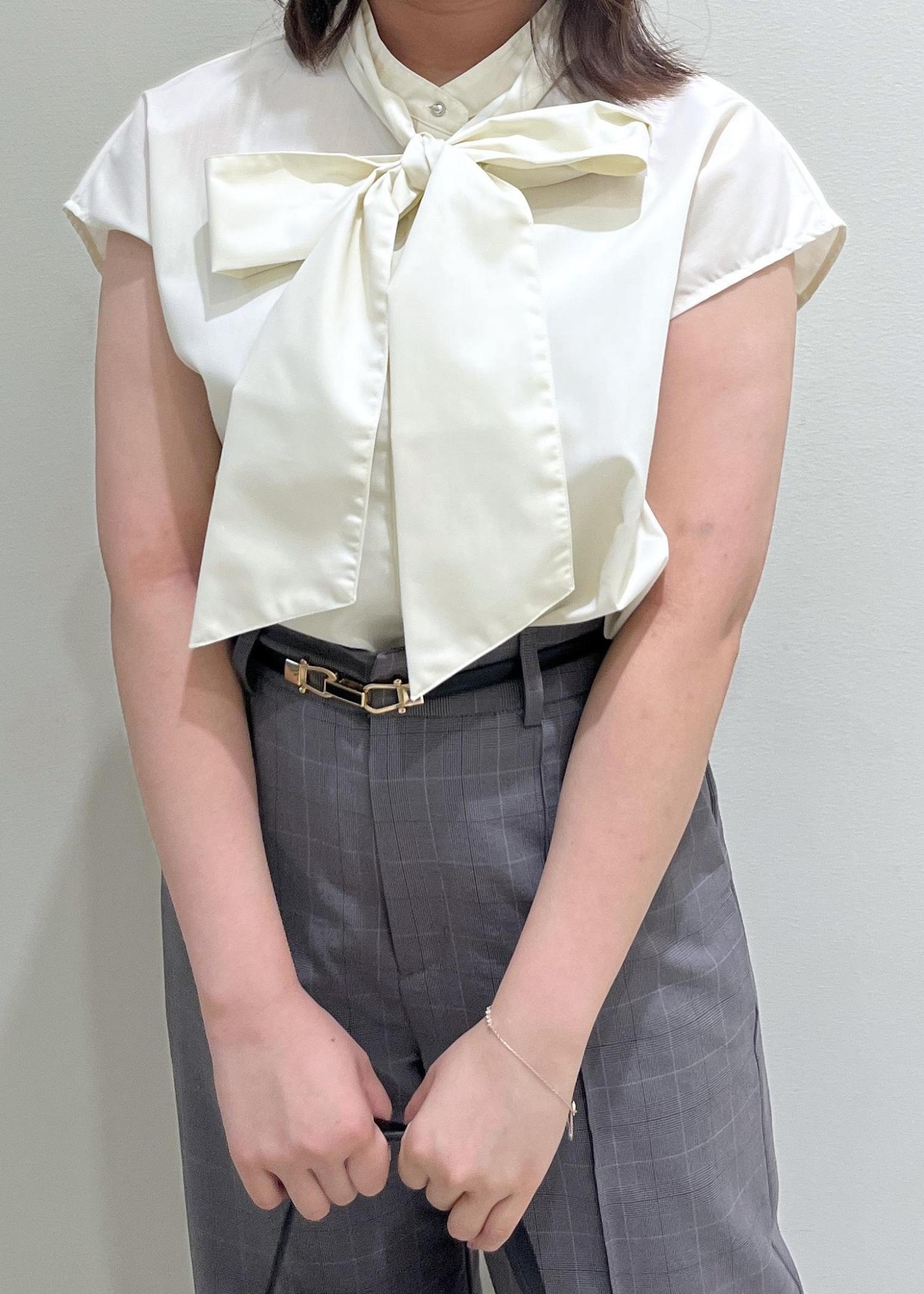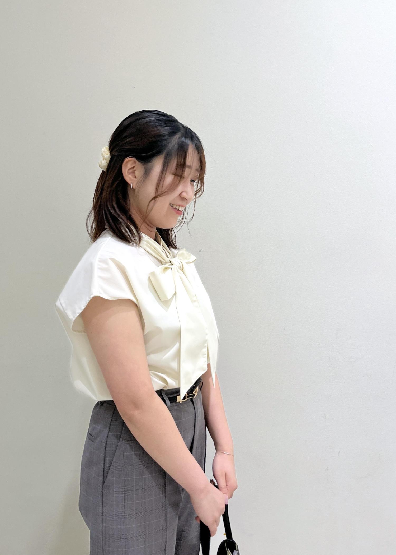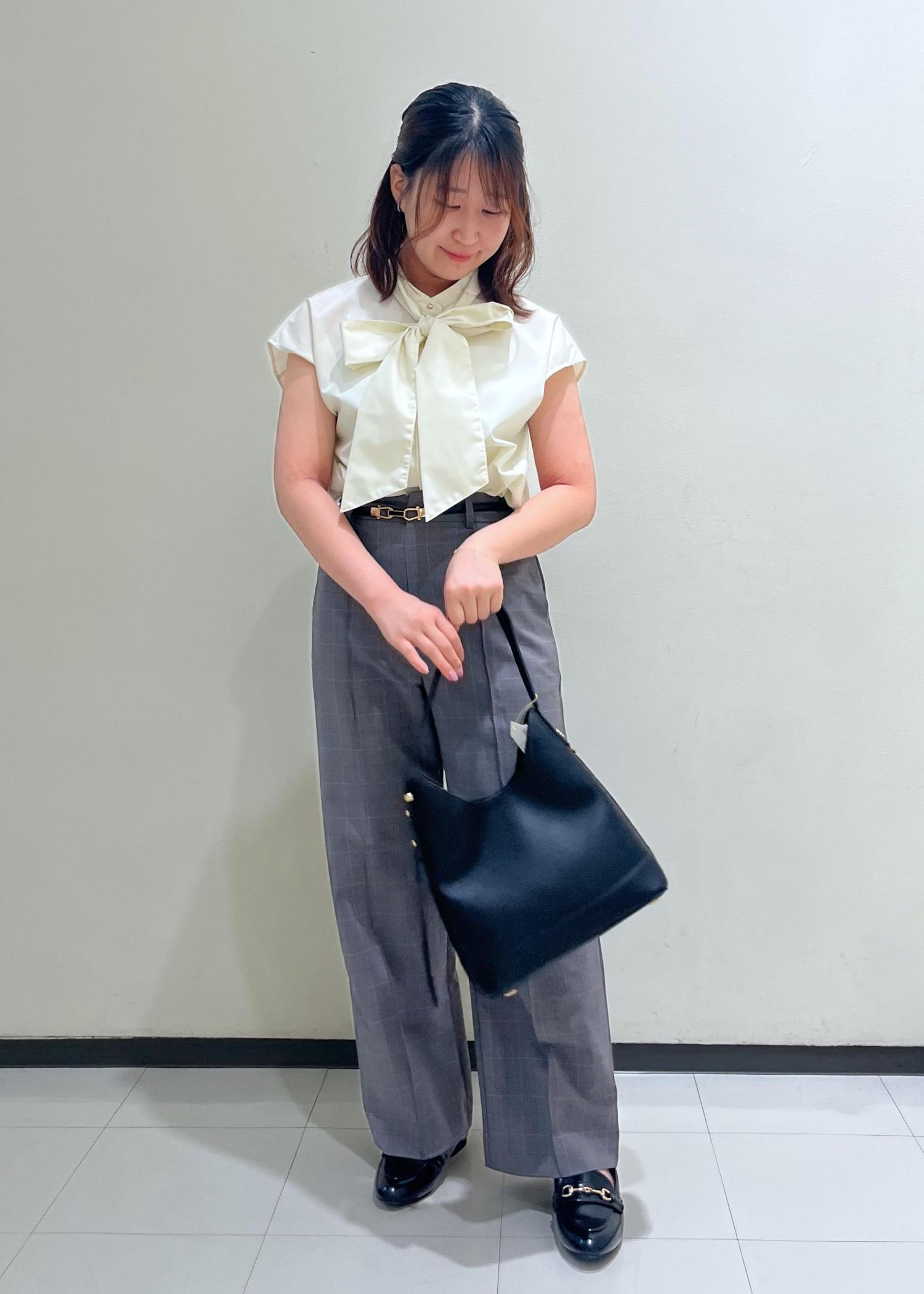 ブラウスは大きめのリボンが華やかさをプラスしつつも、全体のカラーが甘さを抑えているので可愛すぎず大人可愛い印象に仕上がります。オフィスでも、それぞれバラバラにTシャツやデニムと合わせてお出かけにも着まわせる万能アイテムです!