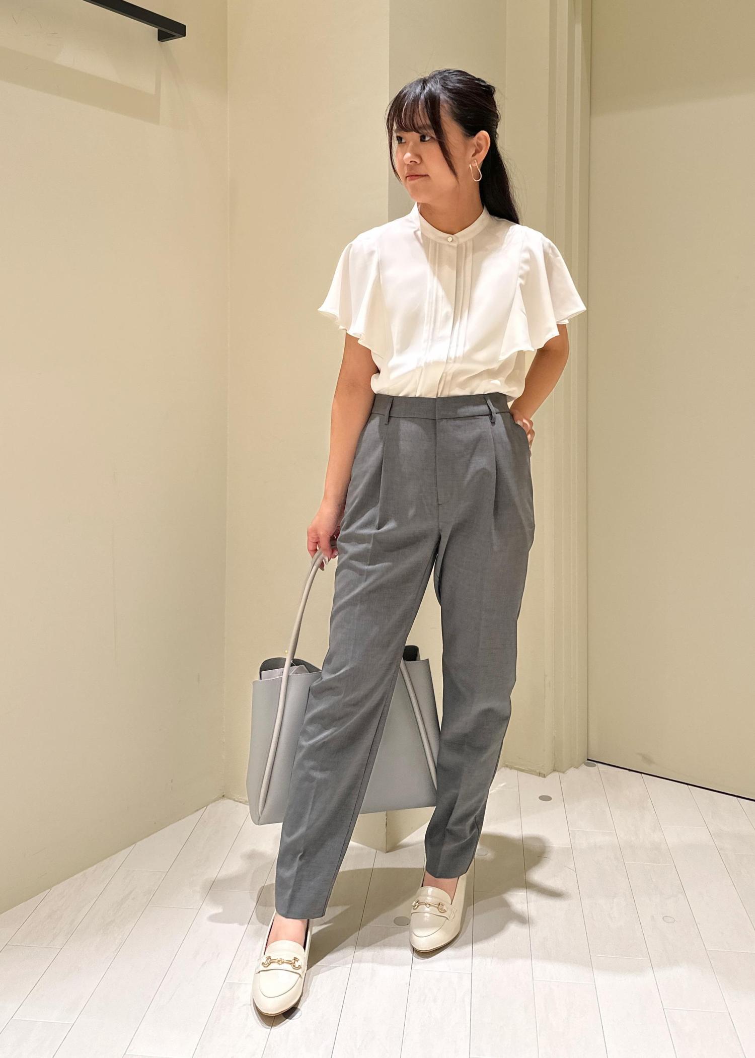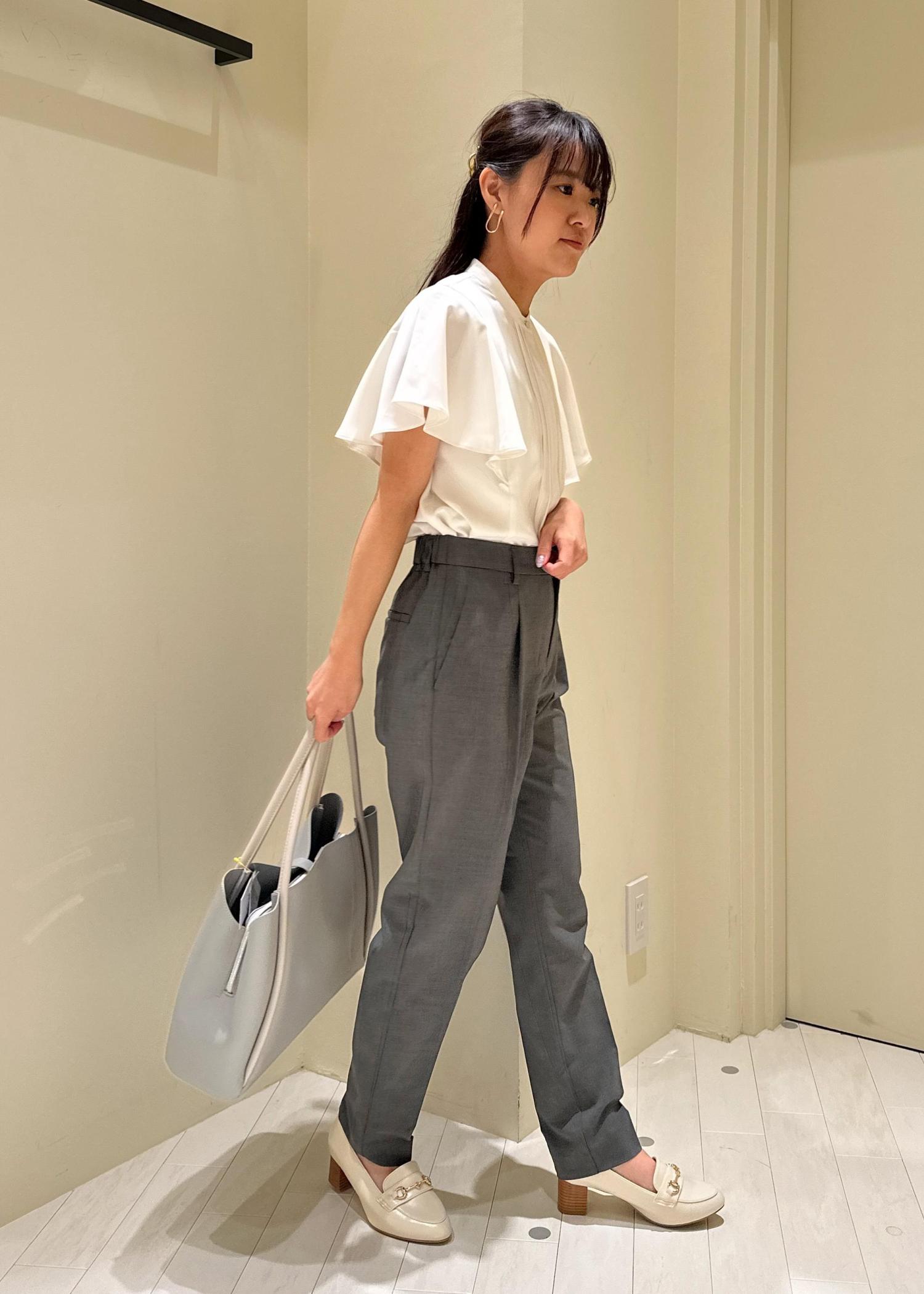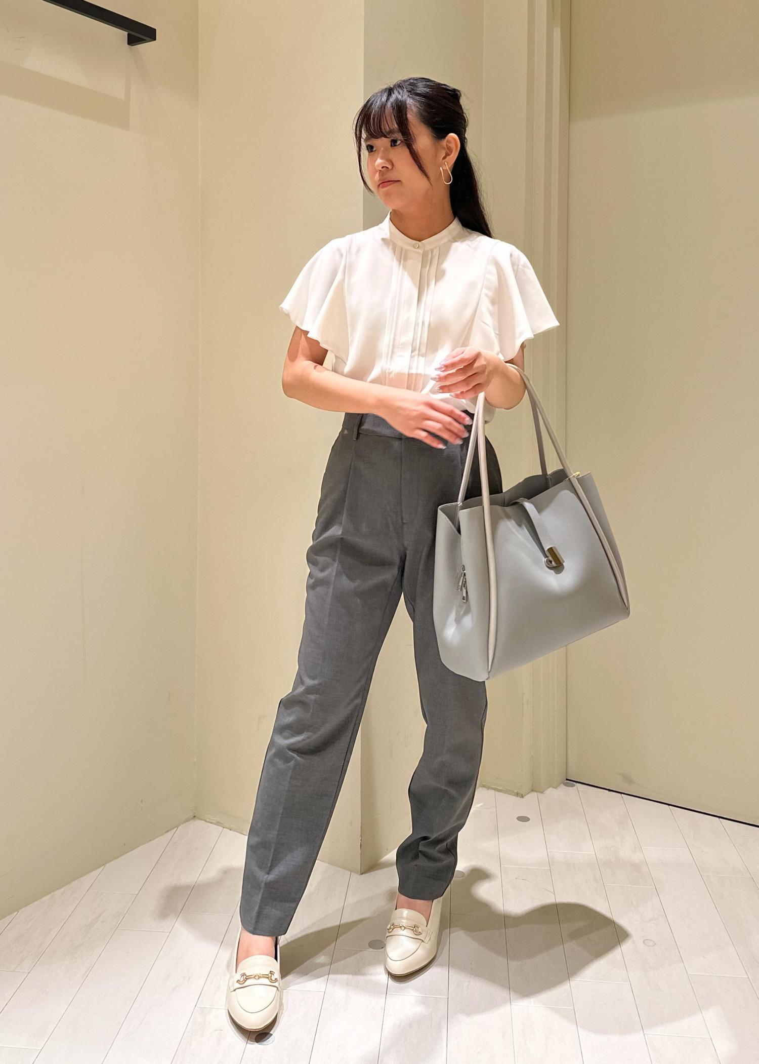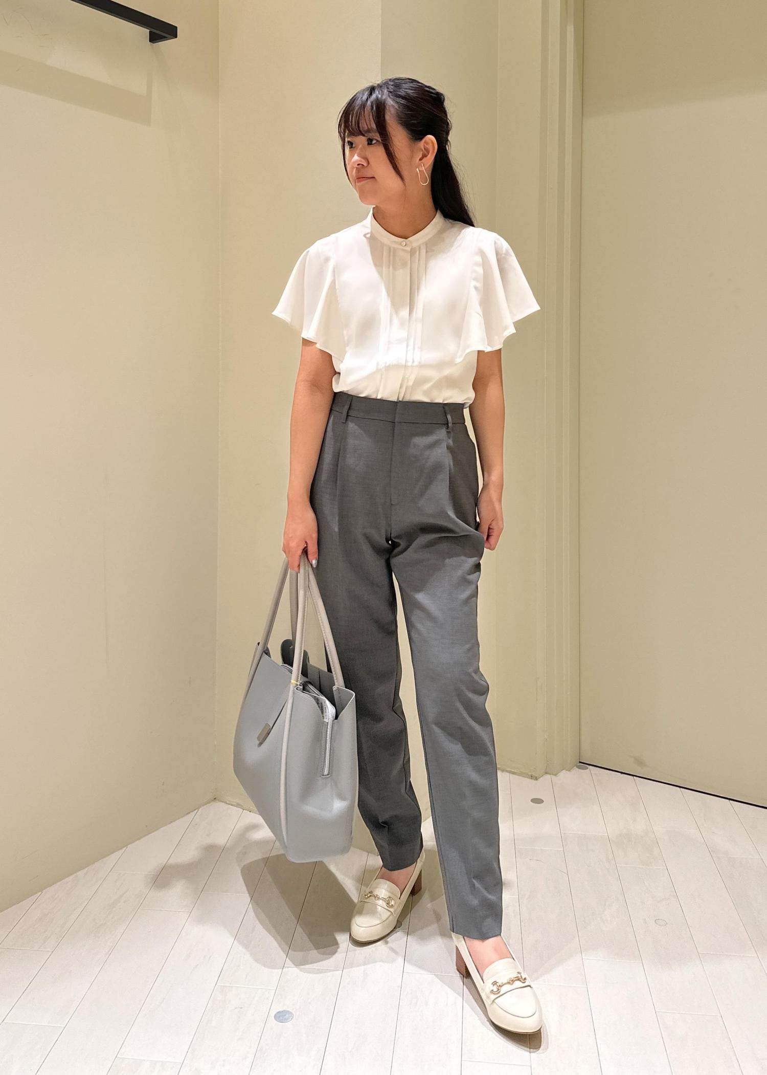 何枚あってもよい白ブラウスにグレーのパンツを合わせてみました。