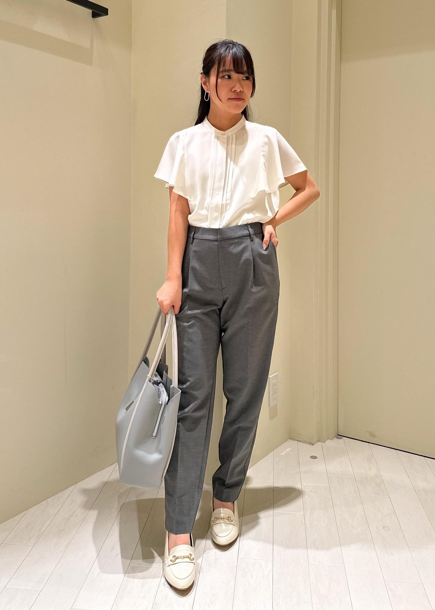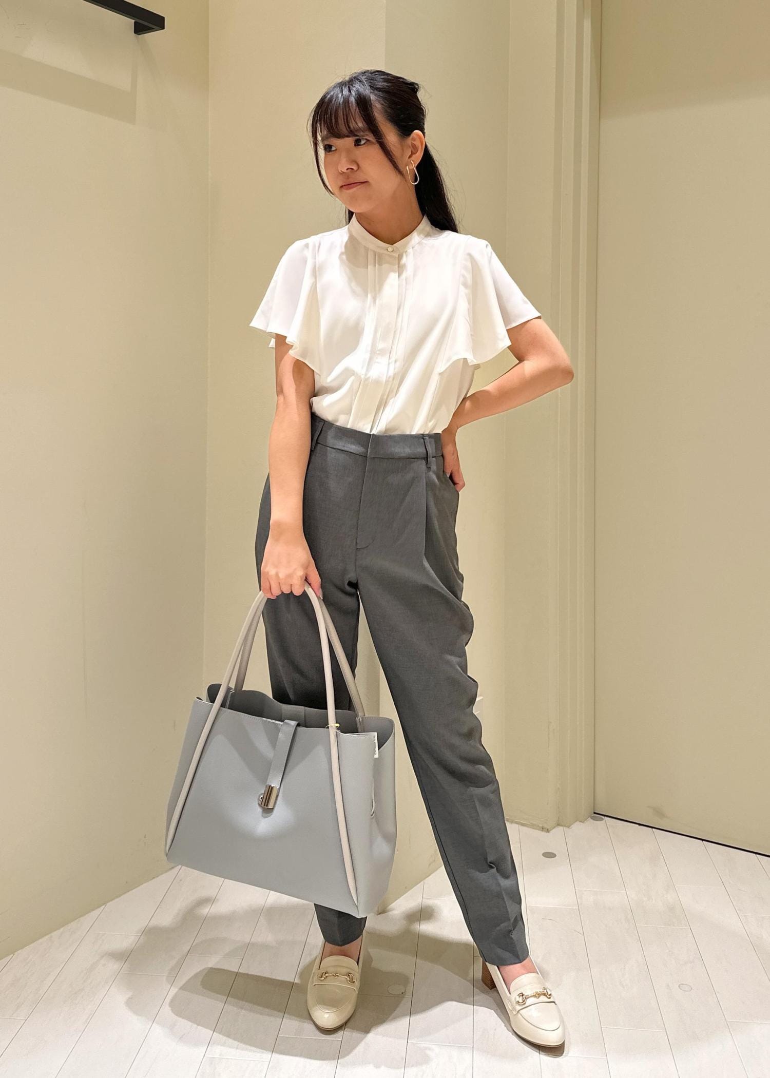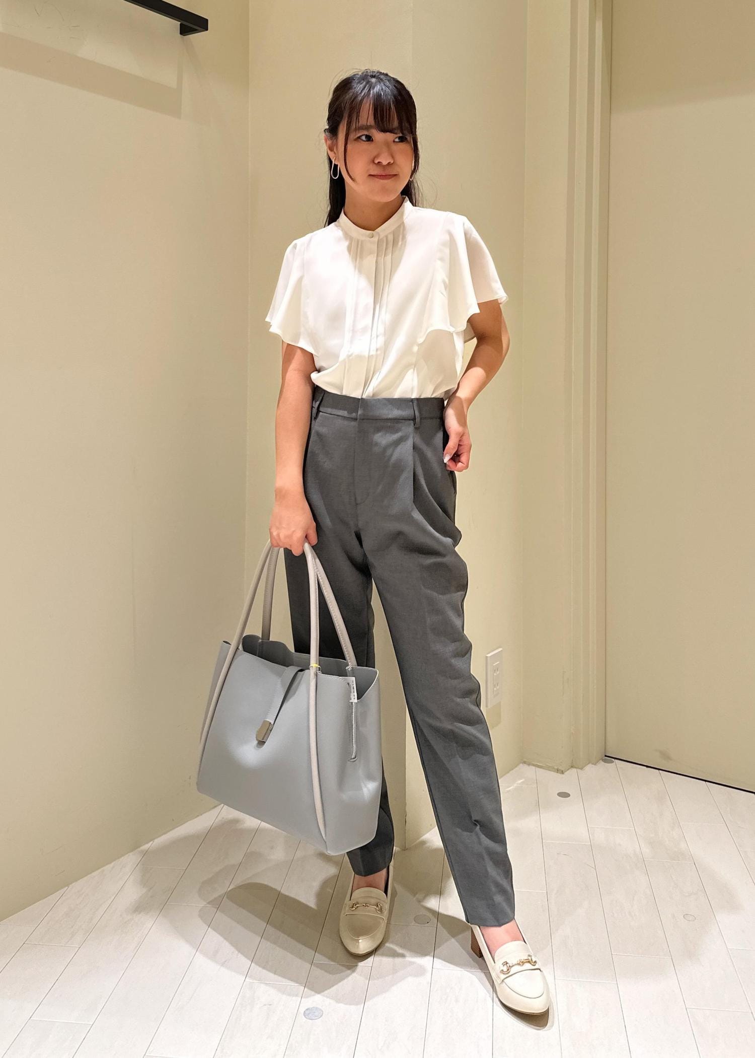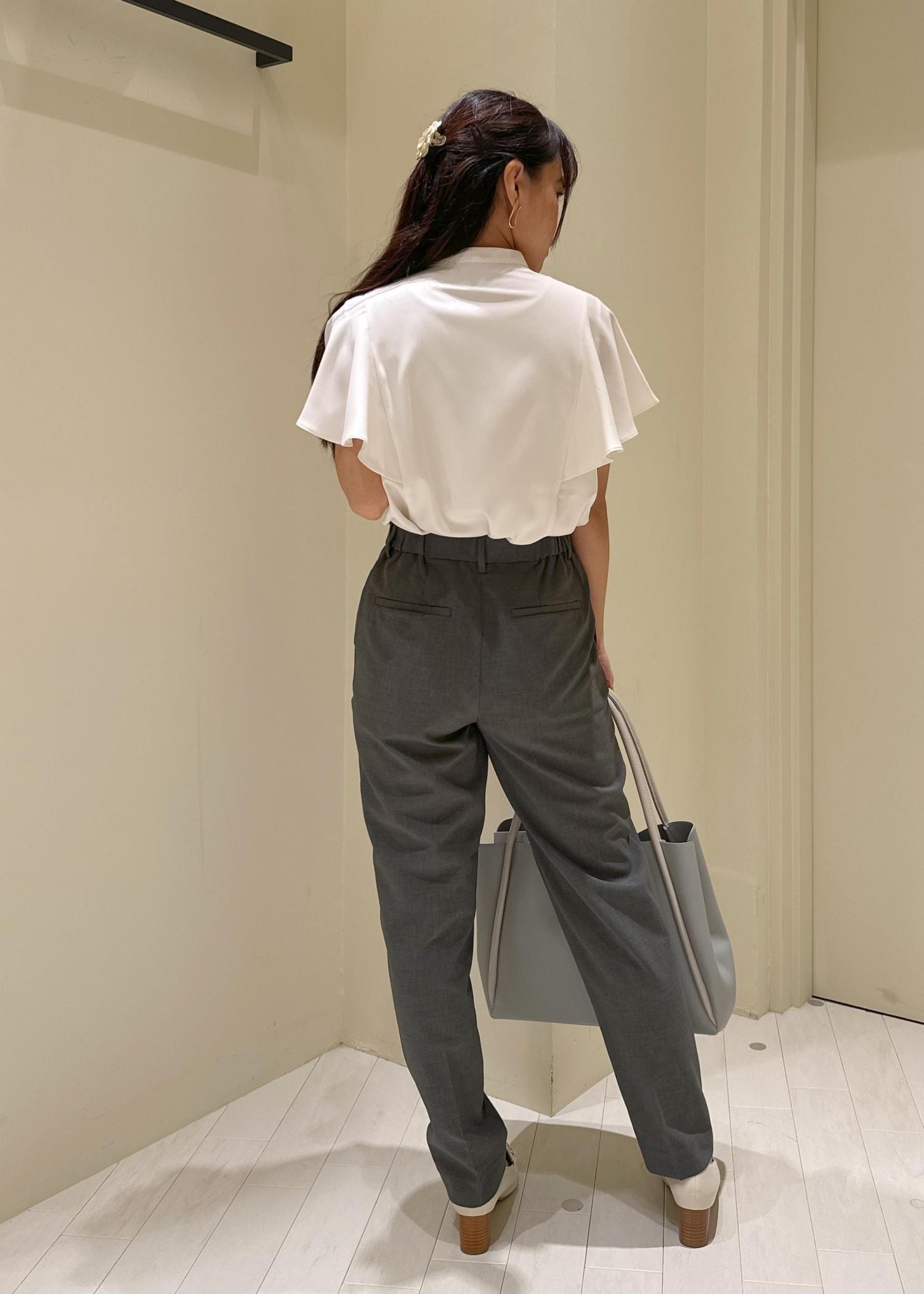何枚あってもよい白ブラウスにグレーのパンツを合わせてみました。