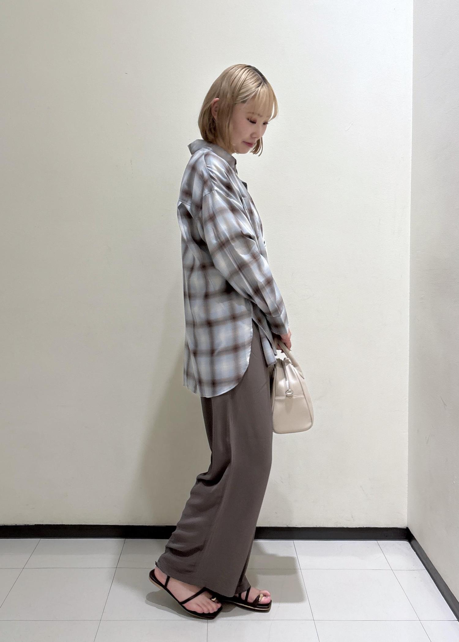 チェックシャツを羽織りカーキのパンツを取り入れ、秋を先取りしたコーディネートです。