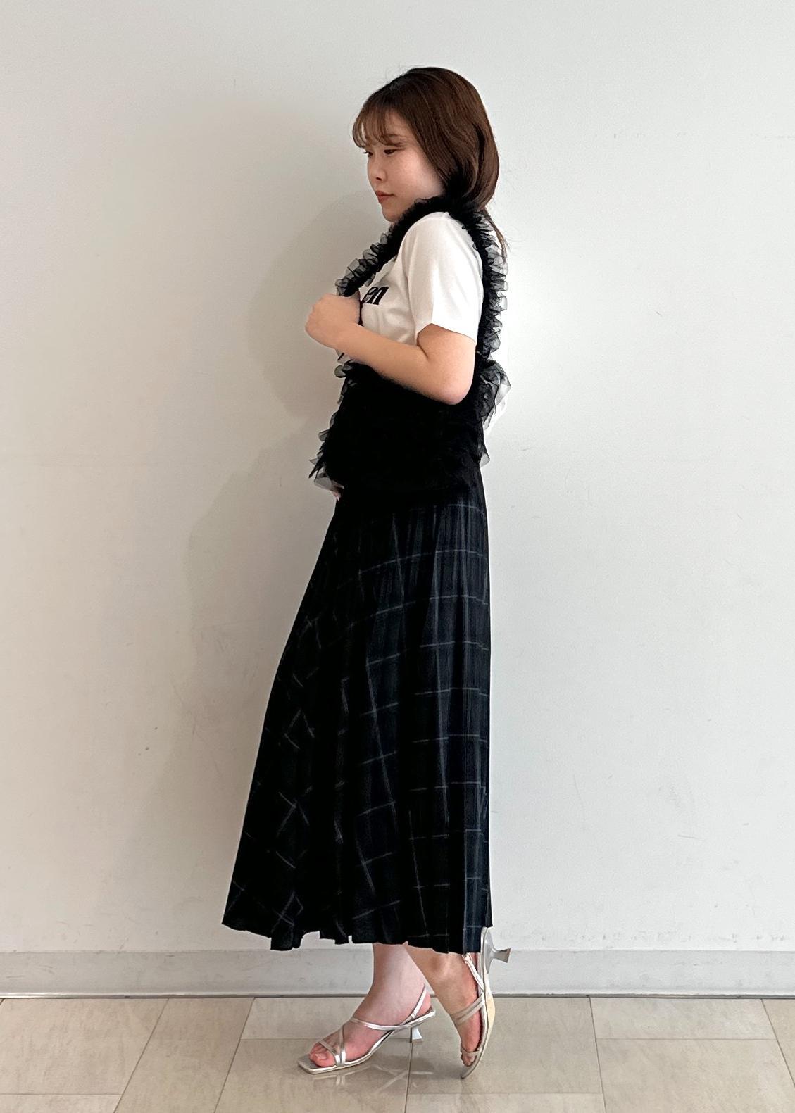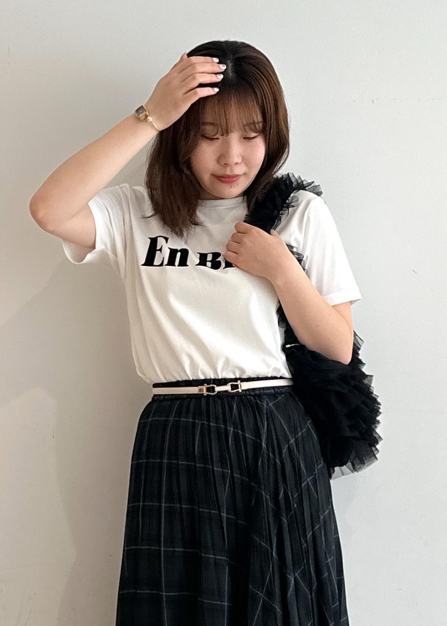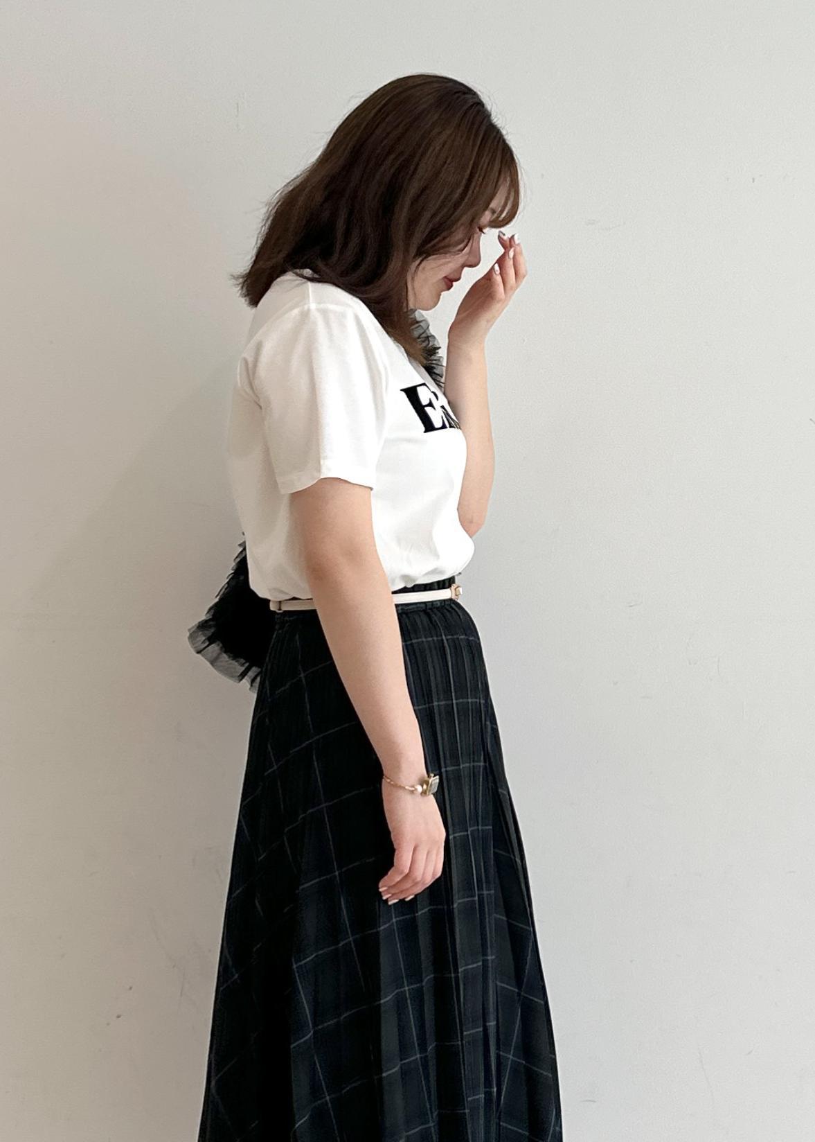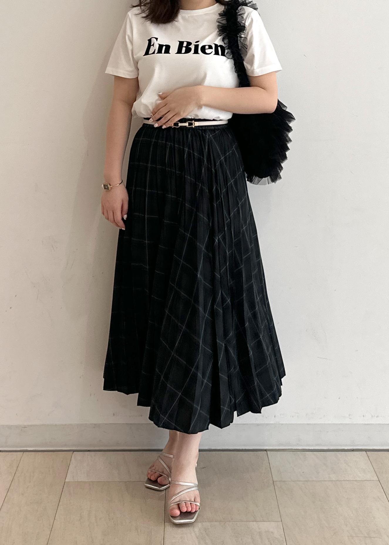 秋先取りのチェックスカートとシンプルなロゴが可愛らしい雰囲気を作ってくれて、着飾らなくてもおしゃれに見えるコーディネートです♪