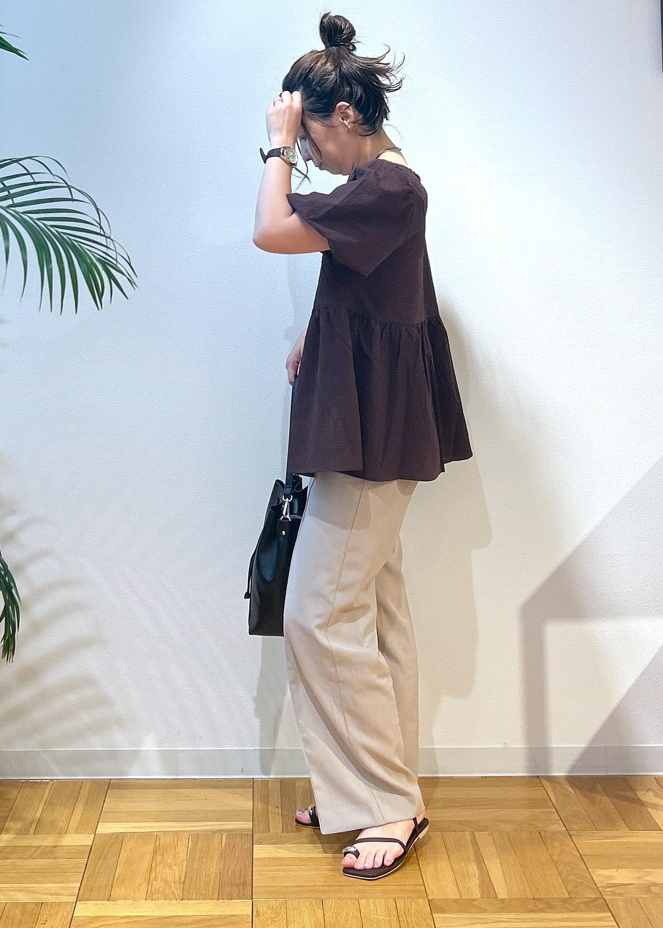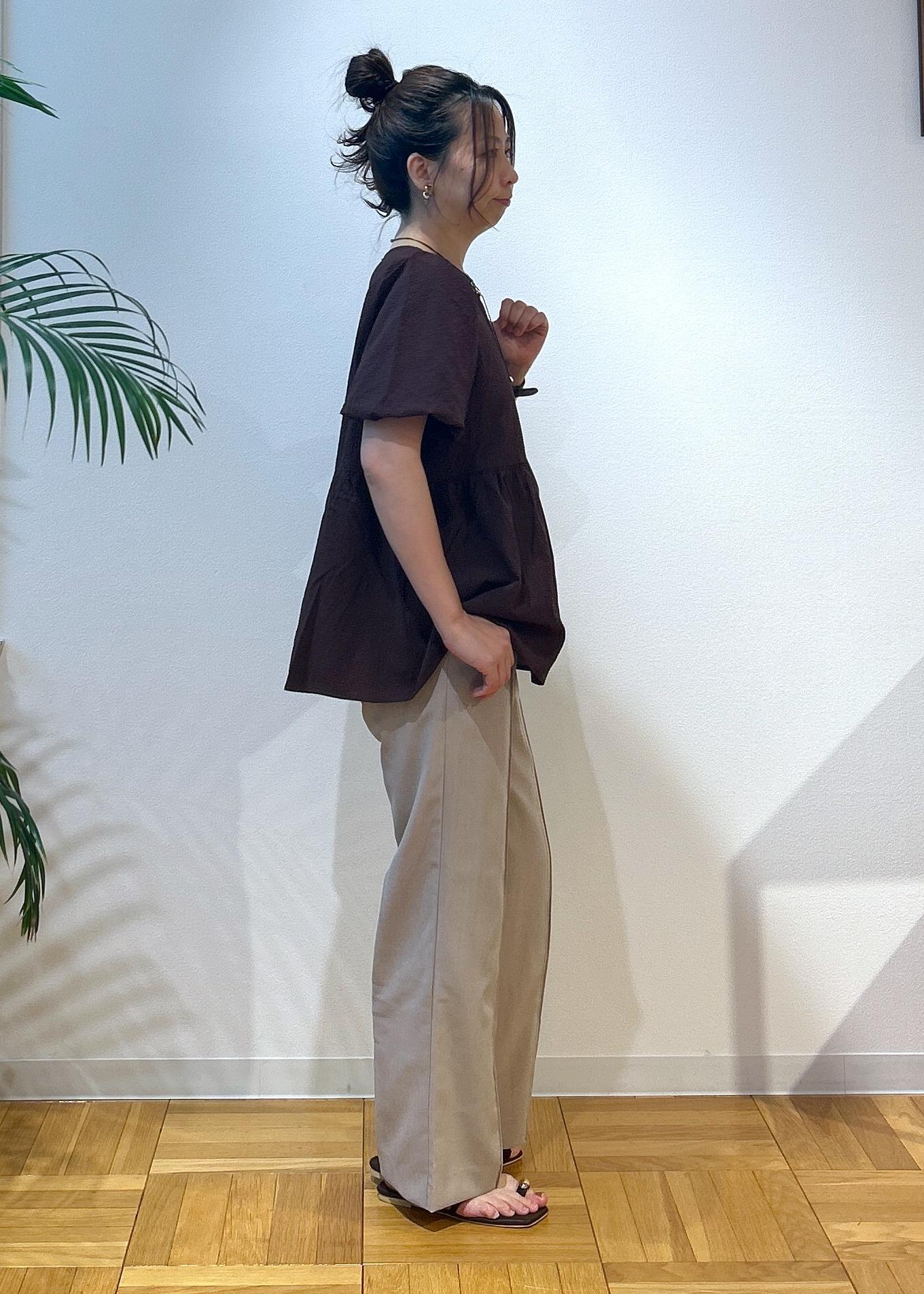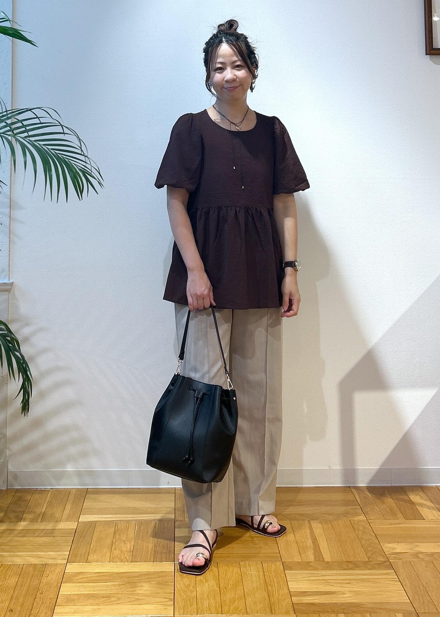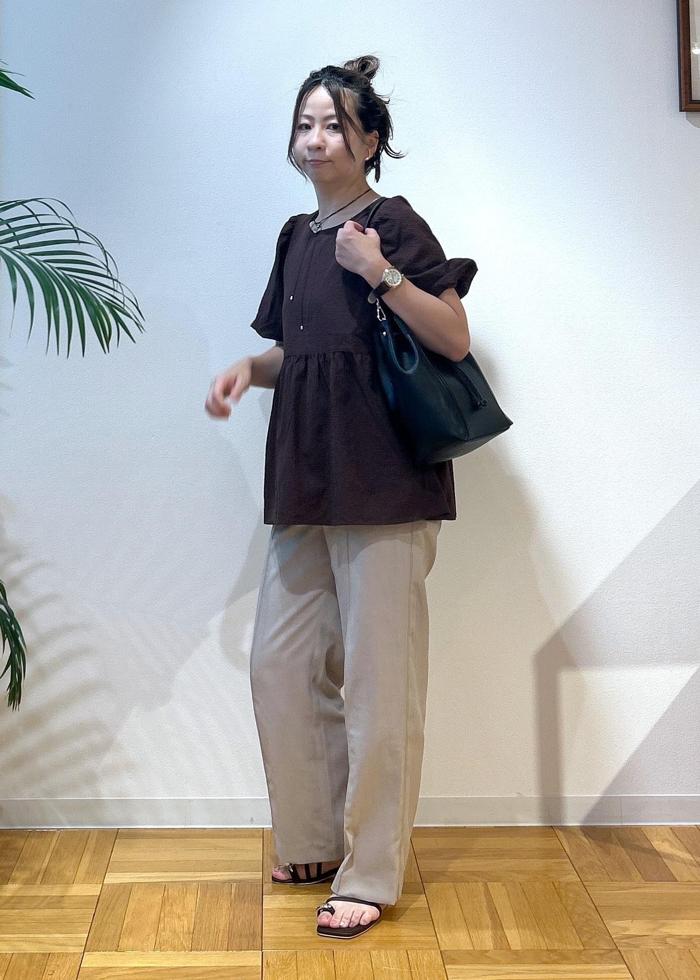 トップスの可愛いデザインをワイドパンツで合わせることで大人可愛いに仕上げました。カラーもブラウンとベージュでまとめることで落ち着いた雰囲気にしてみました。